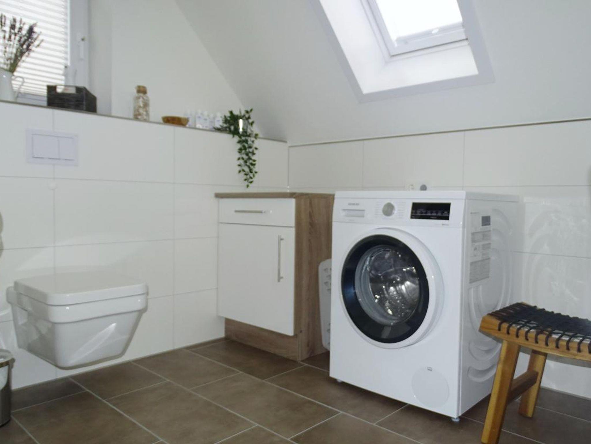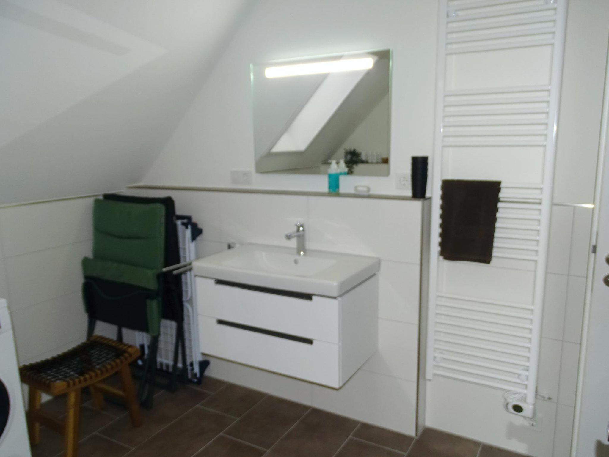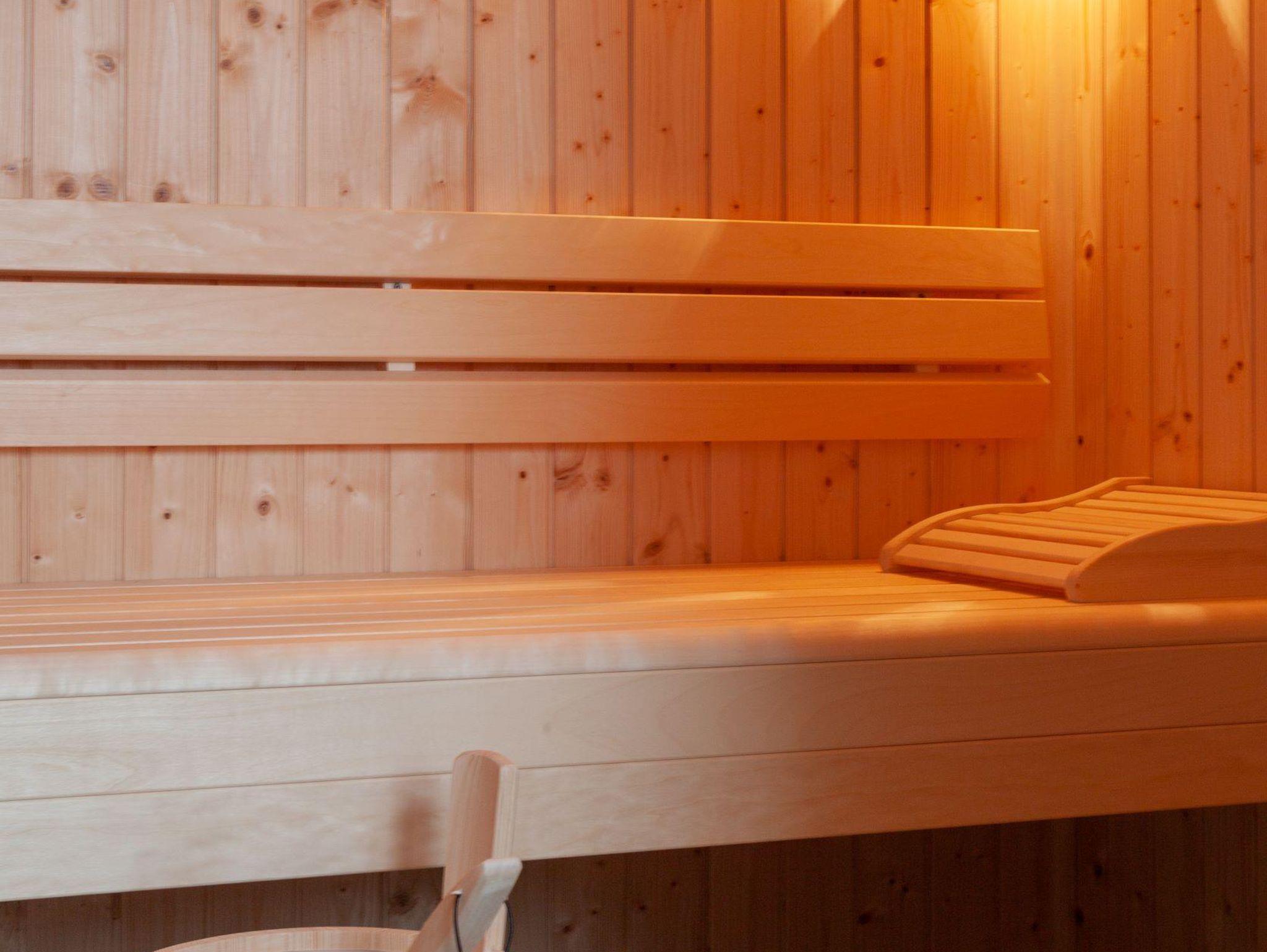 Duschbad/WC/Sauna Zeit nehmen und Wohlfühlen. Ausstattung: Bodenebener Duschbereich mit Glaspendeltür. Sauna in Holzausführung mit Saunaofen, Ganzglastür, Sitzbank, Hocker, Kommode, Waschmaschine.