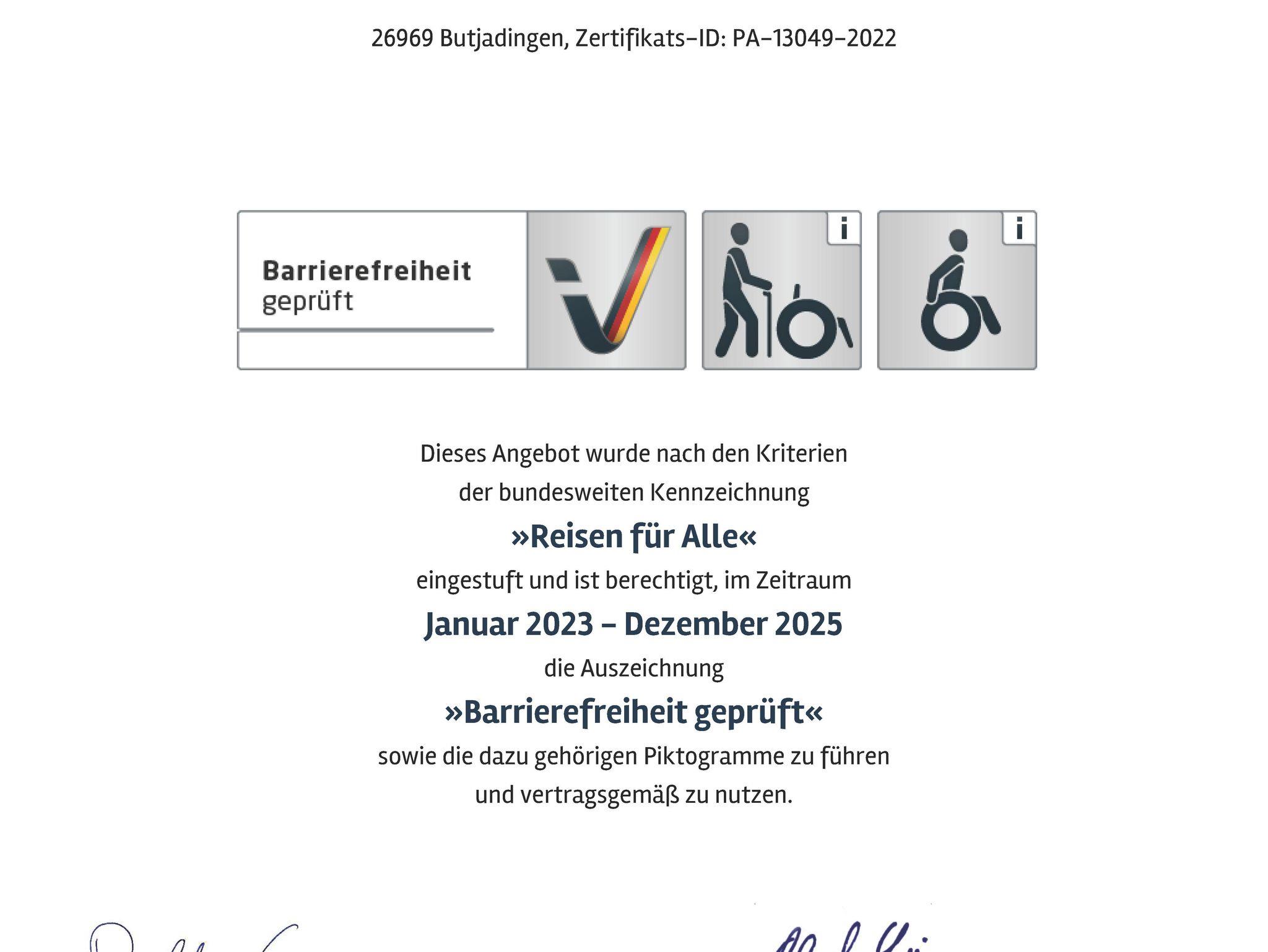Ein besonderes Plus für unsere jüngeren wie älteren Gäste und Personen mit körperlicher Beeinträchtigung: Wir sind barierefrei und behindertengerecht - aktuell testiert von REISEN FÜR ALLE. Du kannst also die Nutz- und Erlebbarkeit von DOMIZIL AM SIEL anhand verlässlicher Detailinformationen im Vorfeld der Reise prüfen.
