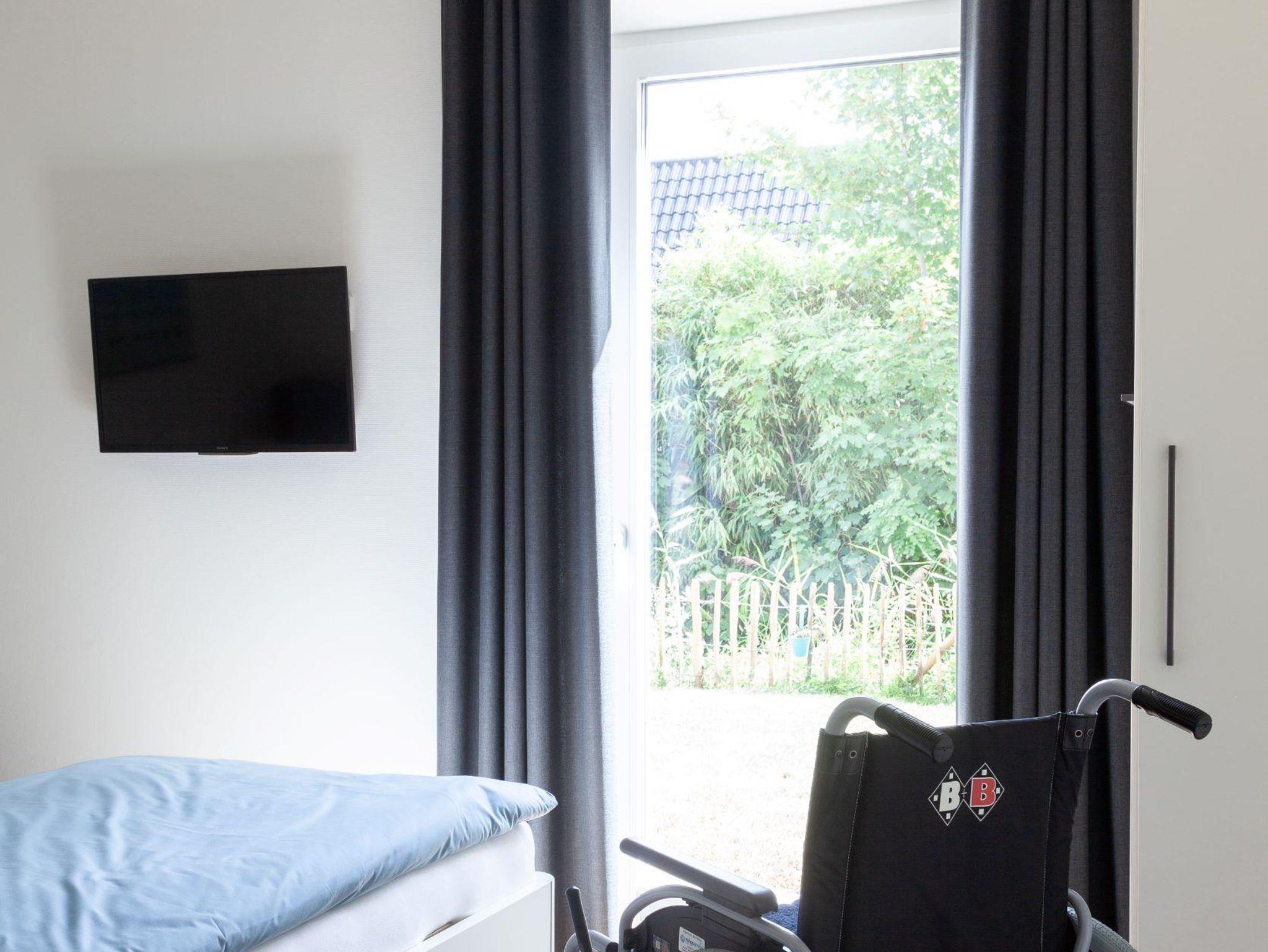 Schlafen Plus (unten) Das Parterre-Schlafzimmer bietet einen besonderen Mehrwert für unsere älteren Gäste und hilfsbedürftige Rollstuhlfahrer*Innen. Ausstattung: Bett 100x200cm mit elektr. verstellbarem Einlegerahmen, Bett 100x200cm mit verstellbarem Lattenrost, Sony 32 Zoll LED Smart TV, Mittelnachttisch, Ablage, Hochschrank, bodentiefes Fenster mit Verdunklungsplissee und Vorhänge, Stuhl, Kleiderhaken, Deckenstrahler und zwei Leselampen. Türbreite 100cm. Alarmschalter.