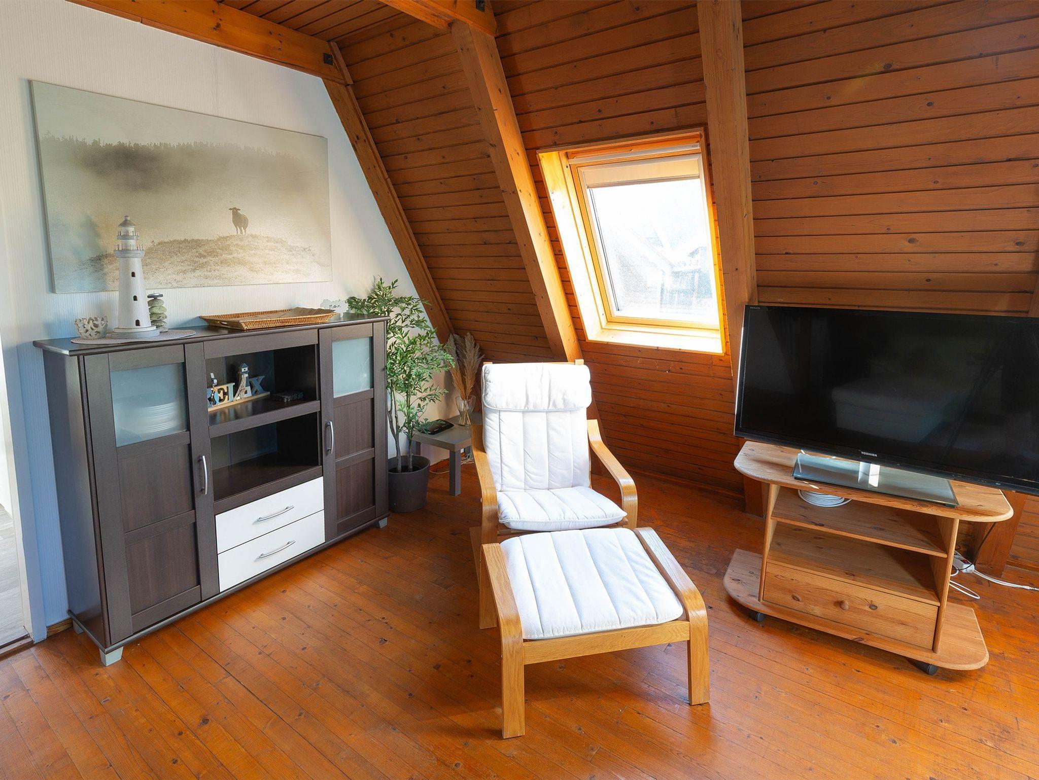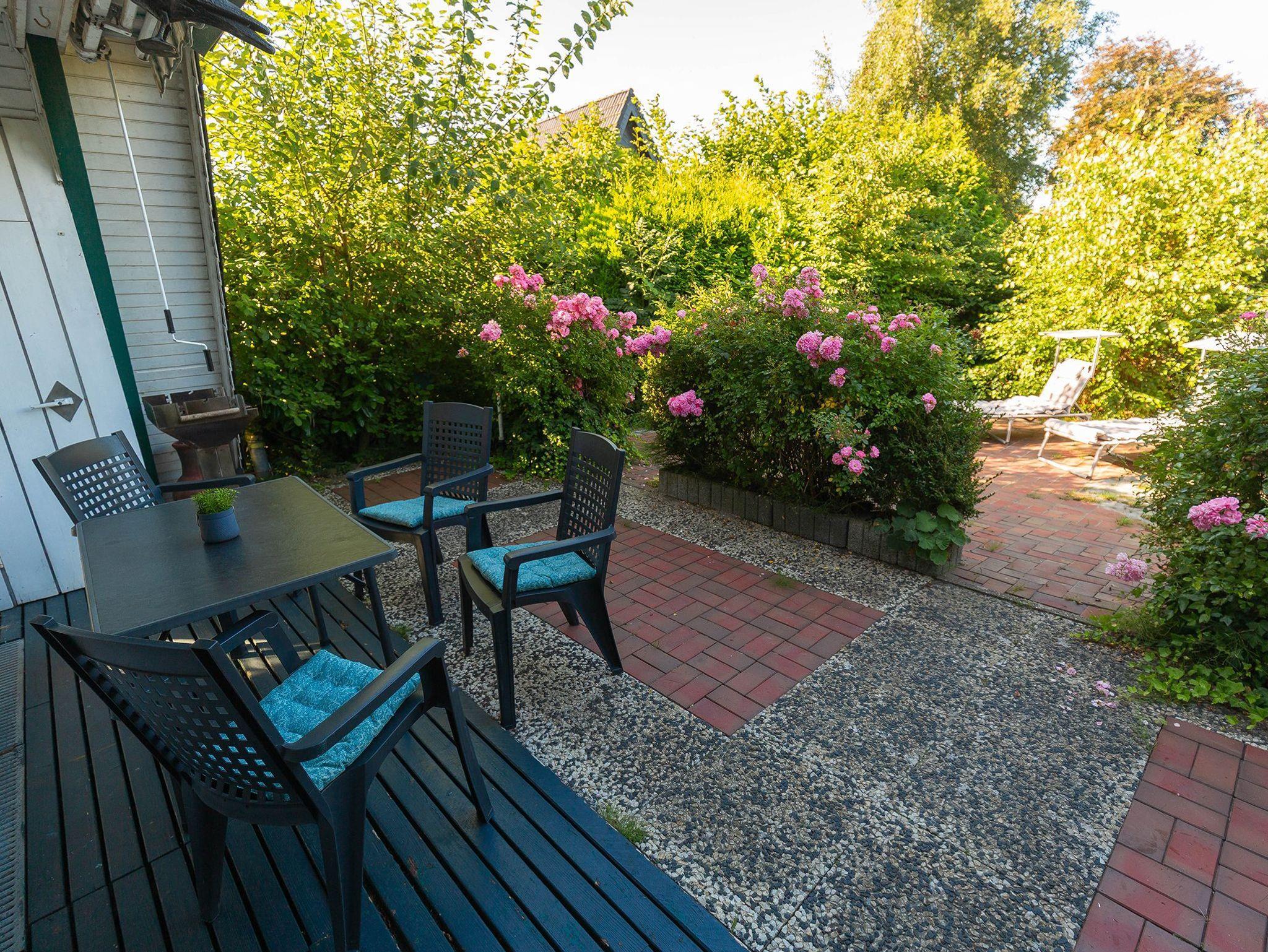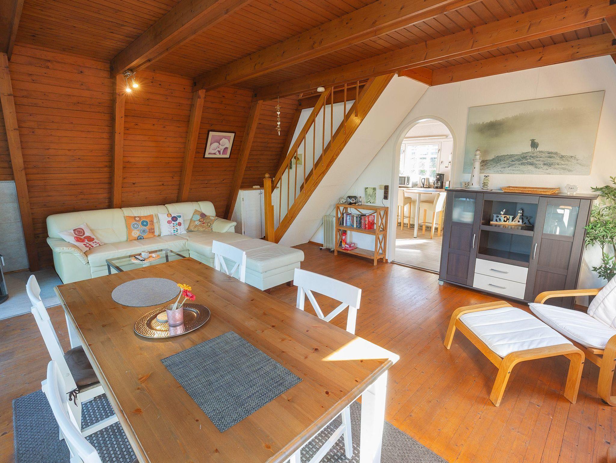 Der gemütliche Wohn-, Koch- und Essbereich ist behaglich eingerichtet. Wir bieten eine DSL-50-Leitung. Eine gut ausgestattete Küchenzeile mit Bar-Essbereich erwartet Sie - alles da für´s gemütliche Frühstück oder das entspannte Kochen. Im EG liegt auch das helle Duschbad. Über eine geschlossene Holztreppe gelangen Sie zu den beiden Schlafzimmern mit Einzelbetten - in einem Schlafraum zusammengestellt zum Doppelbett - beide Räume haben reichlich Platz für Kleidung. Entspannen Sie auf der möblierten weitläufigen Terrasse mit viel Grünbewuchs.