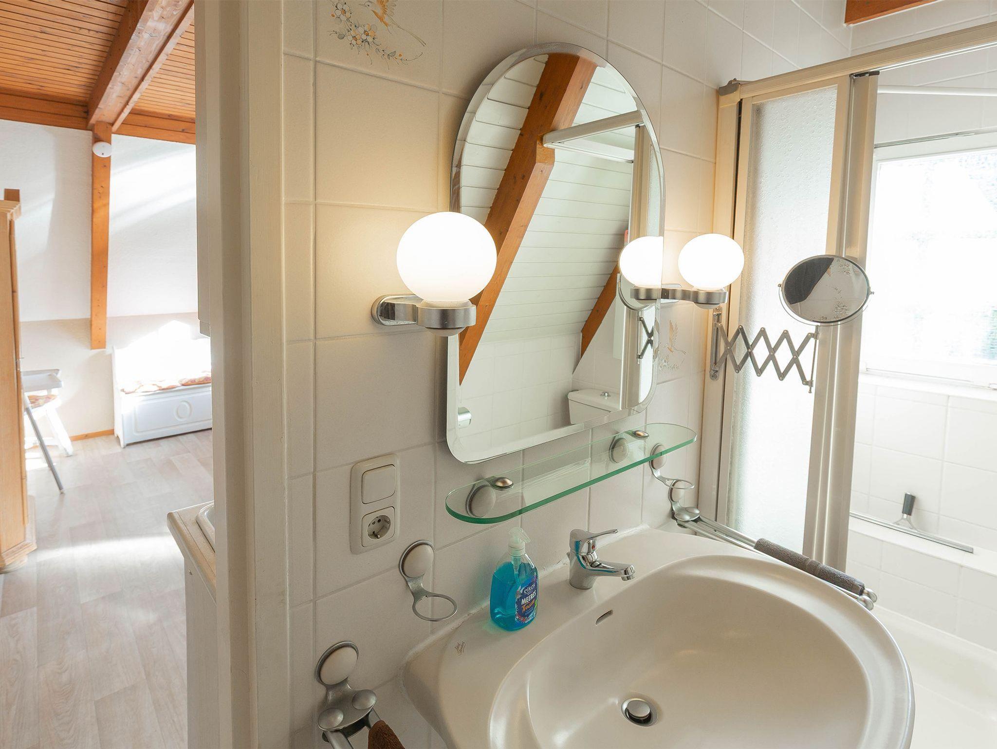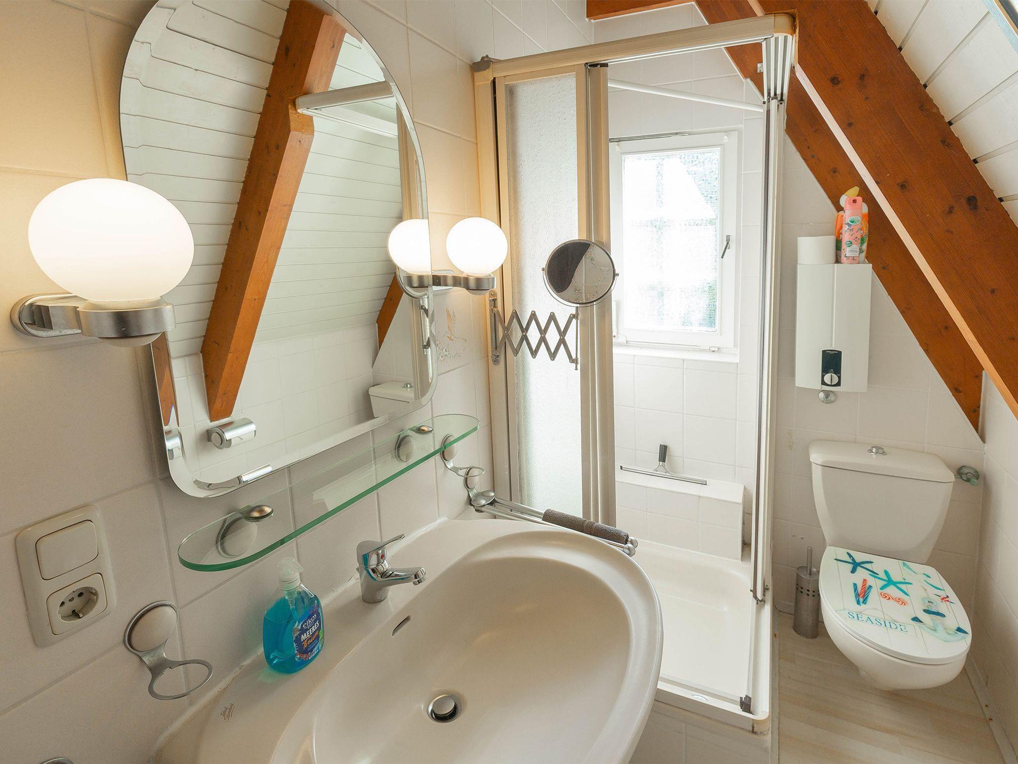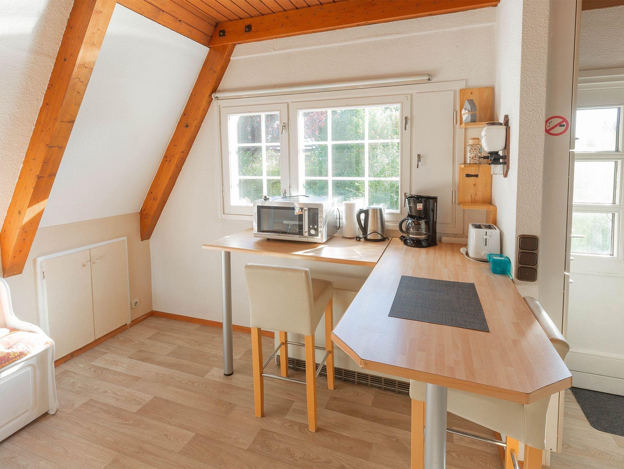 Der gemütliche Wohn-, Koch- und Essbereich ist behaglich eingerichtet. Wir bieten eine DSL-50-Leitung. Eine gut ausgestattete Küchenzeile mit Bar-Essbereich erwartet Sie - alles da für´s gemütliche Frühstück oder das entspannte Kochen. Im EG liegt auch das helle Duschbad. Über eine geschlossene Holztreppe gelangen Sie zu den beiden Schlafzimmern mit Einzelbetten - in einem Schlafraum zusammengestellt zum Doppelbett - beide Räume haben reichlich Platz für Kleidung. Entspannen Sie auf der möblierten weitläufigen Terrasse mit viel Grünbewuchs.