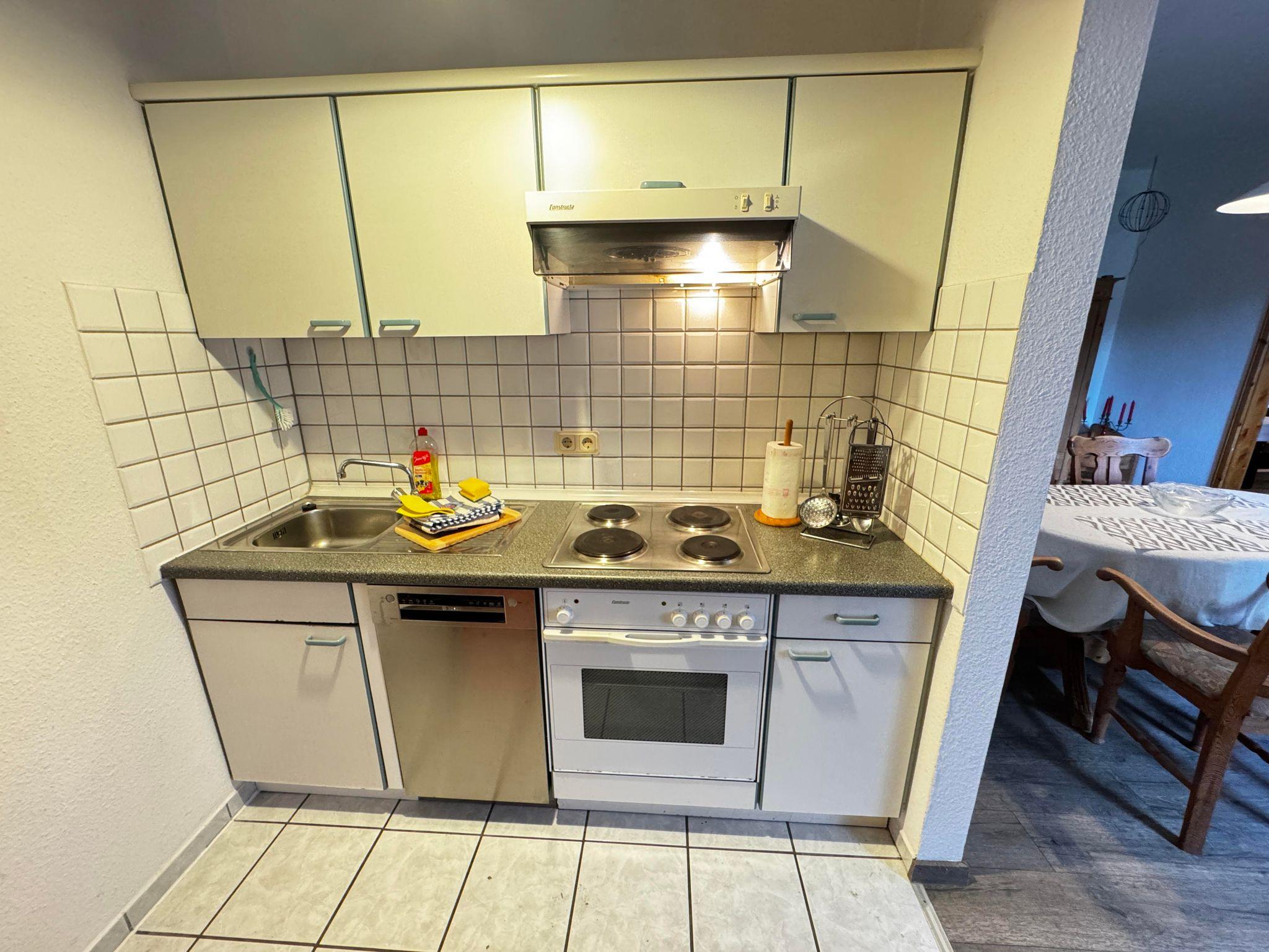Im hellen Wohnbereich erwarten Sie ein Sofa, Sessel, Sat-TV, Radio und kostenfreies WLAN – perfekt zum Entspannen nach einem erlebnisreichen Tag an der Nordsee. Die angrenzende Wohnküche ist vollständig ausgestattet und verfügt über Geschirr, Spülmaschine, Backofen-Herd-Kombination, Kaffeemaschine, Wasserkocher und Mikrowelle.