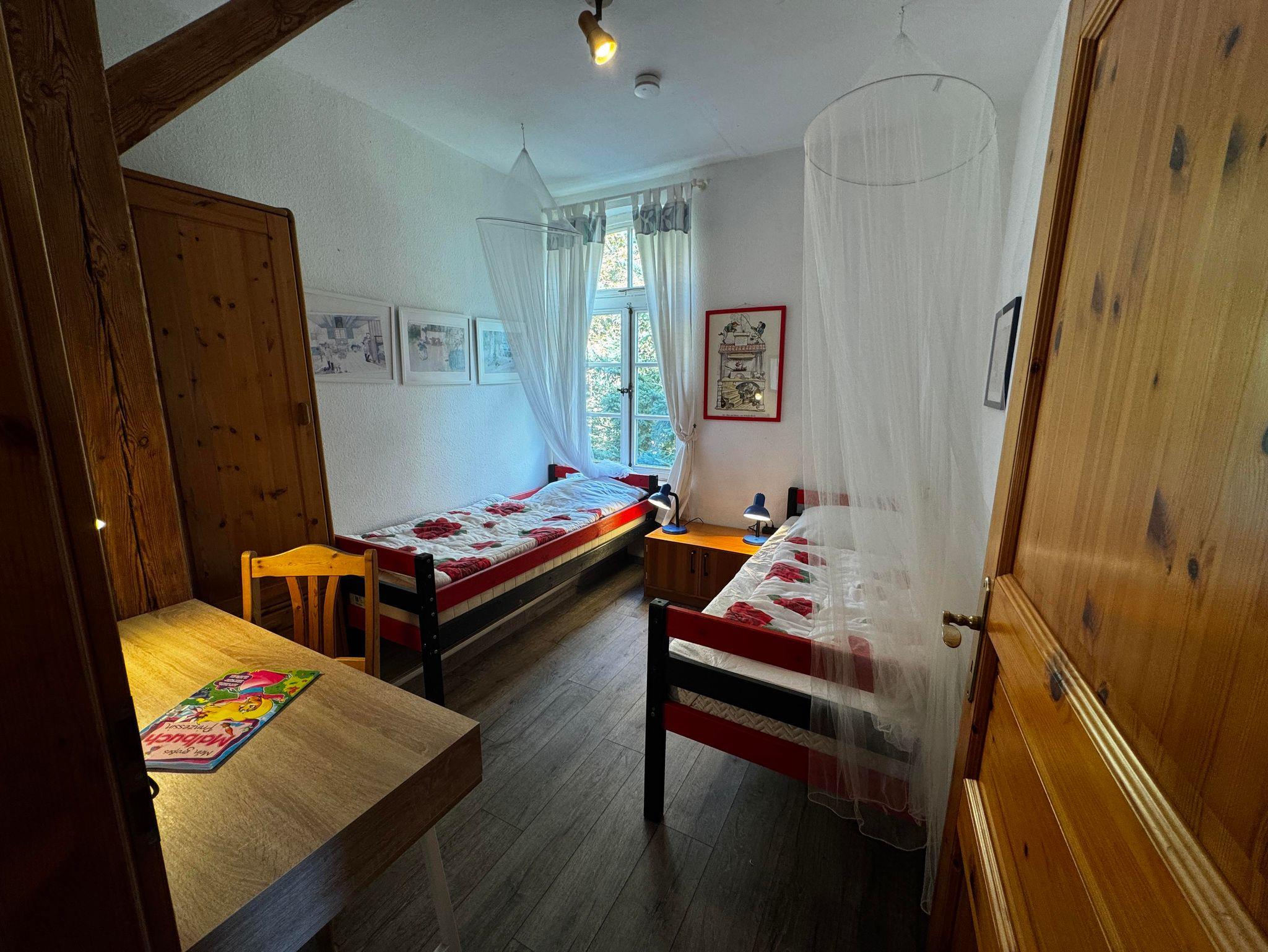 Die Wohnung verfügt über zwei gemütliche Schlafzimmer: Das Elternschlafzimmer ist mit einem komfortablen Doppelbett (1,80 m Breite) und Kleiderschrank ausgestattet, während das Kinderzimmer zwei Einzelbetten sowie Spielzeug zum Entdecken und Spielen bereithält. Bettwäsche ist selbstverständlich inklusive.