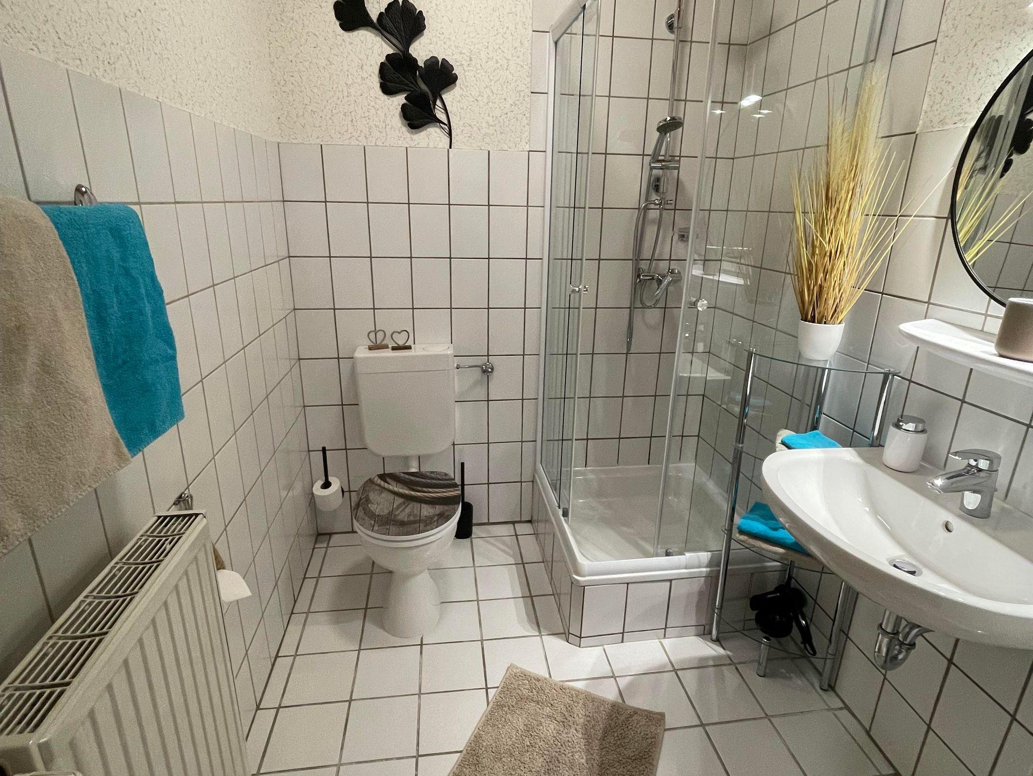 Das Duschbad ist mit einer Echtglasdusche, Spiegel und einem Föhn ebenfalls voll ausgestattet.