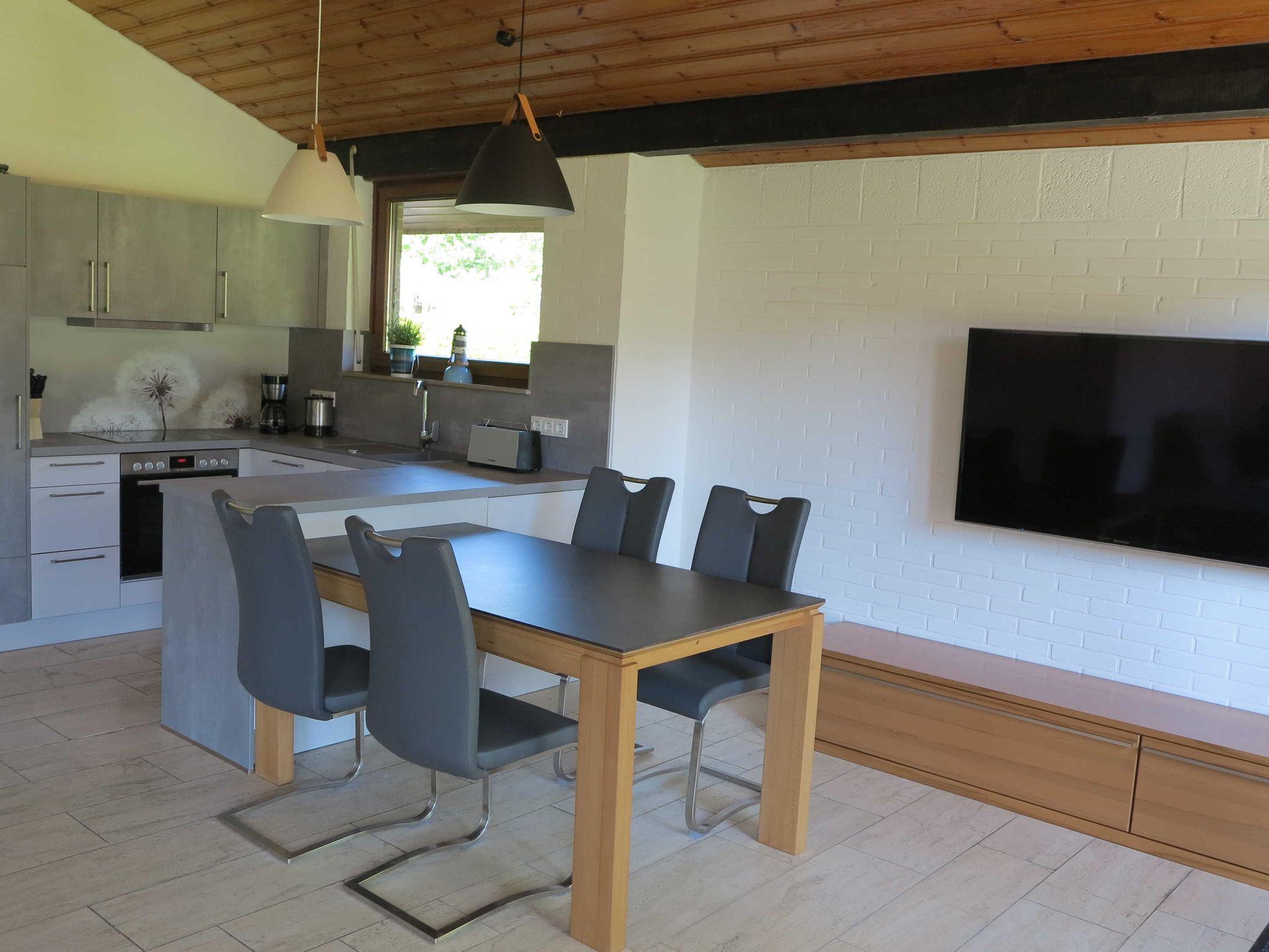 Wohnzimmer mit Sitzgarnitur, Essbereich, 48-Zoll Satelliten-TV und CD-Radio mit USB-Anschluss.