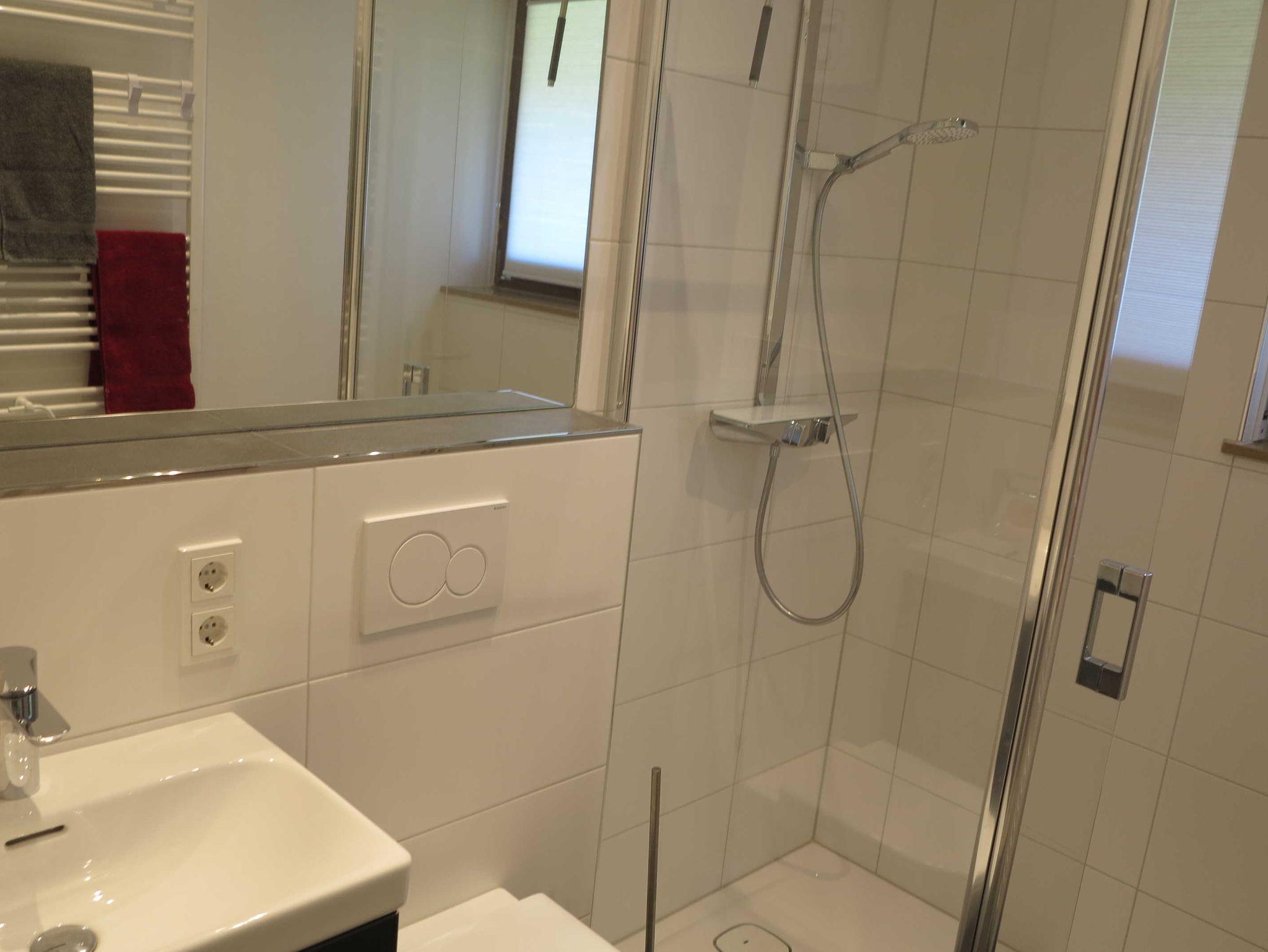 Bad mit Dusche, WC, Waschmaschine, Handtuchheizkörper