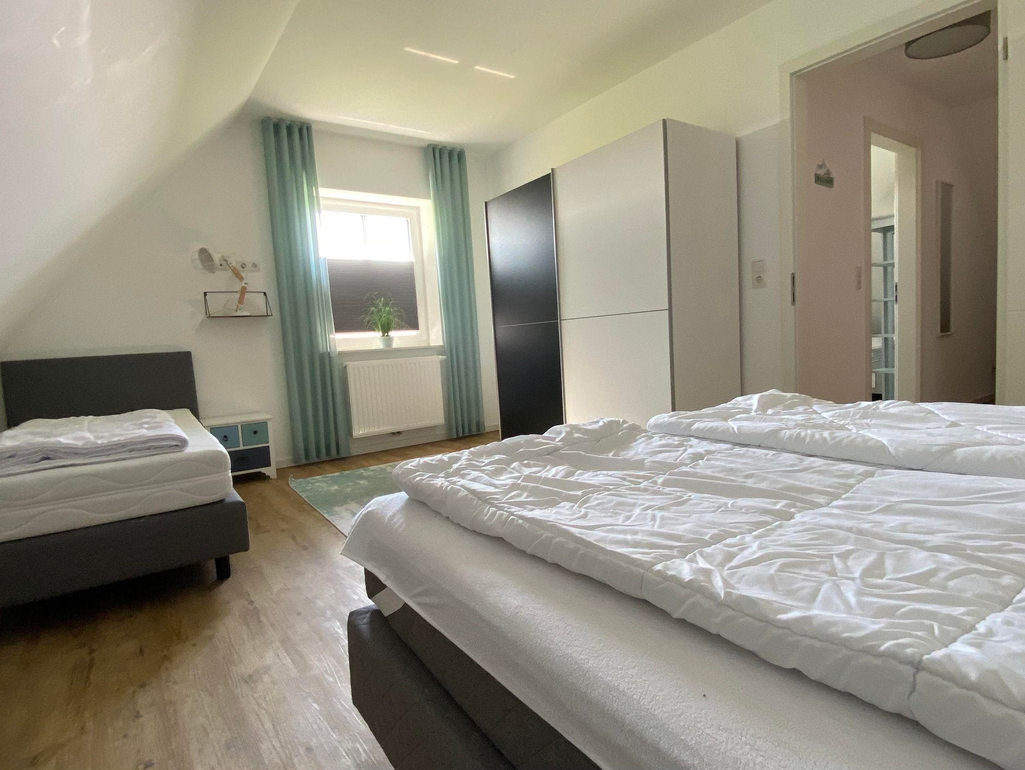 • 3 Schlafzimmer: ein Zimmer zwei Einzelbetten, zwei Zimmer mit einem Doppelbett und Zusatzbett, Bettwäsche auf Wunsch (Fenster mit Plissees)
