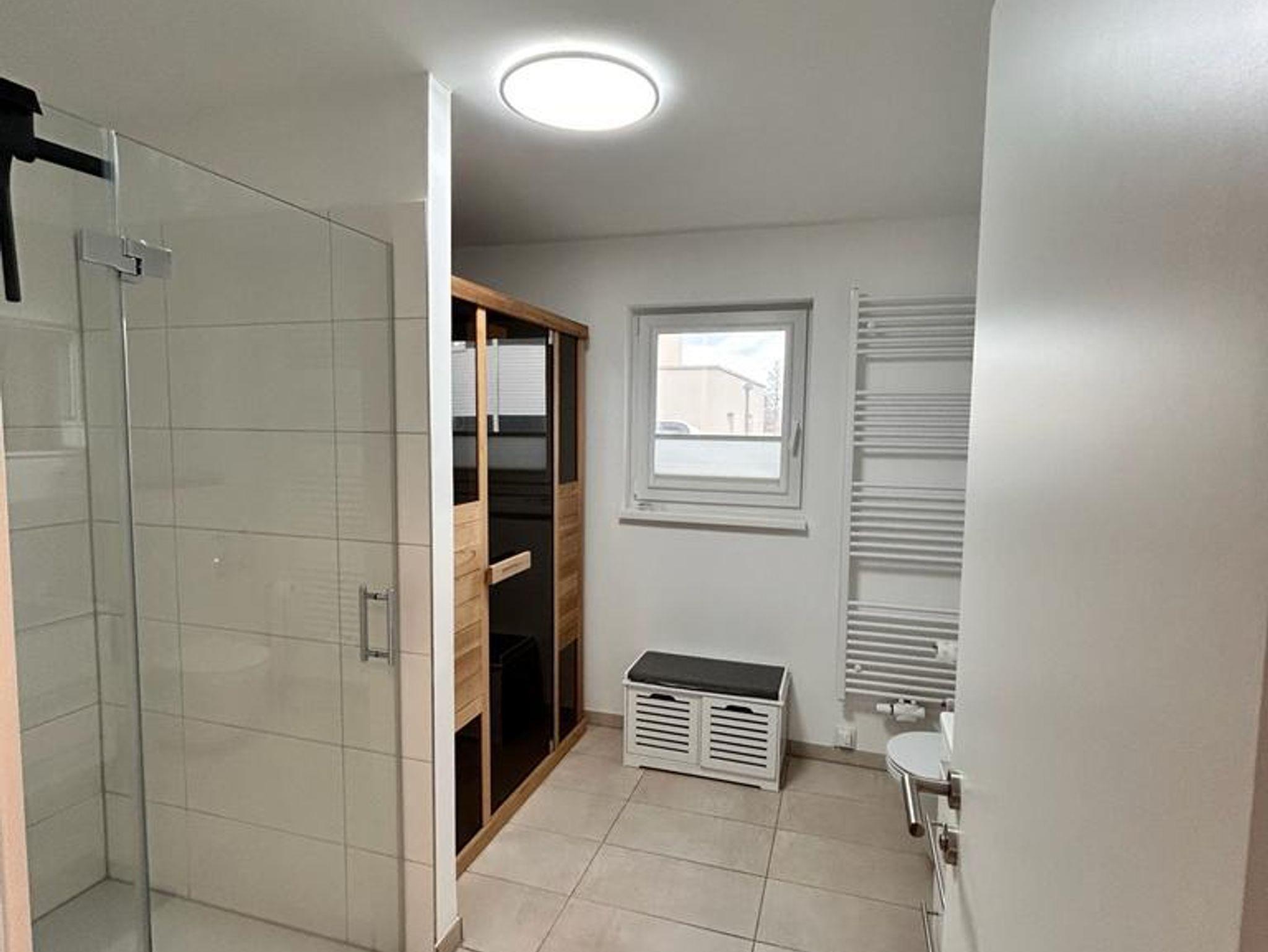 Das Bad ist mit einer geräumigen begehbaren Dusche, Waschbecken und einem WC ausgestattet. Zudem befindet sich hier eine Infrarotkabine (keine klassische Sauna), sowie eine Waschmaschine.