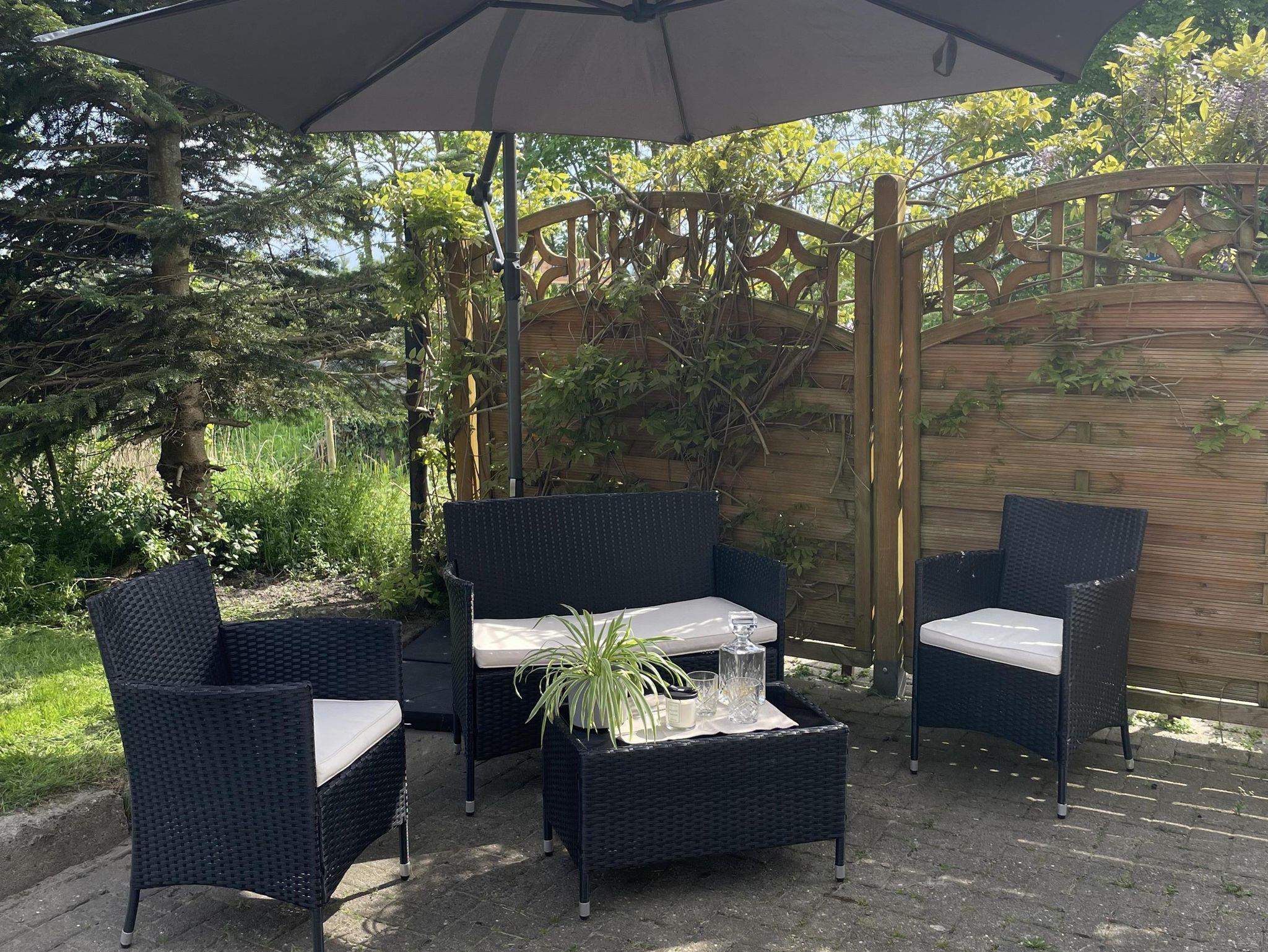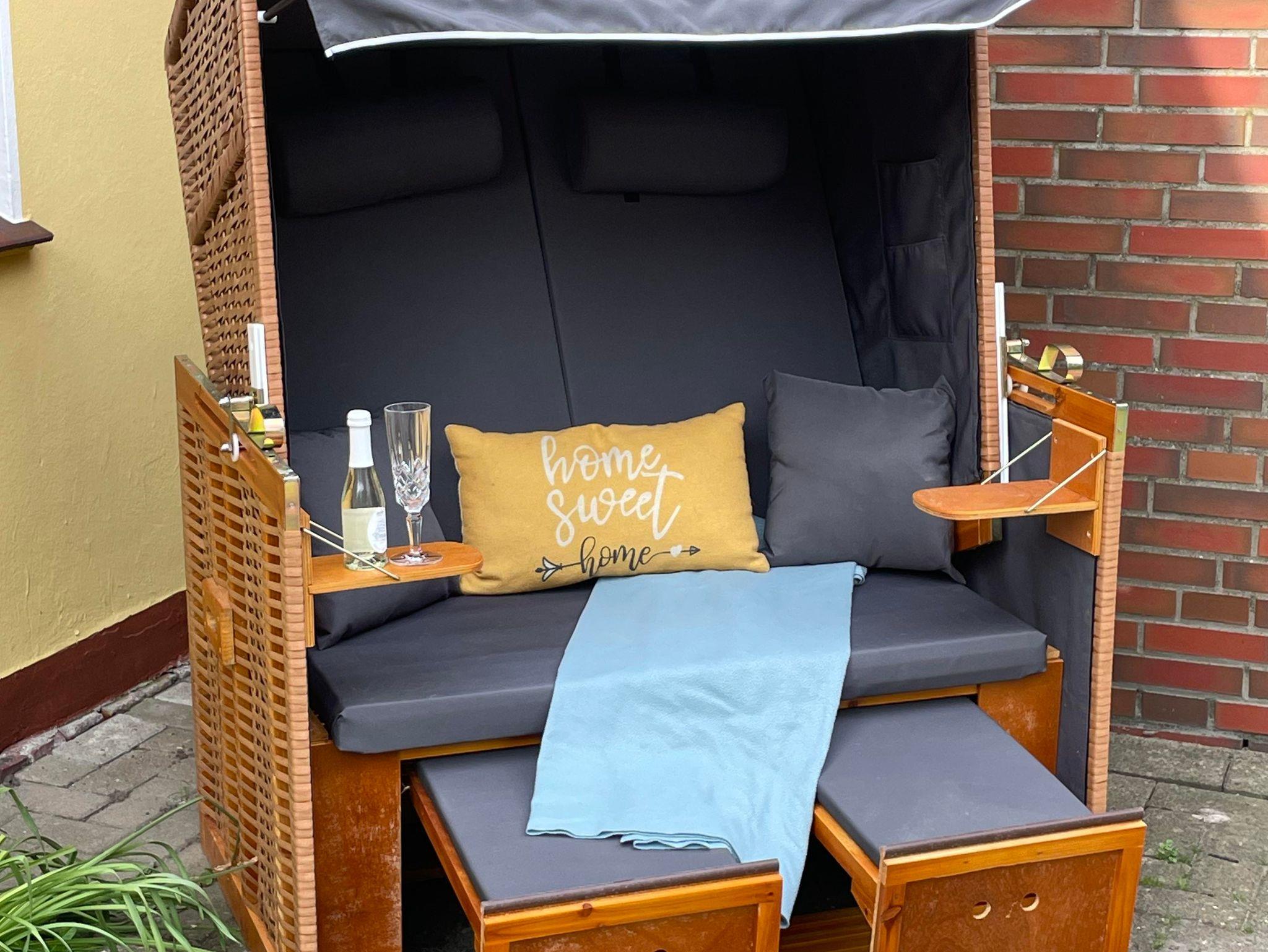 Eine Gemeinschaftsterasse mit Strandkorb lädt zum kennenlernen und verweilen ein. Unsere Wohnung Kajüte hat außerdem eine eigene Terasse mit Sitzecke, Strandkorb und Sonnenschirm. Im Garten sind Spielgeräte vorhanden.