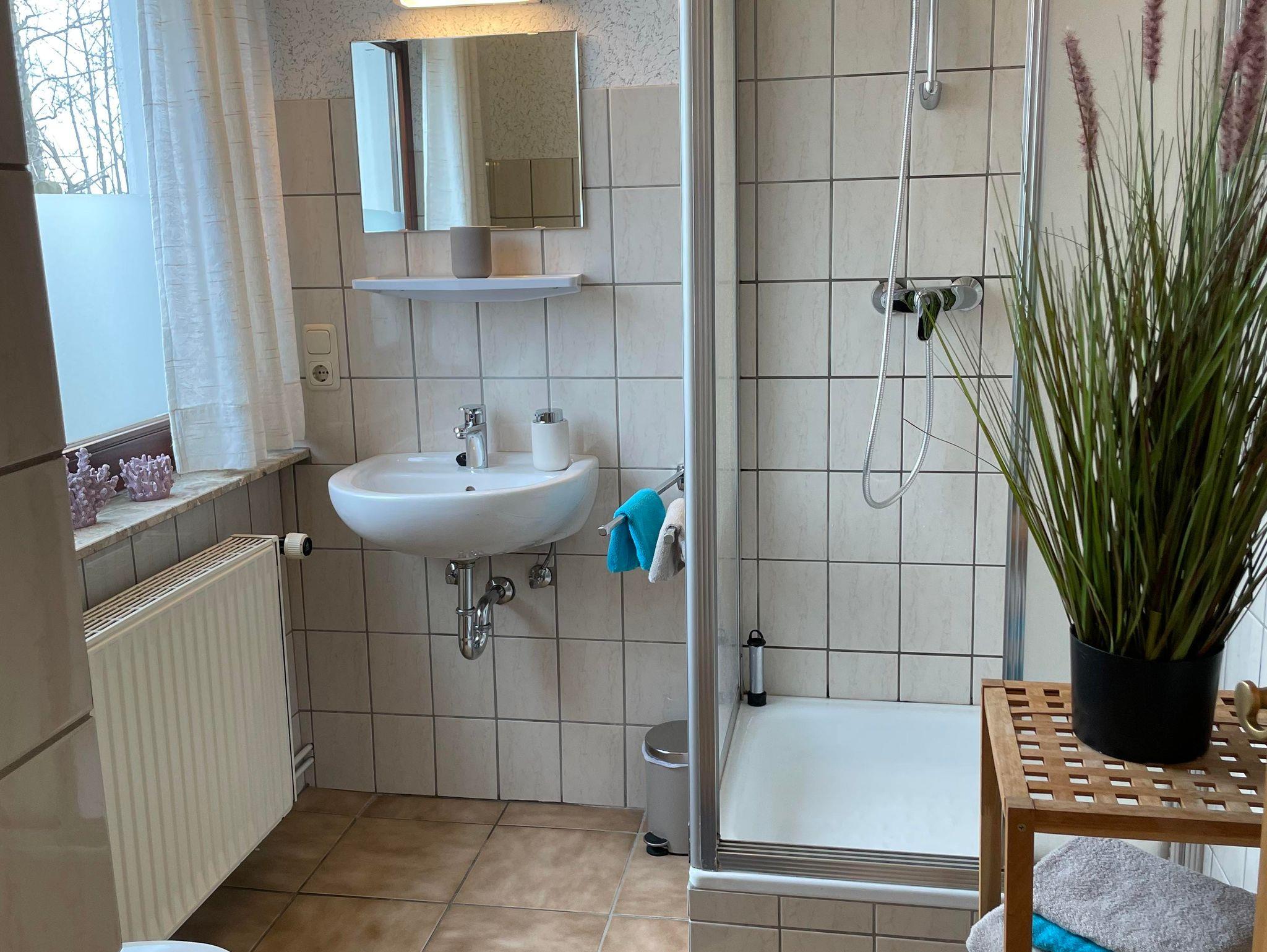 Das Duschbad ist mit einem Waschtisch, Spiegel und einem Föhn ebenfalls voll ausgestattet.