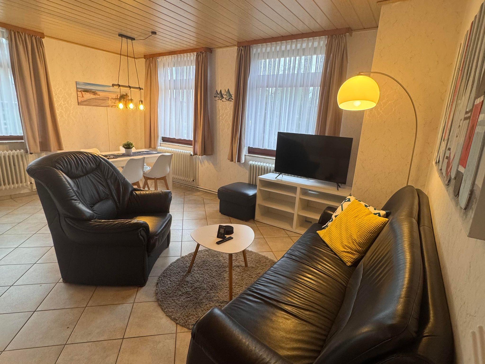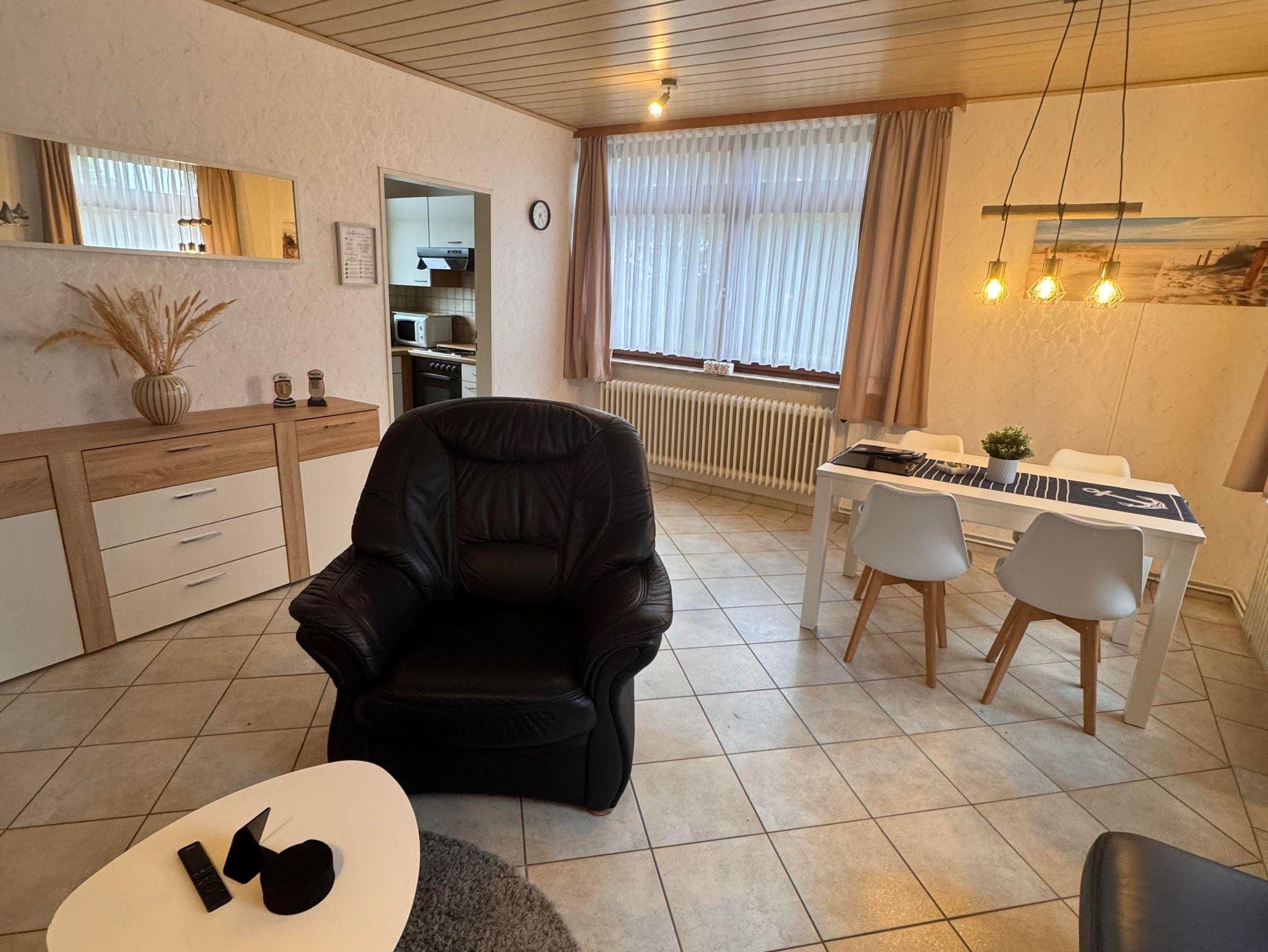 Der große Wohn-, Essbereich ist mit einer hellen Essecke für 4 Personen und einem gemütlichen Sofa und Sessel ausgestattet.