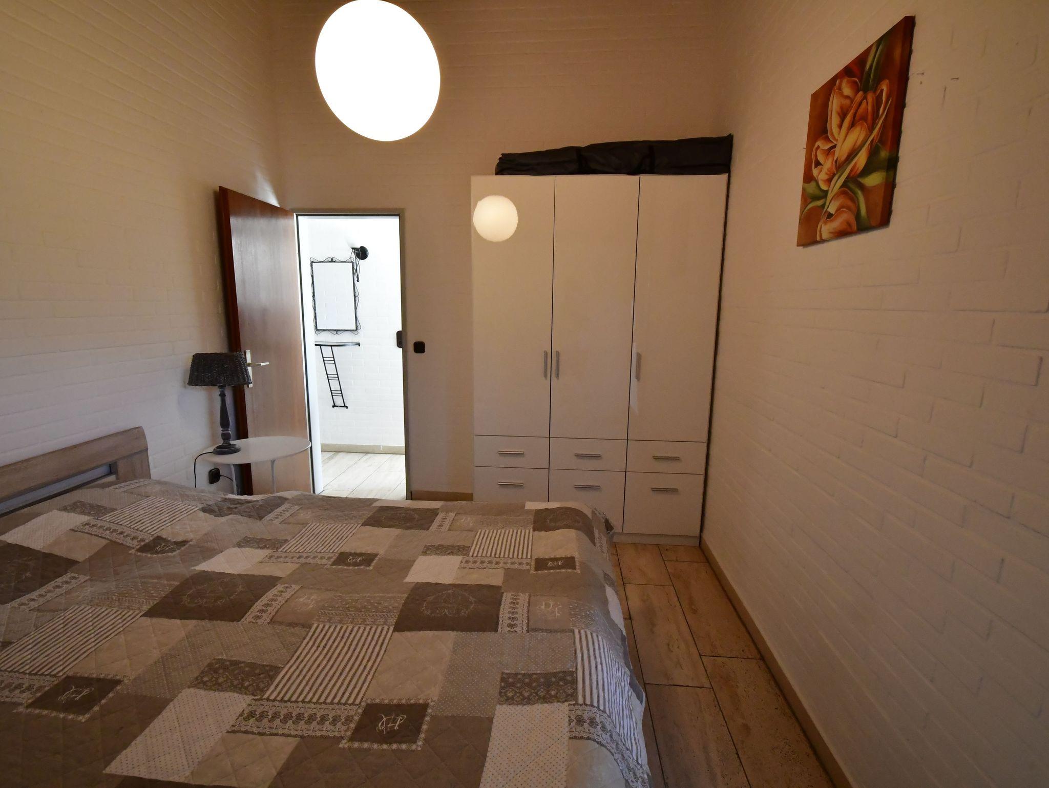 Im Schlafzimmer steht ein Doppelbett sowie ein Schrank.