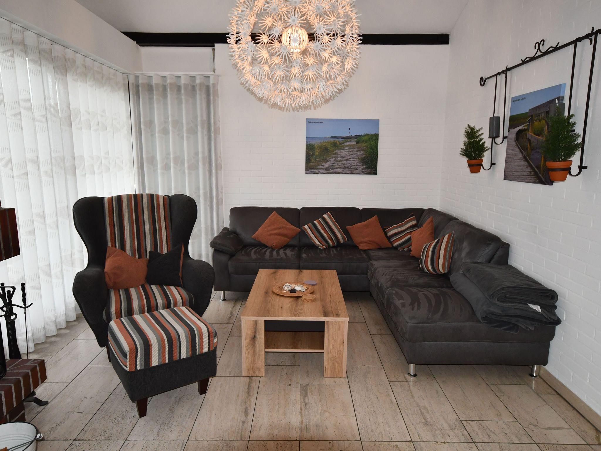 Im Wohnzimmer steht eine große Eckcouch, sowie ein Sessel, der zum Verweilen einlädt. Vorhanden sind natürlich ein SAT-Fernseher, ein DVD-Player und eine Micro-Stereo-Anlage.