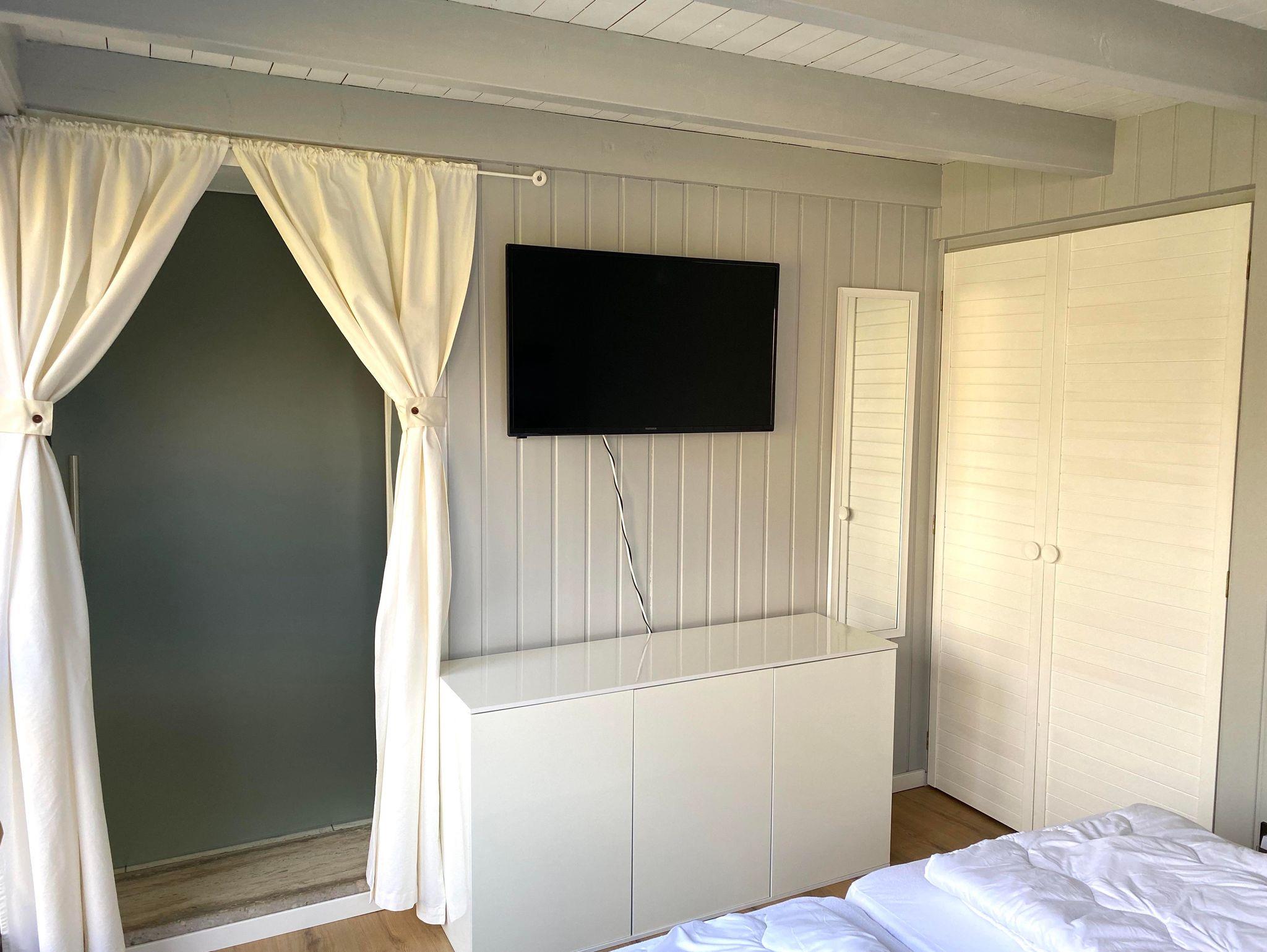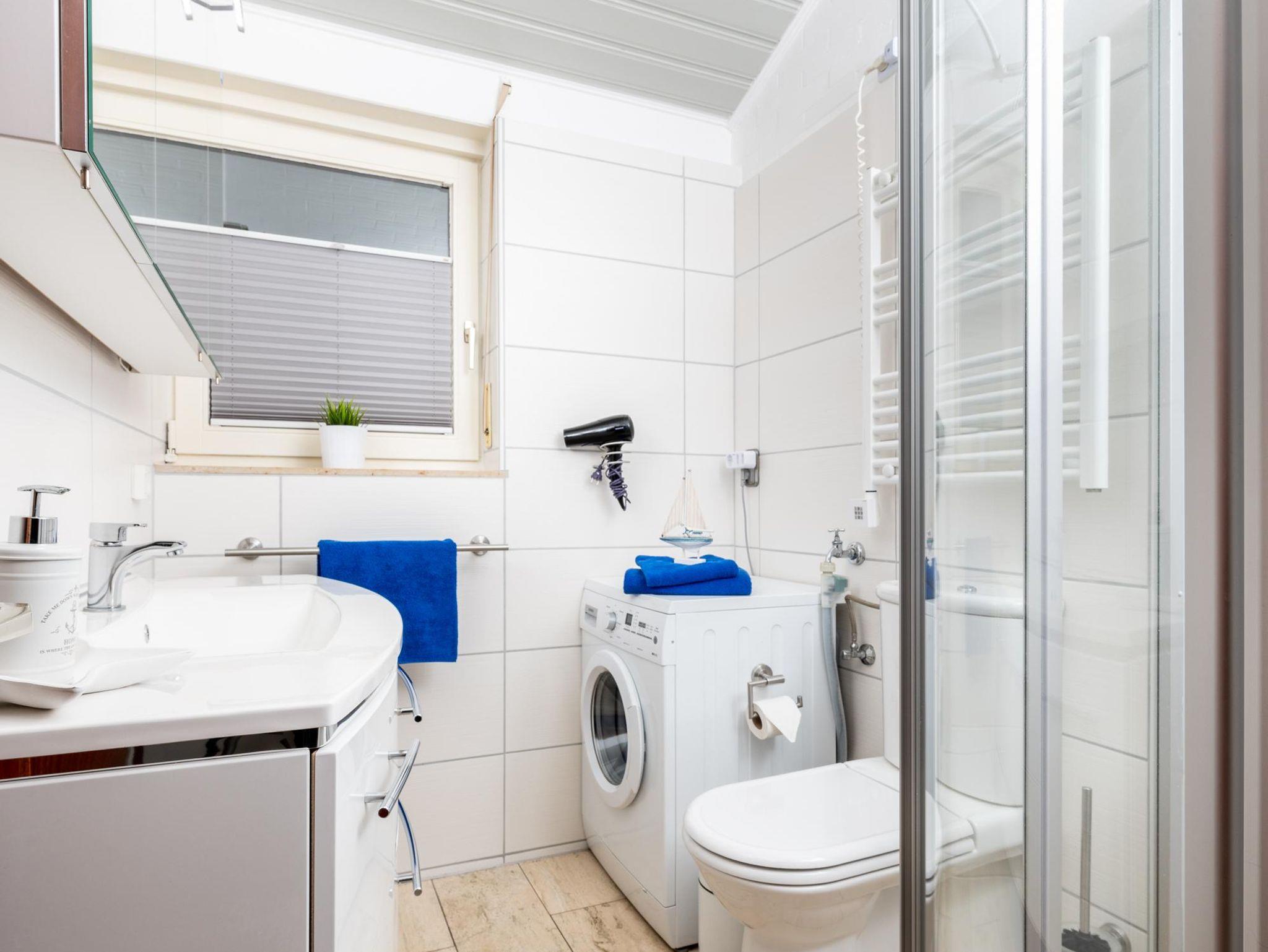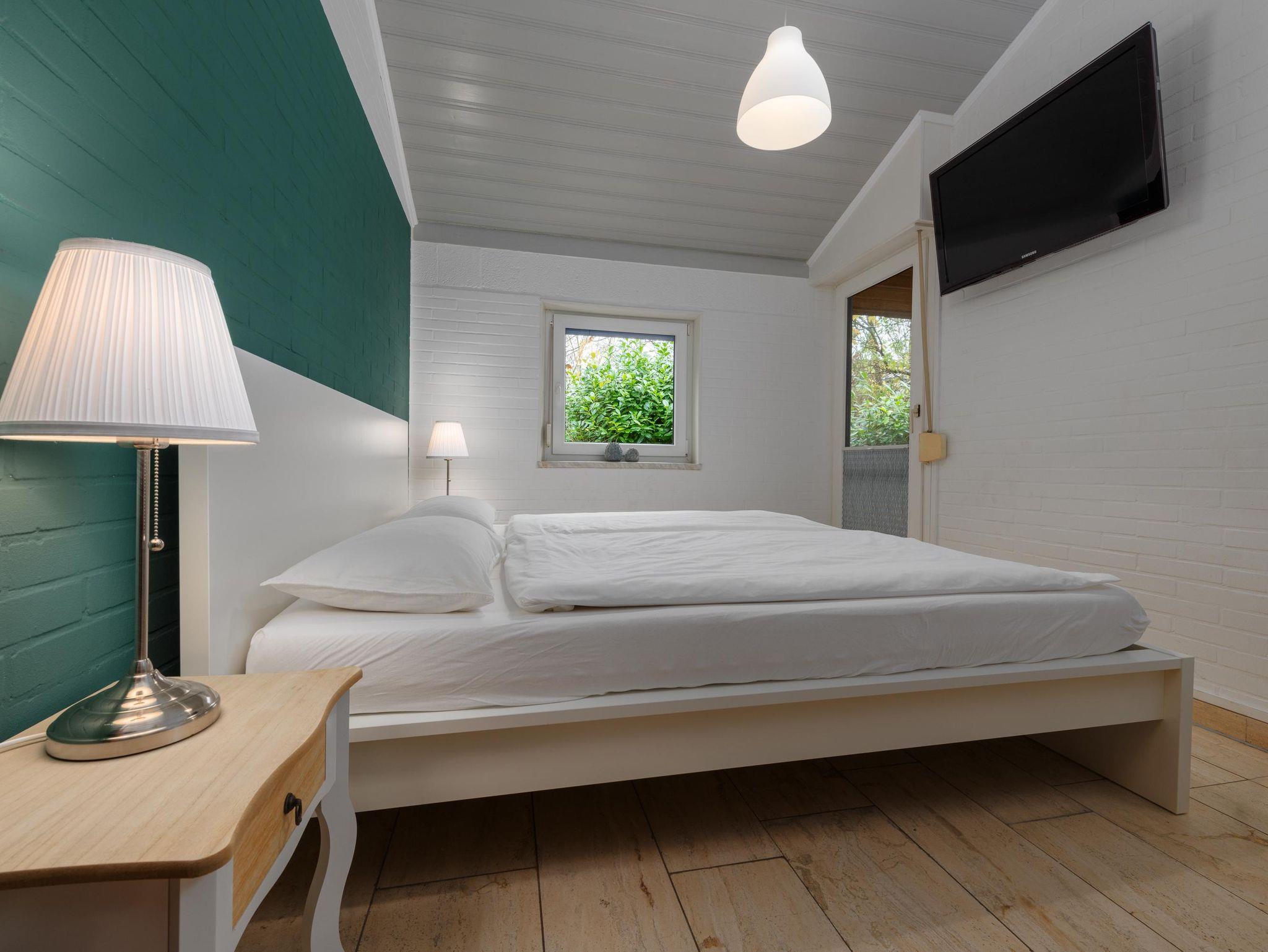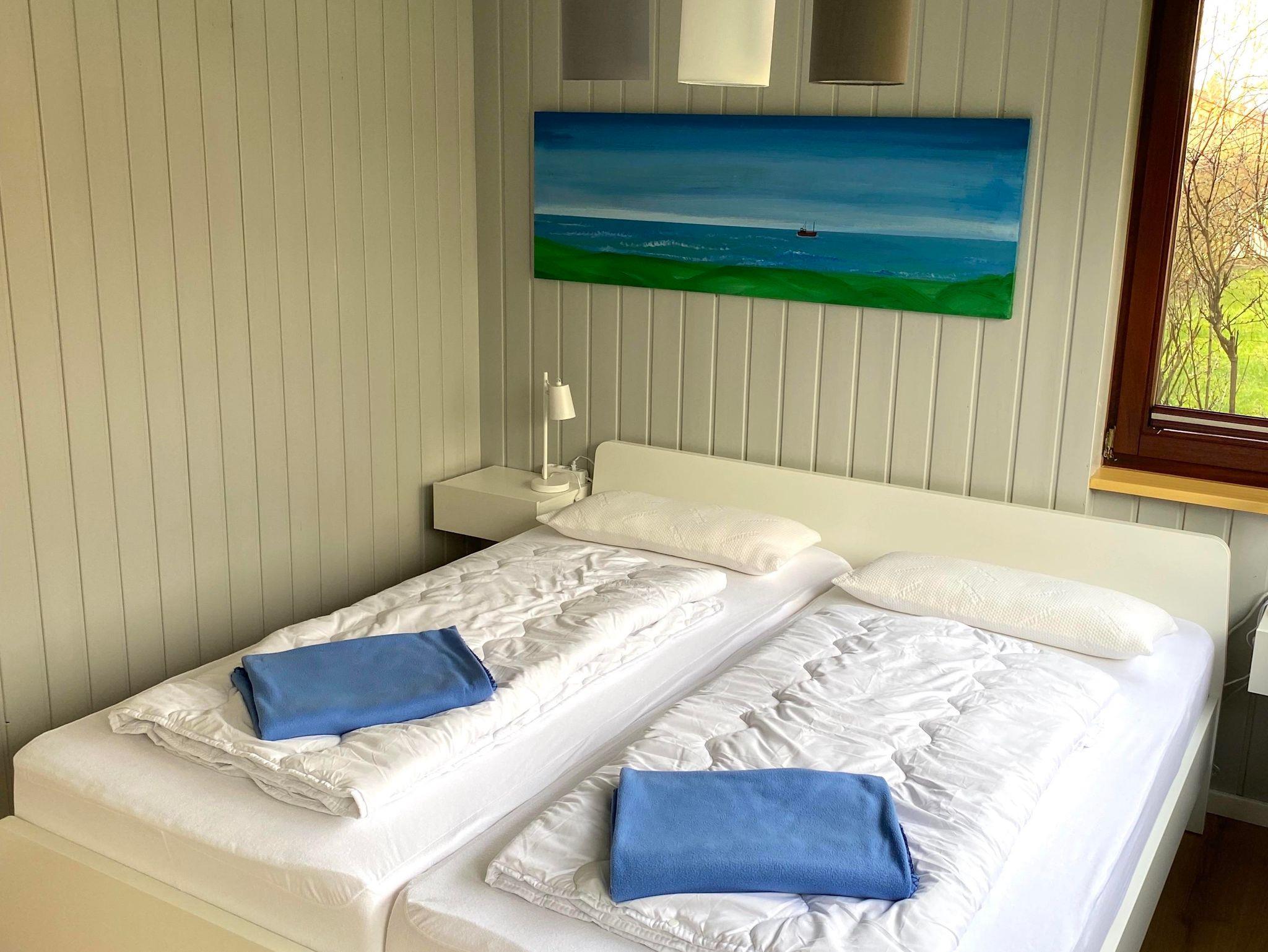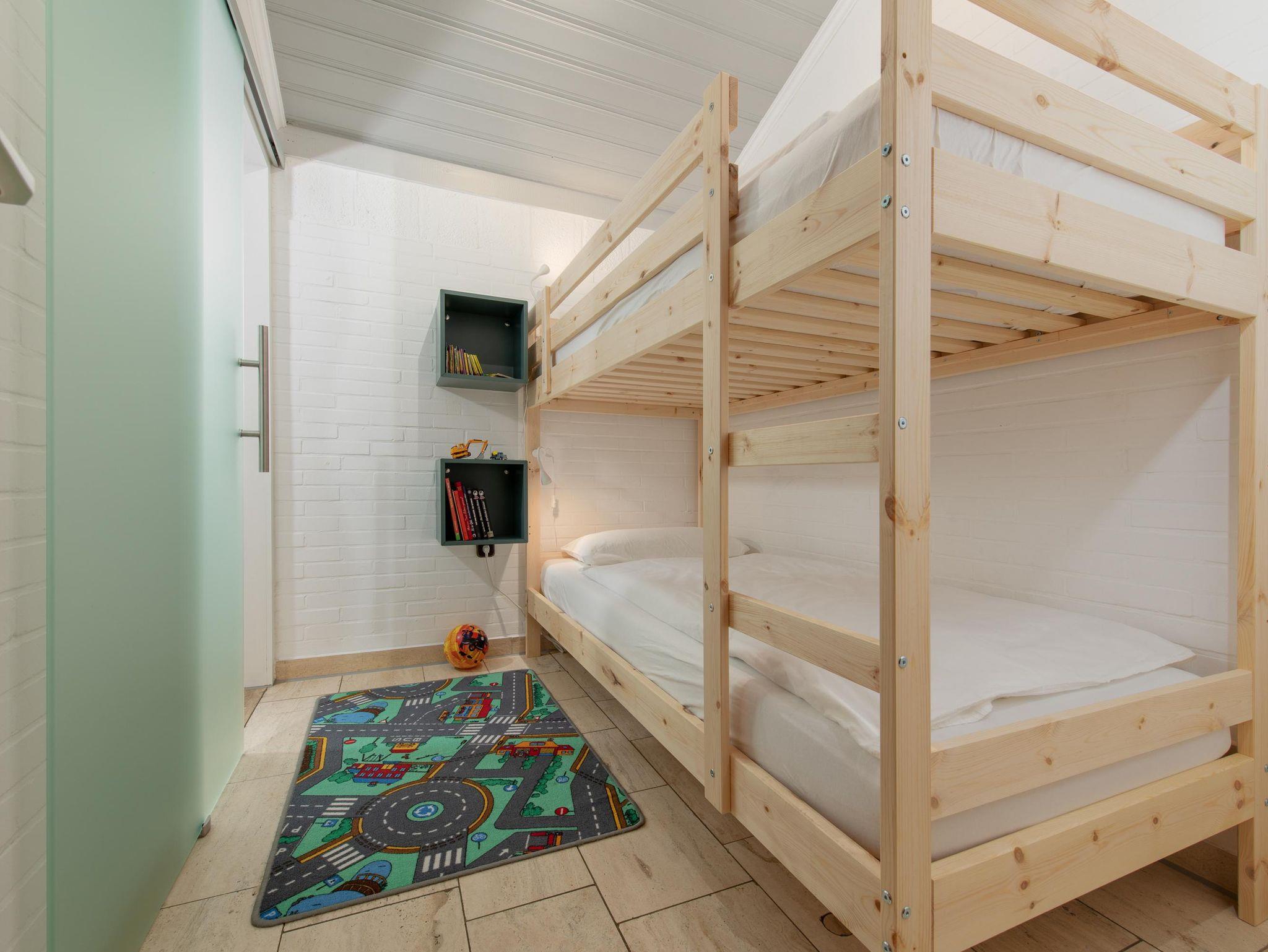 Weiterhin stehen Ihnen 1 Bad mit bodengleicher Dusche und Waschmaschine (inkl. Trockner im HWR) sowie 2 Schlafzimmer mit je einem Doppelbett (180 x 200) und je einem TV sowie ein Kinderzimmer mit einem Doppelstockbett (90 x 200) zur Verfügung.
