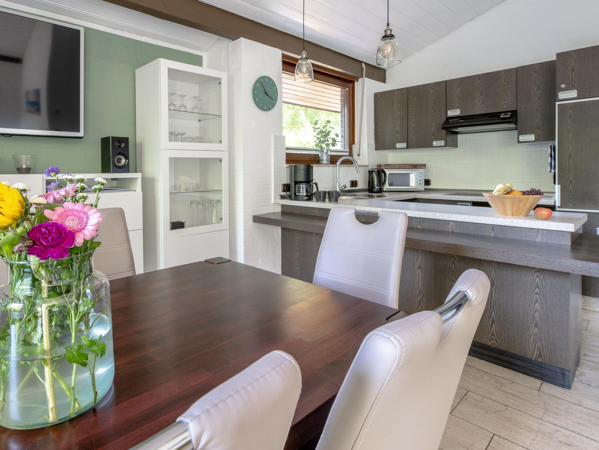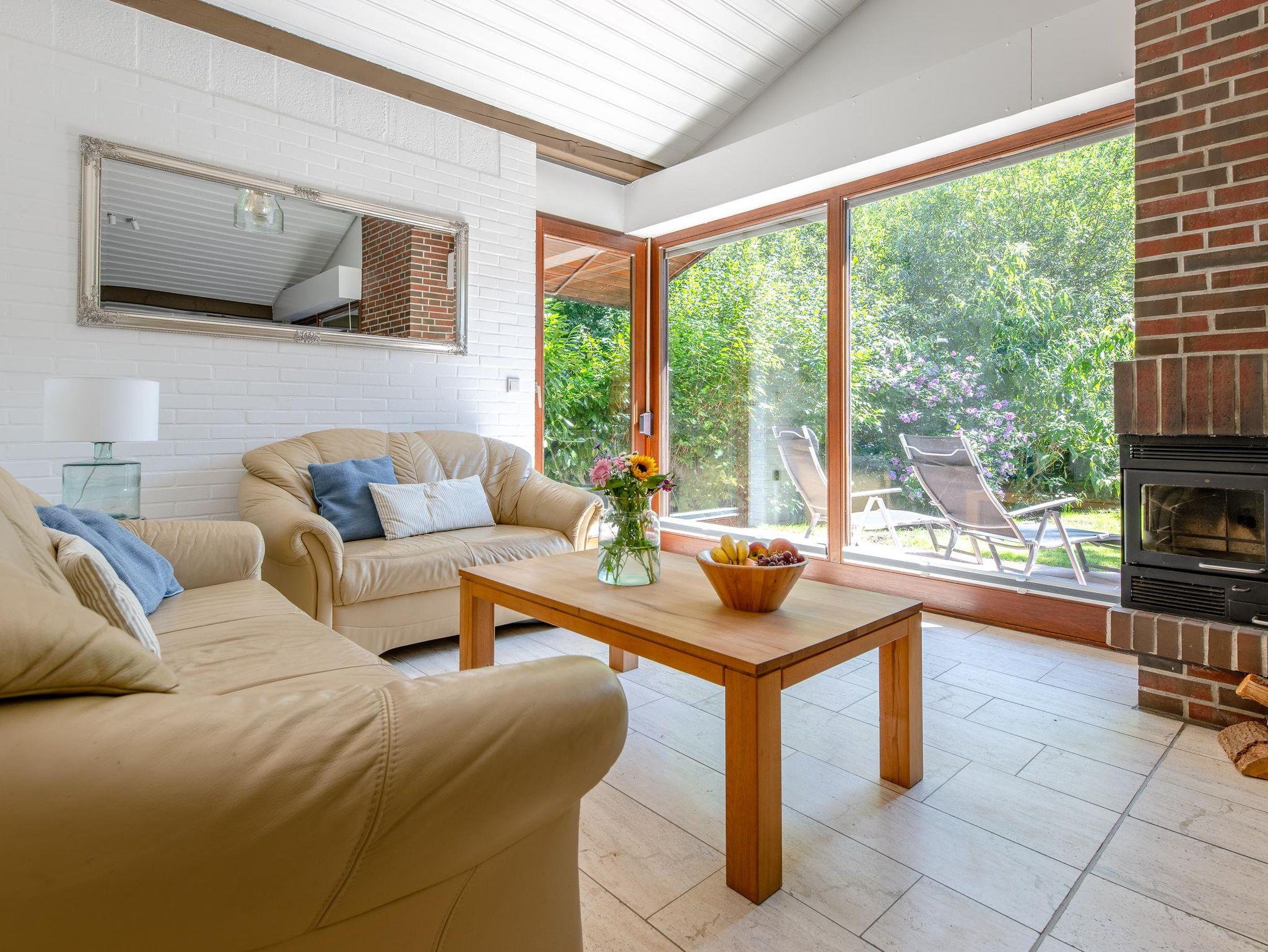 Der großzügige Wohn- und Essbereich mit großem Smart-TV und gemütlicher Sitzecke sowie die voll ausgestattete offene Küche laden zum geselligen Beisammensein ein. Das viele Grün und der Baumbestand im liebevoll angelegten Garten ermöglichen erholsame Momente in absoluter Privatsphäre. Genießen Sie die Sonne im Lounge-Bereich auf der Südterrasse. An kälteren Tagen können Sie sich mit dem Innen- und Außenkamin angenehm einheizen. Eine Grill- und Feuerschale für gemütliche Grillabende ist ebenfalls vorhanden.