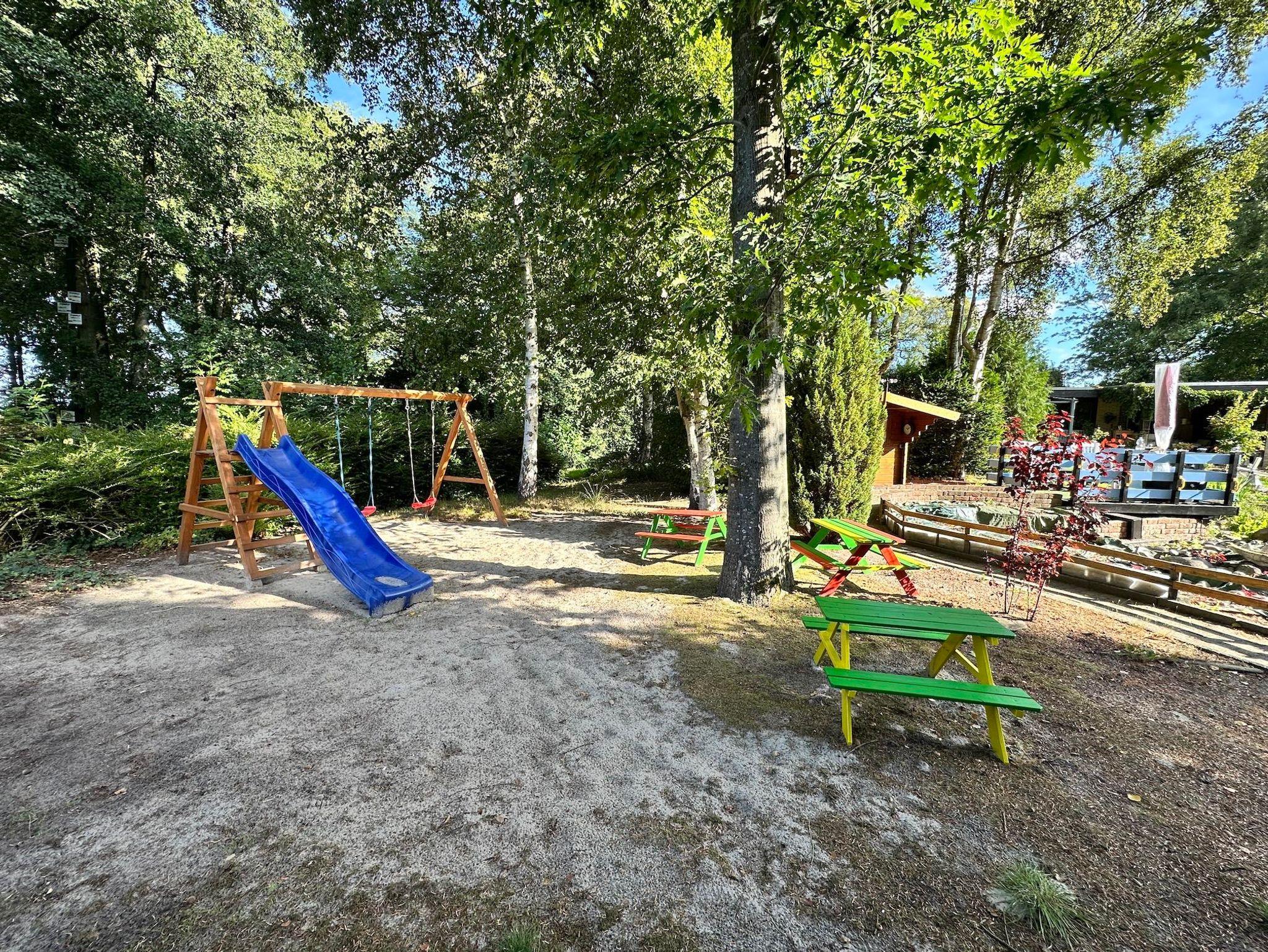 Eigene überdachte Terrasse mit Tisch, Stühlen und Entspannungs- Liegen, Kindertisch mit Bänken