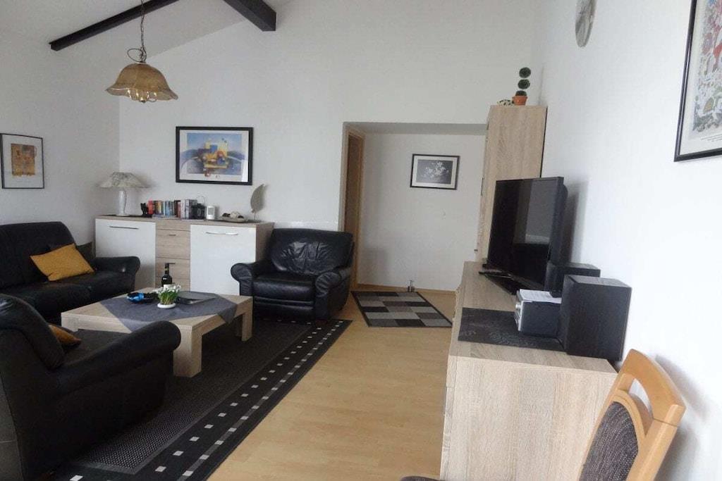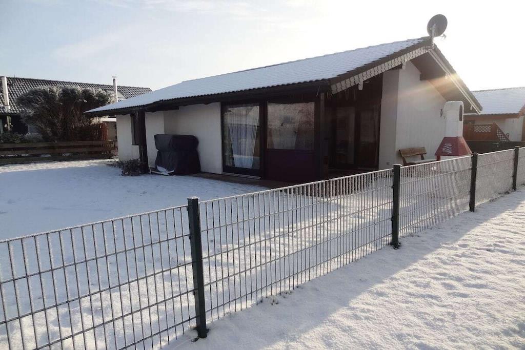 The high-quality holiday home has a living space of approx. 62 m² and consists of a living room with a sofa and television, a well-equipped kitchen with a dining table and 5 chairs, a bathroom with shower and toilet and two bedrooms. One bedroom has a double bed and a second television and the other bedroom has three single beds (1 bunk bed) and a desk. A cot and high chair for a toddler are available.