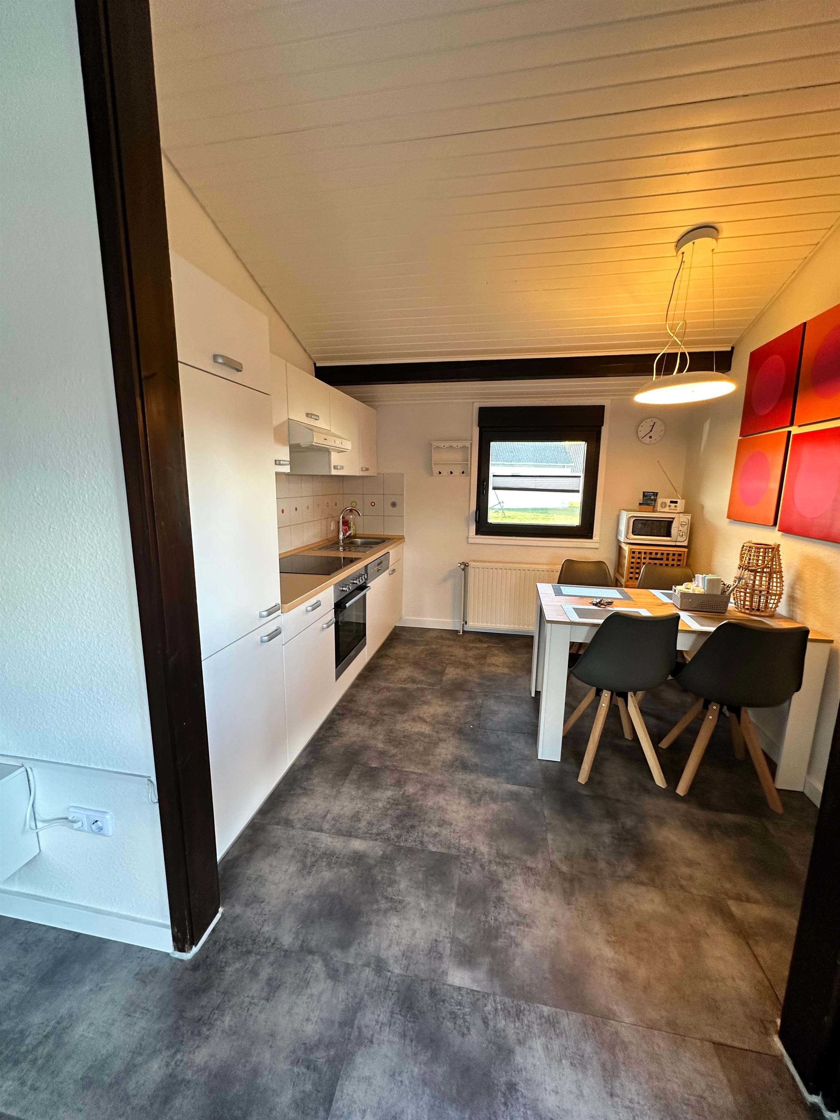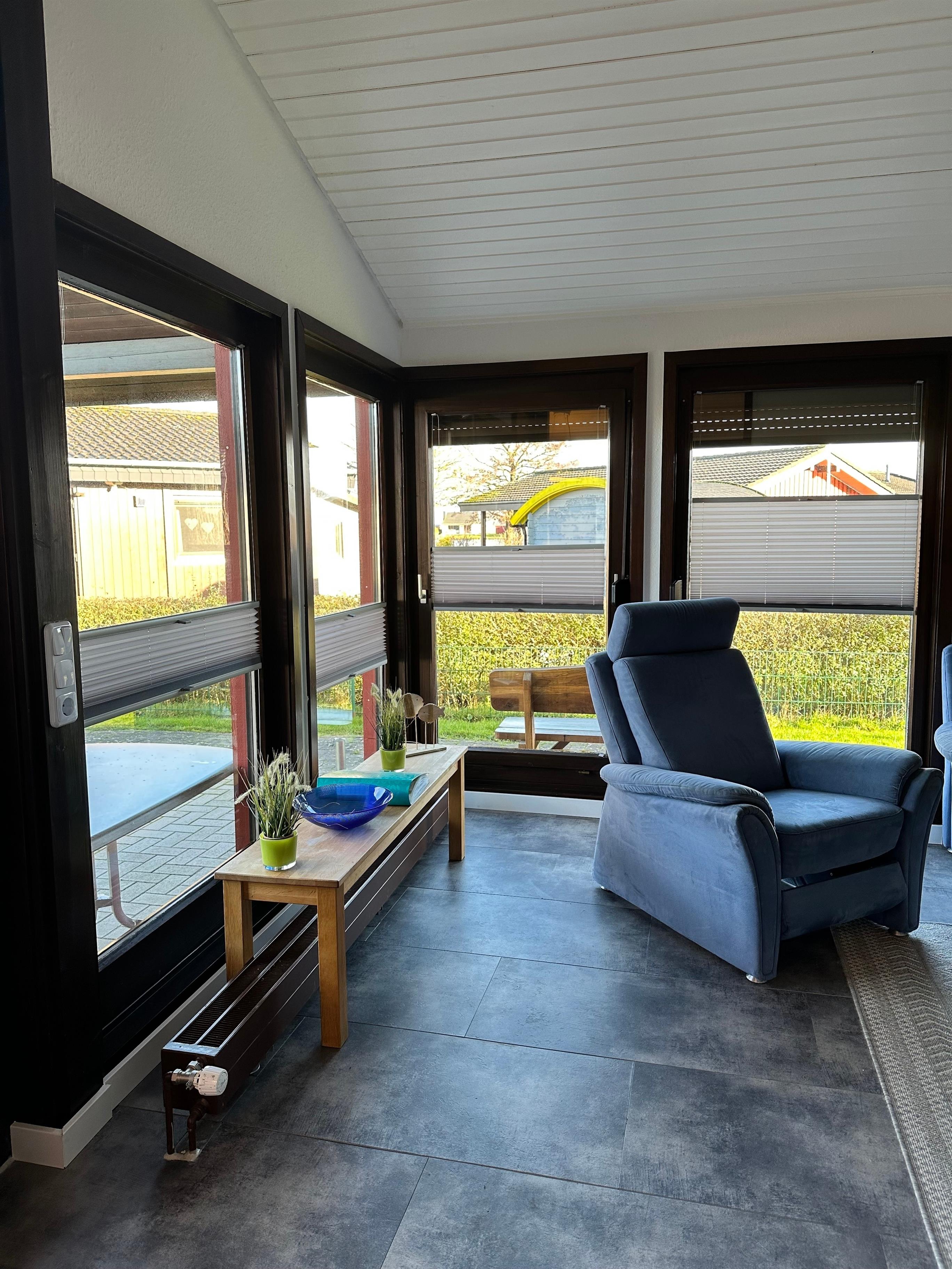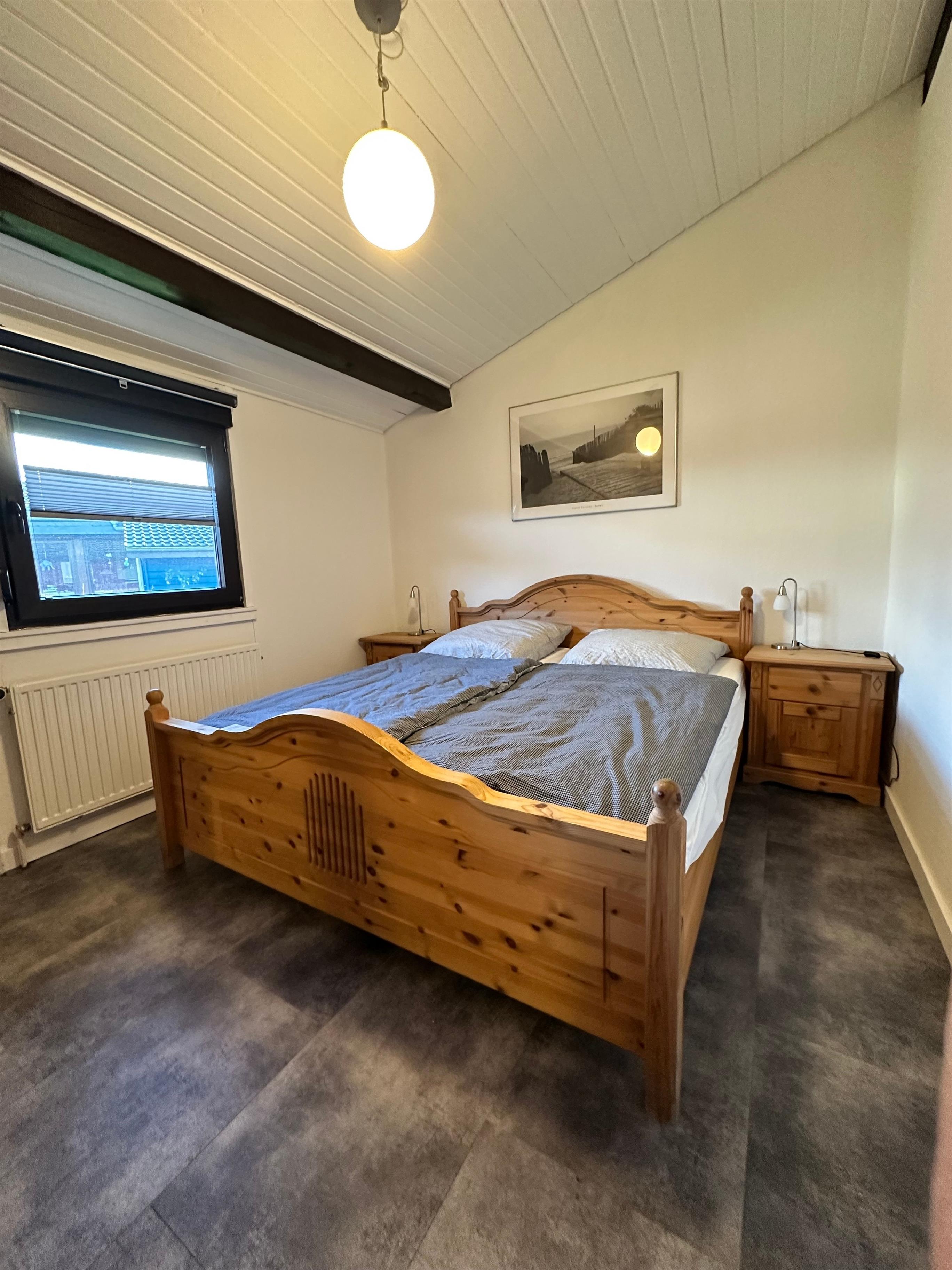 Über den Seiteneingang betritt man direkt den großzügigen Wohn- und Essbereich mit integrierter, voll ausgestatteter, moderner Küche, einem Esstisch und der gemütlichen Couchecke. Das lichtdurchflutete und praktisch-funktionale Badezimmer verfügt über WC, Waschtisch und Dusche. Ein großzügiges Doppelbett und ein geräumiger Schrank befinden sich im ersten Schlafzimmer. Das zweite Schlafzimmer ist ausgestattet mit zweit Einzelbetten, einem Hochbett und einem Kleiderschrank. Sämtliche Fenster sind mit Fliegengittern versehen und fast alle Räumlichkeiten haben Außenjalousien. Die komplett überdachte Terrasse lädt tagsüber und abends zum gemütlichen Verweilen ein. Auf dem komplett eingezäunten Grundstück befinden sich im Gartenhaus Stellplätze für ihre mitgebrachten Fahrräder und ein Aussen-Grill. Eine Waschmaschine und ein Trockner stehen Ihnen während des Aufenthalts zur Verfügung. Parkmöglichkeiten direkt am Haus. Kinderbett und Hochstuhl ist im Haus. 1 Hund gegen Gebühr erlaubt. Das Entleihen von Wäschepaketen möglich ist, die Abwicklung erfolgt direkt über den Verwalter.