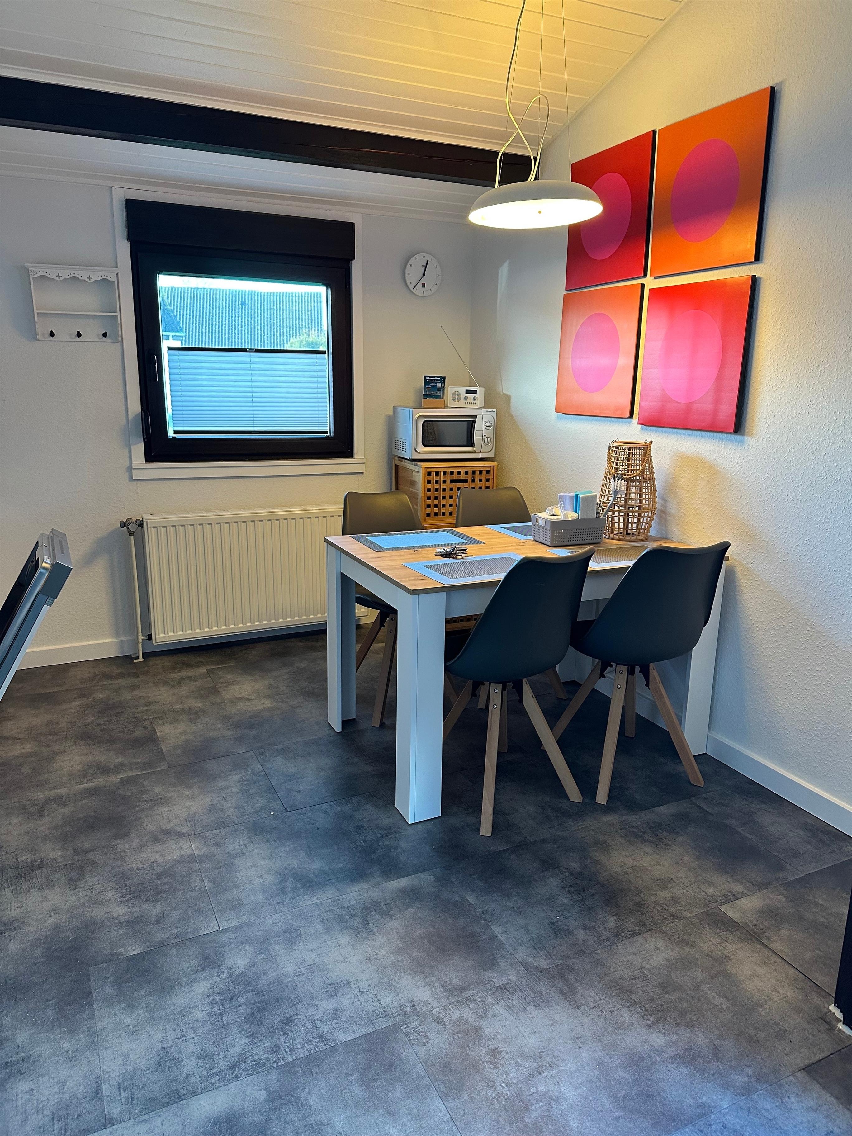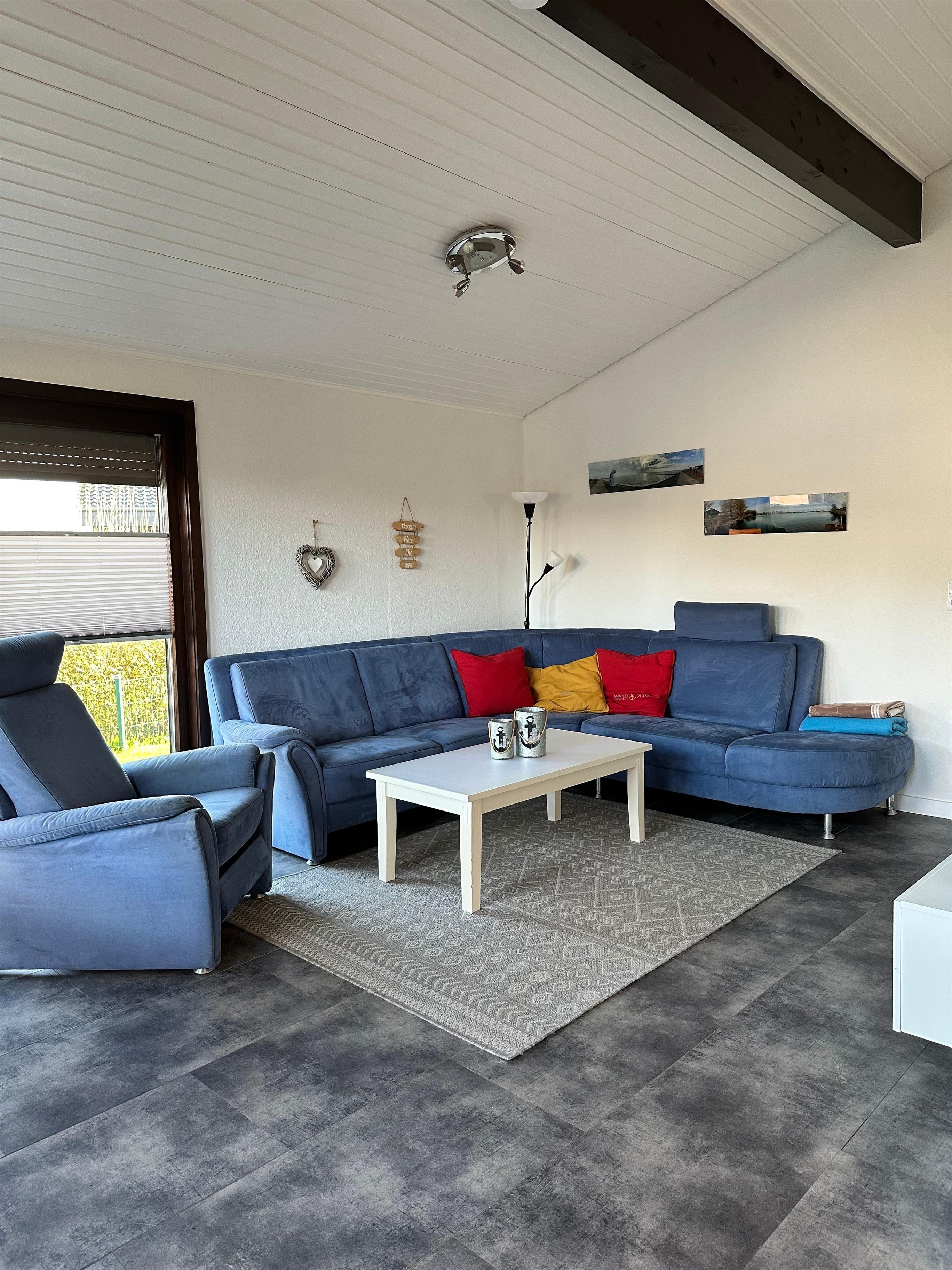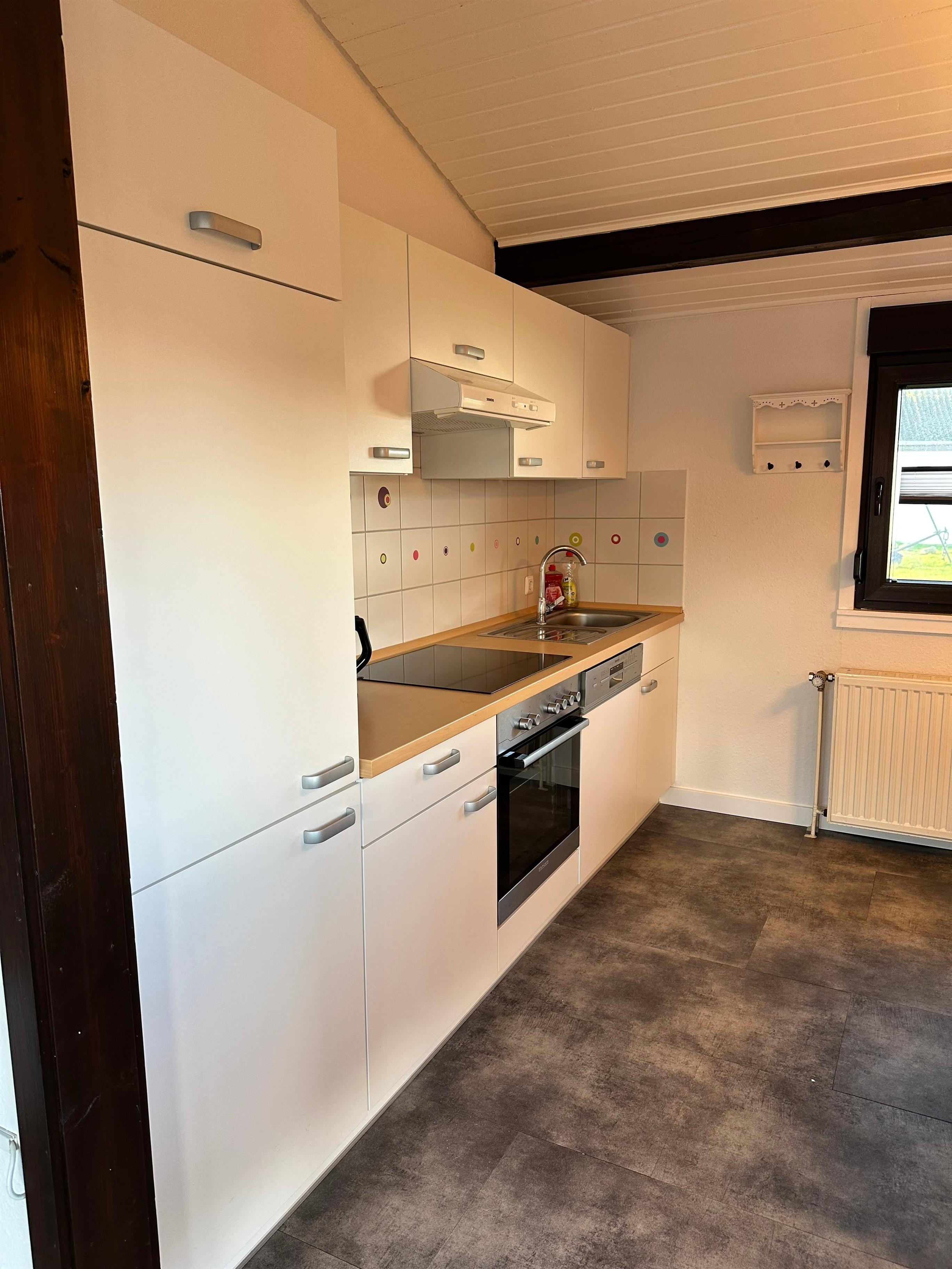 Über den Seiteneingang betritt man direkt den großzügigen Wohn- und Essbereich mit integrierter, voll ausgestatteter, moderner Küche, einem Esstisch und der gemütlichen Couchecke. Das lichtdurchflutete und praktisch-funktionale Badezimmer verfügt über WC, Waschtisch und Dusche. Ein großzügiges Doppelbett und ein geräumiger Schrank befinden sich im ersten Schlafzimmer. Das zweite Schlafzimmer ist ausgestattet mit zweit Einzelbetten, einem Hochbett und einem Kleiderschrank. Sämtliche Fenster sind mit Fliegengittern versehen und fast alle Räumlichkeiten haben Außenjalousien. Die komplett überdachte Terrasse lädt tagsüber und abends zum gemütlichen Verweilen ein. Auf dem komplett eingezäunten Grundstück befinden sich im Gartenhaus Stellplätze für ihre mitgebrachten Fahrräder und ein Aussen-Grill. Eine Waschmaschine und ein Trockner stehen Ihnen während des Aufenthalts zur Verfügung. Parkmöglichkeiten direkt am Haus. Kinderbett und Hochstuhl ist im Haus. 1 Hund gegen Gebühr erlaubt. Das Entleihen von Wäschepaketen möglich ist, die Abwicklung erfolgt direkt über den Verwalter.