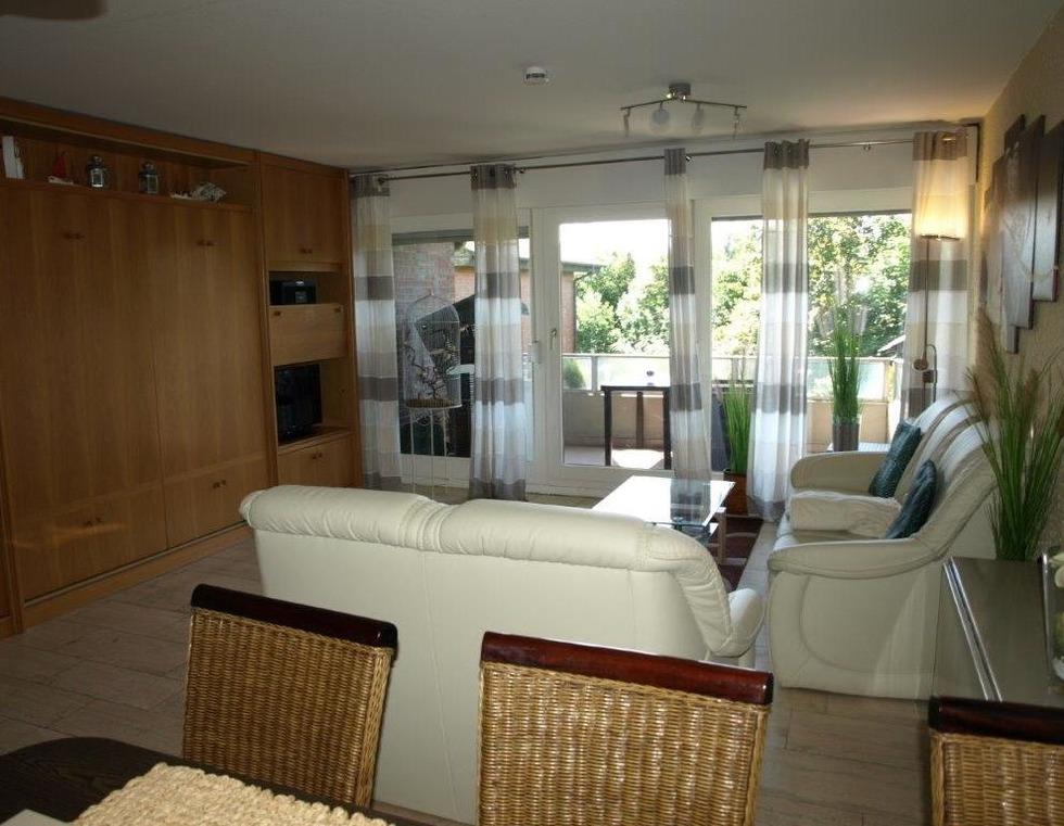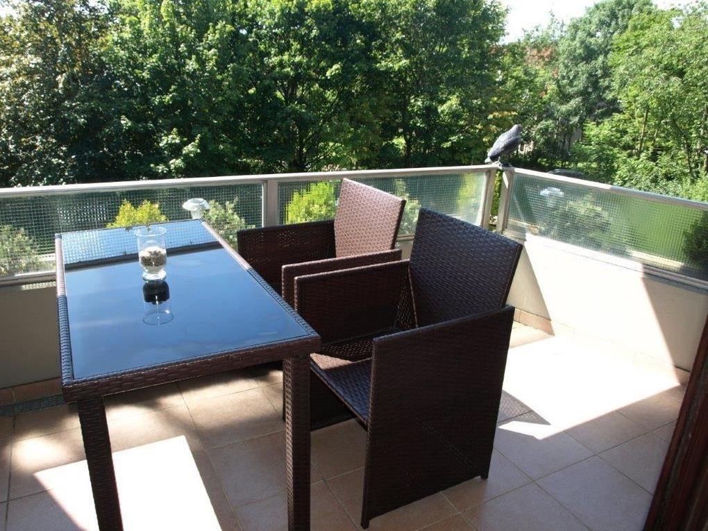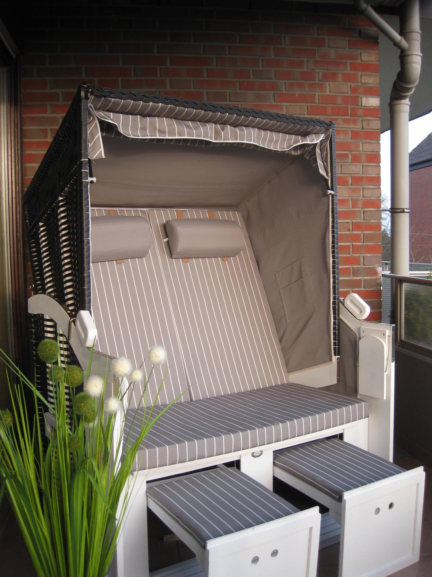 Der Balkon ist zur Südseite ausgerichtet und bietet die Gelegenheit, schon die ersten Sonnenstrahlen des Tages windgeschützt beim Frühstück zu genießen, gerne im eigenen Strandkorb. Abends entspannt man auf der gemütlichen Sitzecke vor dem modernen Fernseher.