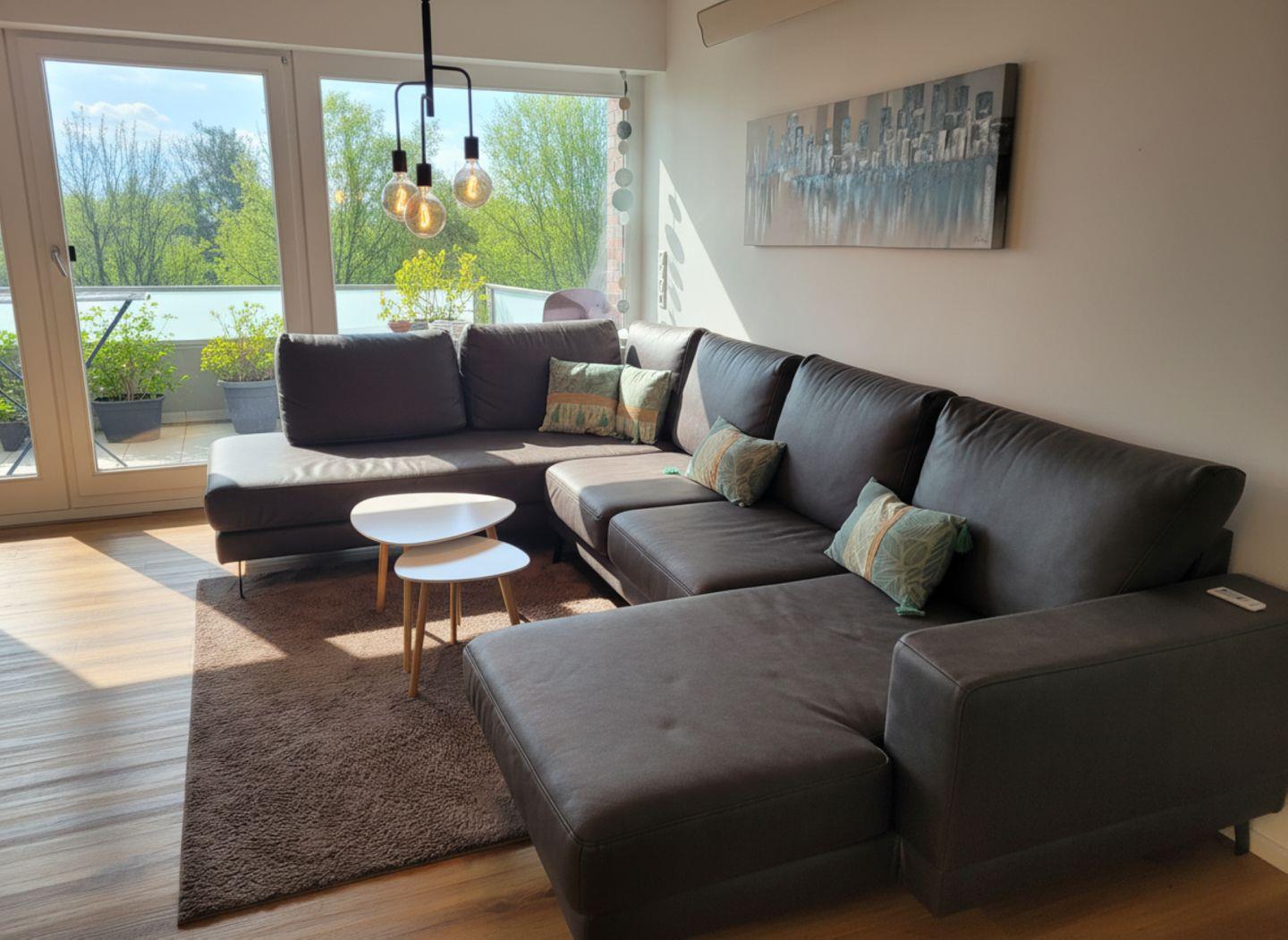 Im Wohnzimmer sorgt eine gemütliche Sofaecke für entspannte Abende.