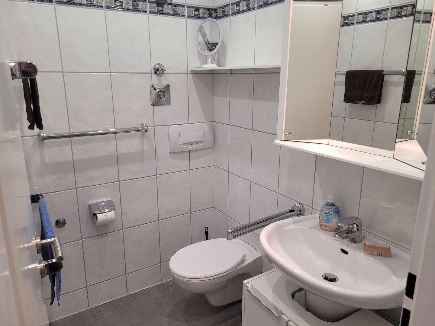Das helle Badezimmer verfügt über eine Dusche mit Wanne, Waschbecken und WC; ein Haartrockner sowie ein Spiegel sind vorhanden.