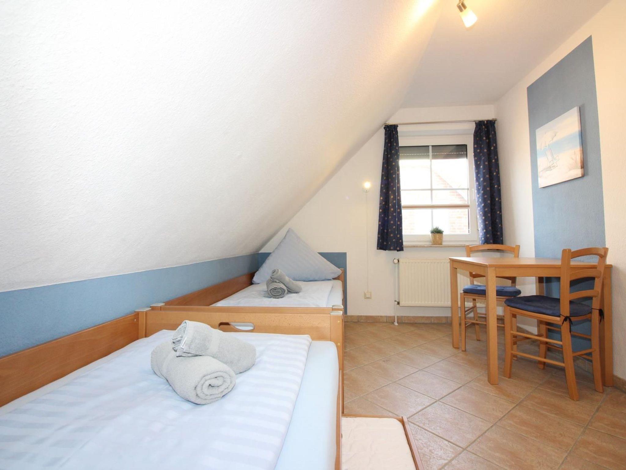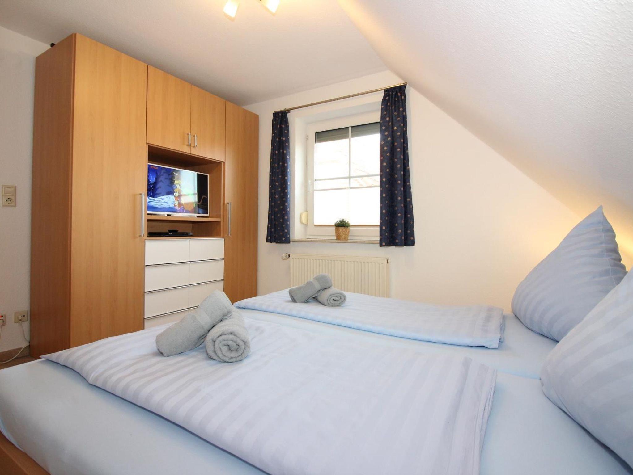 Schlafzimmer 2 mit zwei Einzelbetten, eins davon ein Tandembett, 24 LCD-TV