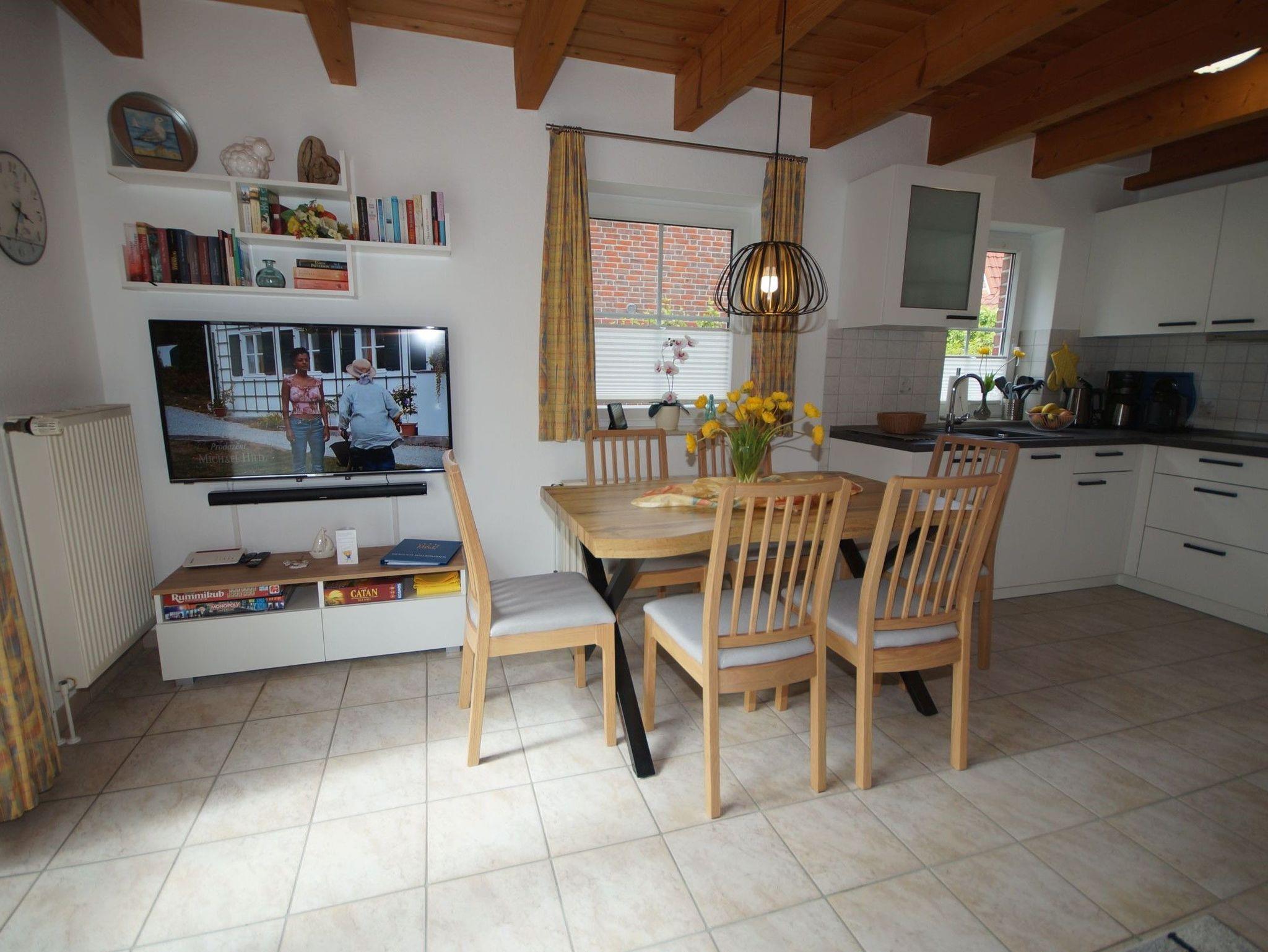 Im Erdgeschoß befindet sich der Wohn-, Essbereich mit Küche. Diese ist komplett ausgestattet mit z. B. Spülmaschine, Backofen sowie einer Tassimo und Kaffeemaschine. Des Weiteren befinden sich im Erdgeschoß eine Gästetoilette und ein kuscheliges Schlafzimmer mit zwei Betten.