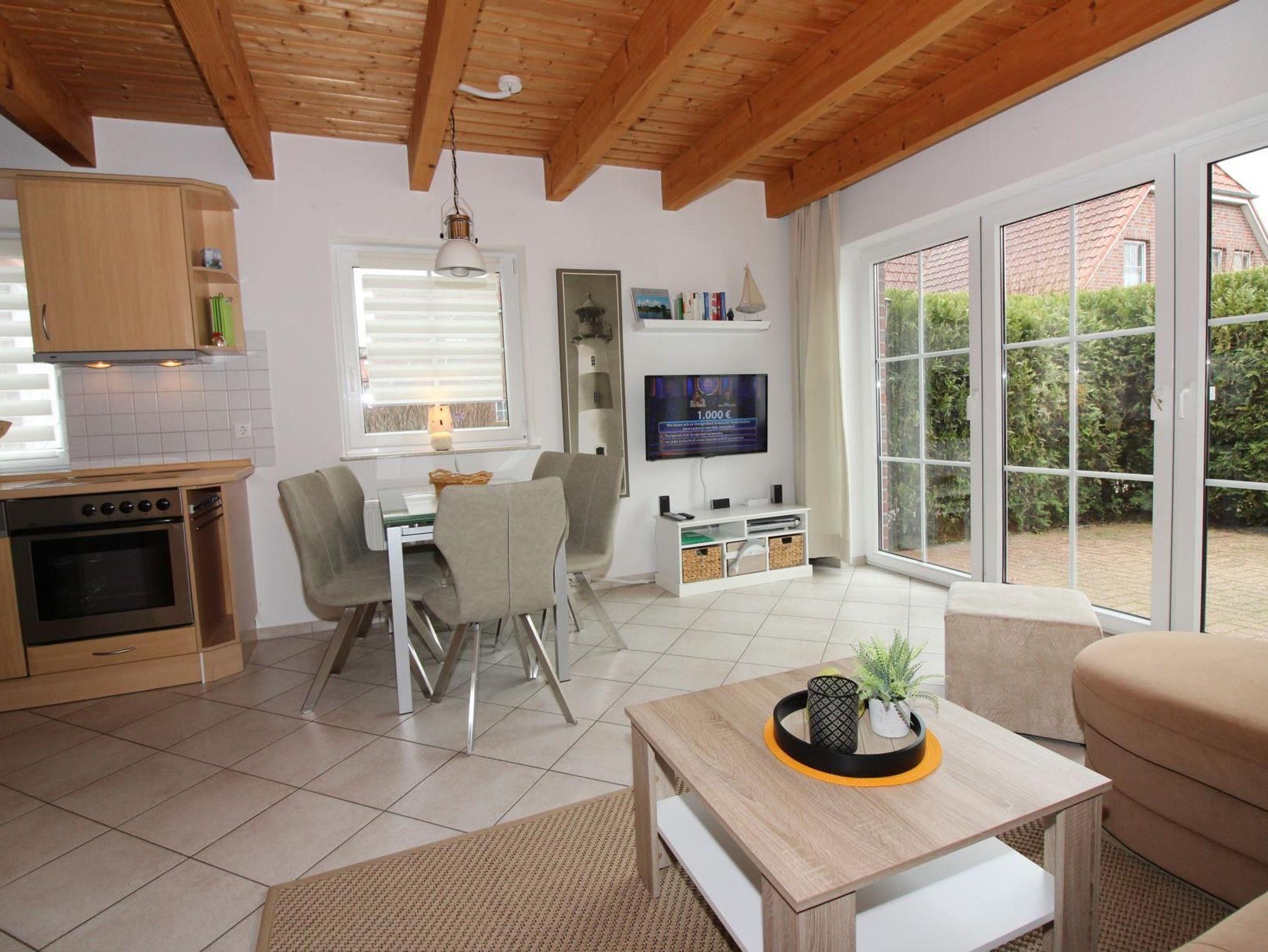 Vom Eingang führt ein kleiner Flur zum komfortablen Wohnbereich mit großem TV, Internetradio, DVD-Player und Surroundanlage. Der Essbereich ist modern eingerichtet und für die kleinen Gäste steht ein Kinderhochstuhl bereit. Anschließend an den Wohnbereich findet man die voll ausgestattete Küche inkl. Geschirrspüler, Mikrowelle, Backofen, Kühlschrank mit Gefrierfach und Senseo-Maschine.