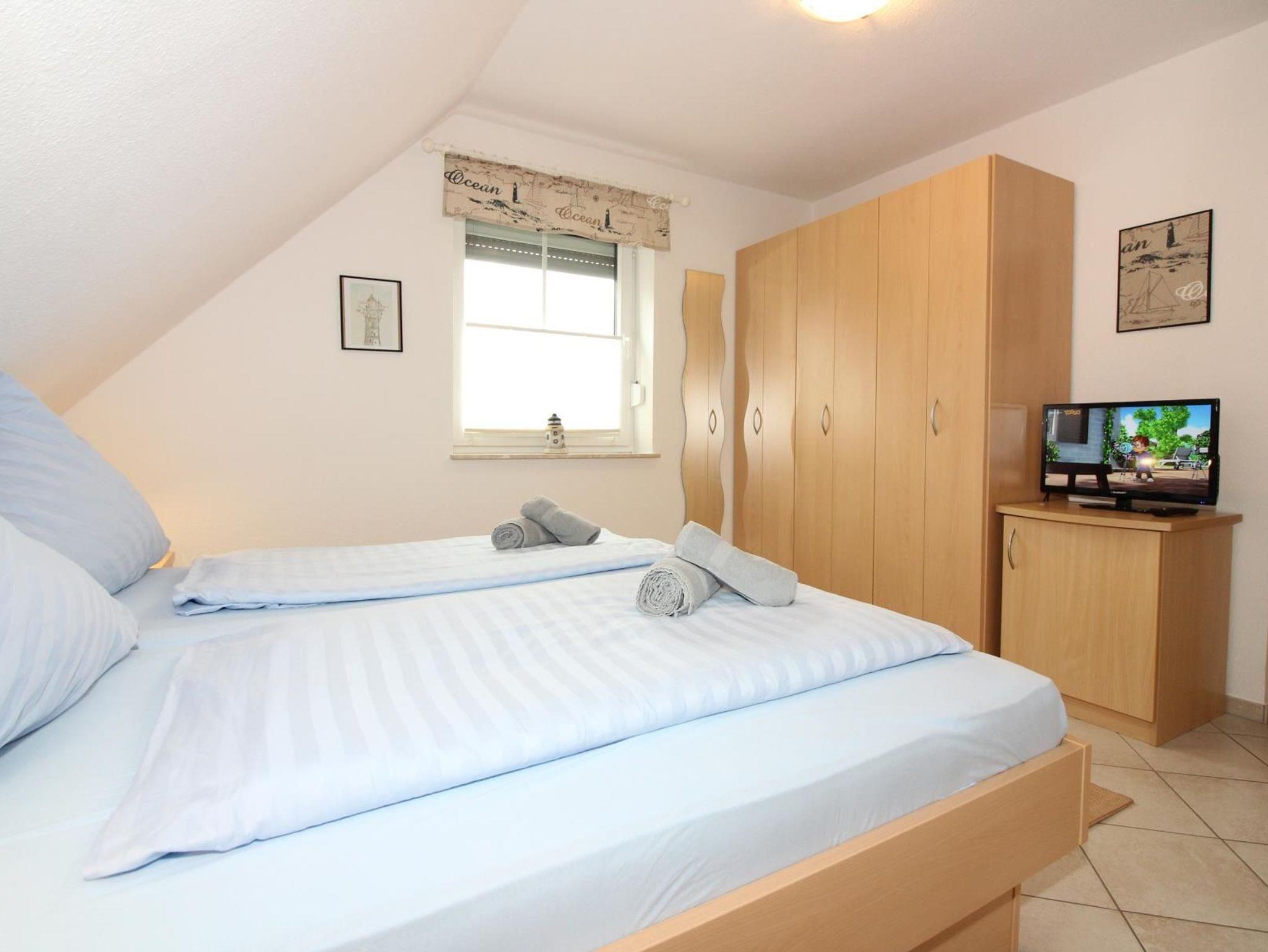 Im Obergeschoss befinden sich ein Schlafzimmer mit Komfort-Doppelbett (180x200cm), Safe, Radiowecker und TV sowie ein Schlafzimmer mit zwei Komfort-Einzelbetten (90x200cm), Tisch + 2 Stühle, Spielzeug und bei Bedarf 2 Bettgitter. Beide Schlafzimmer haben Außenrollläden, sowie Insektenschutzgitter. Für Kinder steht ein kostenfreies Reisebett mit Matratze bereit. Ebenfalls im Obergeschoss befindet sich das Duschbad inkl. WC, ausgestattet mit Fön, Kosmetikspiegel, Kindertoilettensitz und Kinderhocker.