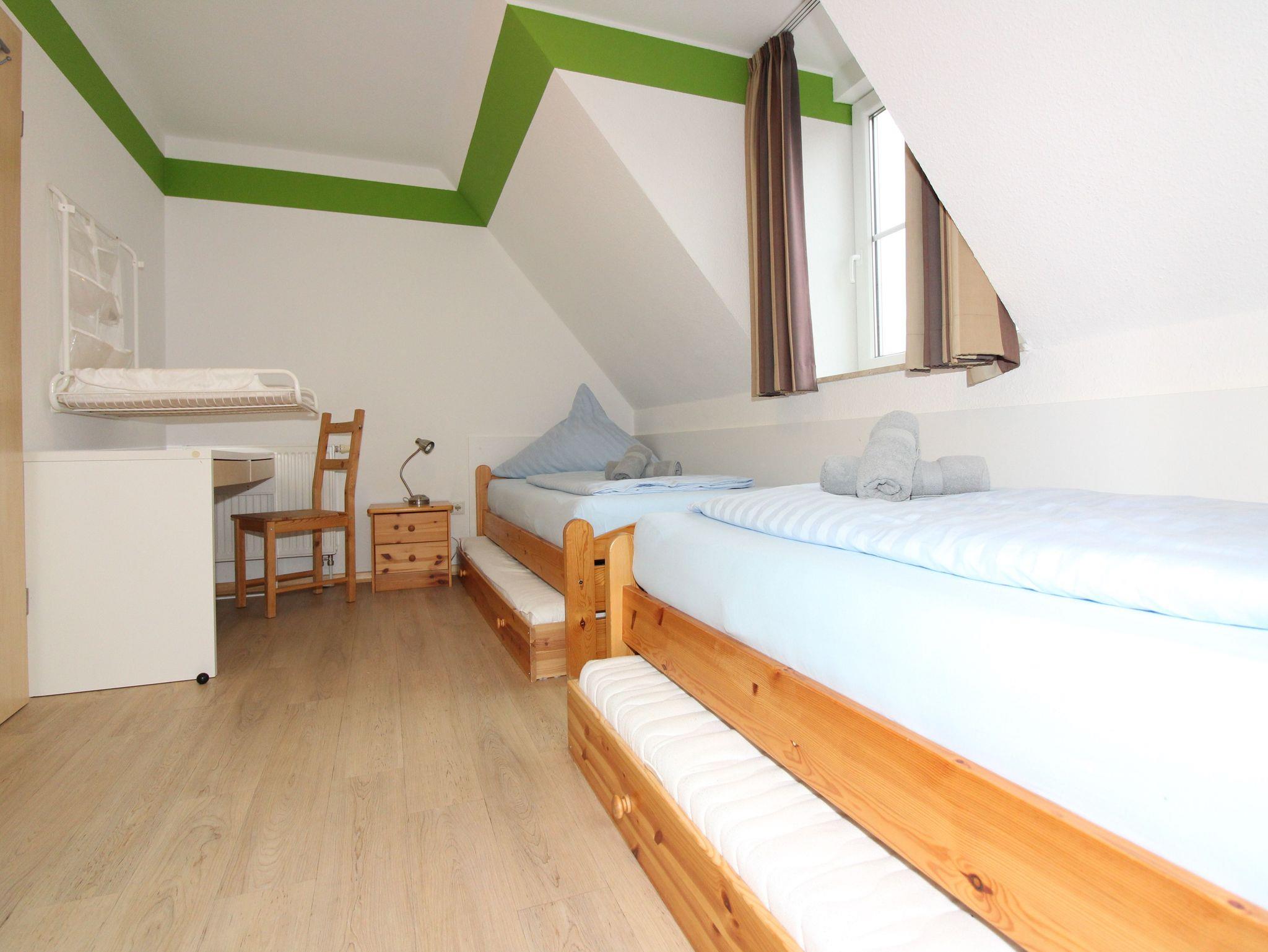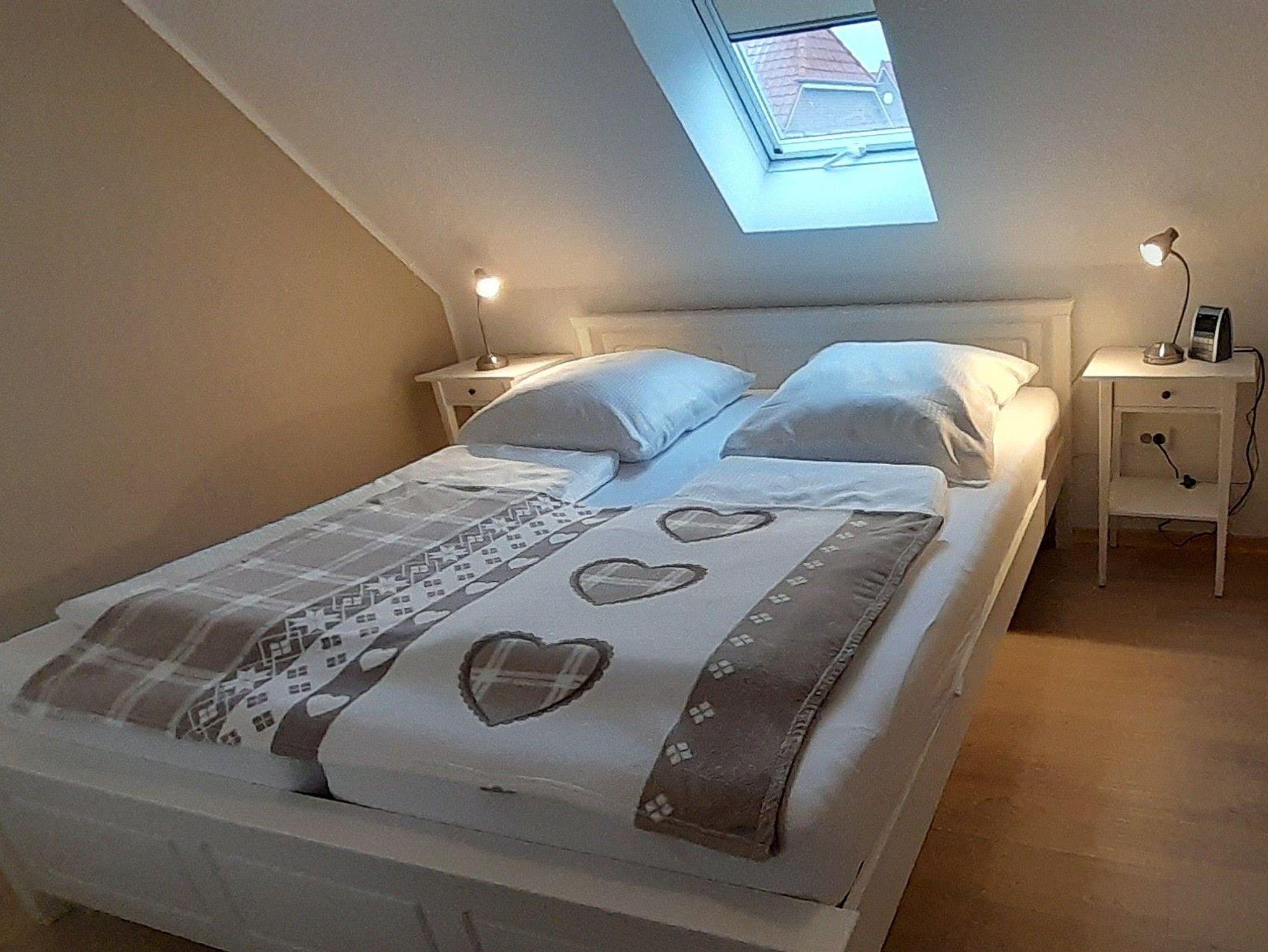 Im Obergeschoss befinden sich: ein Schlafzimmer mit Doppelbett (im Dezember 2025 renoviert), Kabel-TV-Gerät und Radiowecker sowie ein 2. Schlafraum mit zwei Einzelbetten, die jeweils ein Unterschubbett haben, sodass hier problemlos bis zu 5 Personen schlafen können. Beide Zimmer verfügen über viel Stauraum. Neben einem Wickeltisch ist auch ein separates Kinderreisebett „HAUCK“ vorhanden. Sowohl im Erdgeschoss als auch im Obergeschoss befinden sich ein großzügiges Bad mit Dusche und WC und beleuchteten Spiegeln.