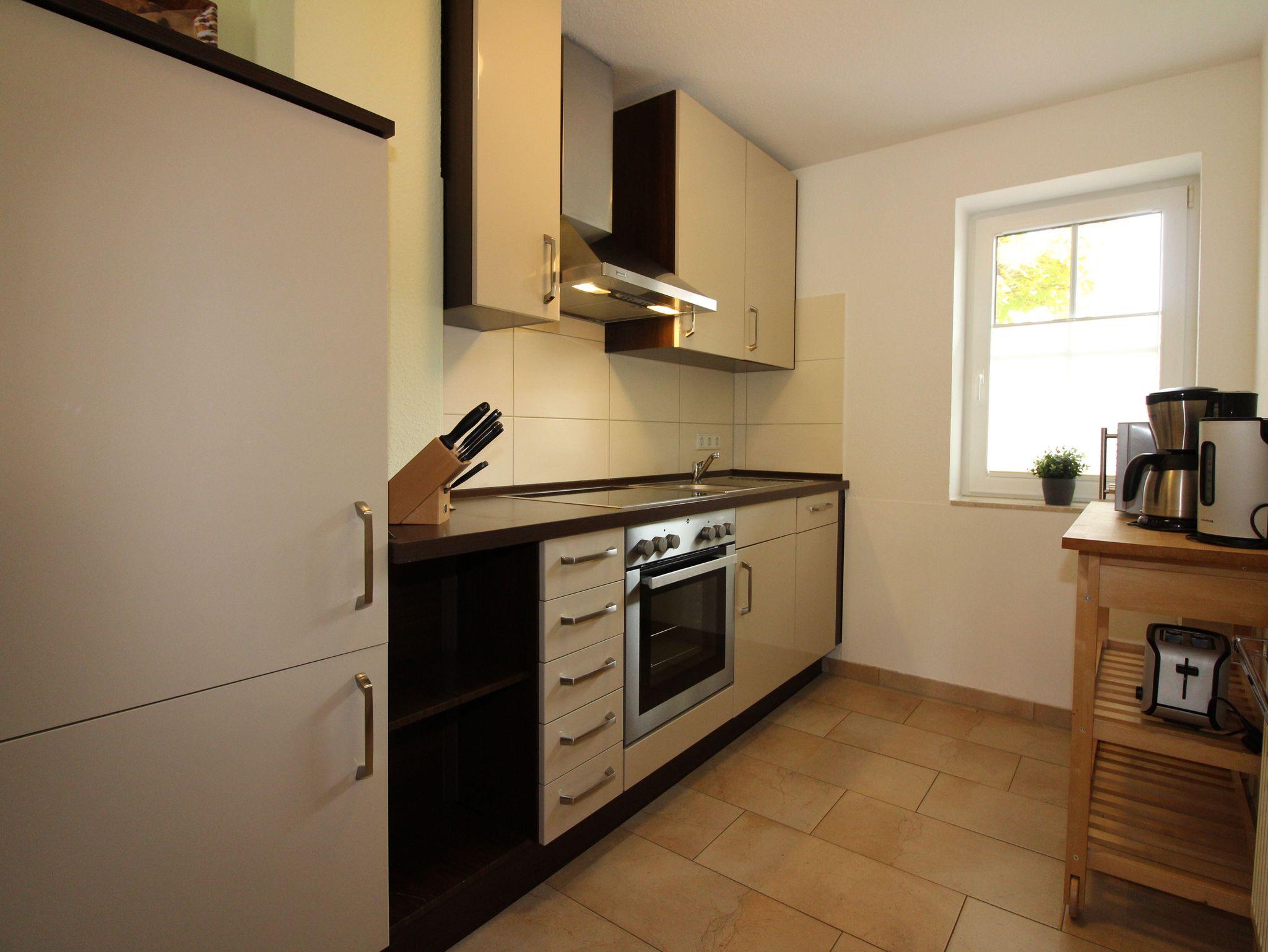 Die vollständig ausgestattete Küche ist mit einem Backofen, Ceranfeld, Mikrowelle, Geschirrspüler, Kühlschrank mit Tiefkühlfach, Kaffeemaschine, Toaster, Wasserkocher, Eierkocher, Mixer und allen notwendigen Utensilien ausgestattet.