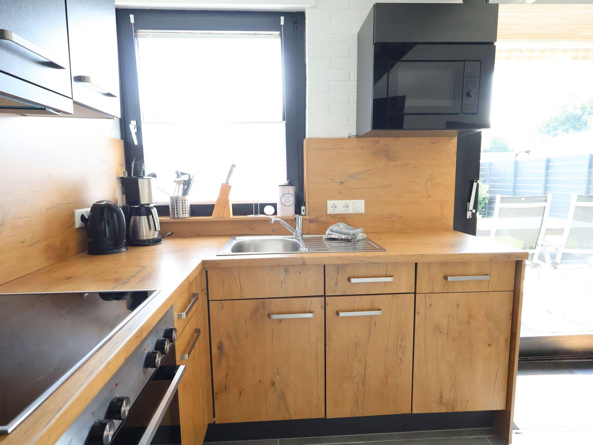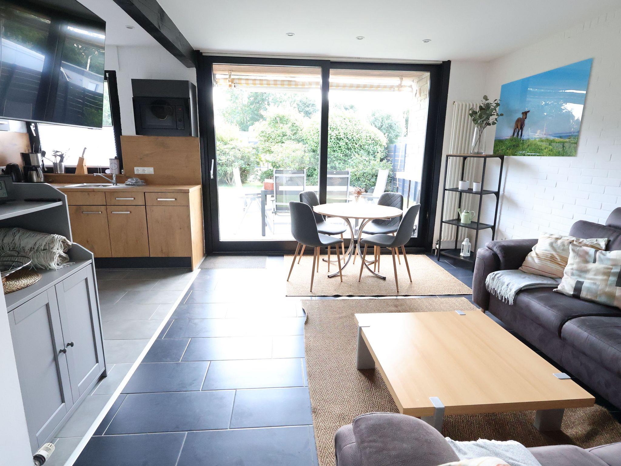 Neben einer gut eingerichteten und neuen Küche mit Geschirrspüler, Kühlschrank mit Eisfach, Ofen, Mikrowelle und Ceranfeld, erwarten Sie zusätzlich ein großer Flachbildfernseher im Wohnbereich, Internetzugang, ein großes Sofa, sowie ein Parkplatz. Eine Zentralheizung erwärmt das gesamte, durchgefließte Haus. Zum Garten hin gelegen ist eine ca. 30 qm² große Terrasse vom Wohnzimmer aus begehbar. Dort stehen neben Sitz- und Liegemöbeln auch ein Grill sowie ein Sonnenschirm im windgeschützten Außenbereich und eine ausfahrbare Markise. Der Garten ist komplett eingezäunt und absolut hundefreundlich.