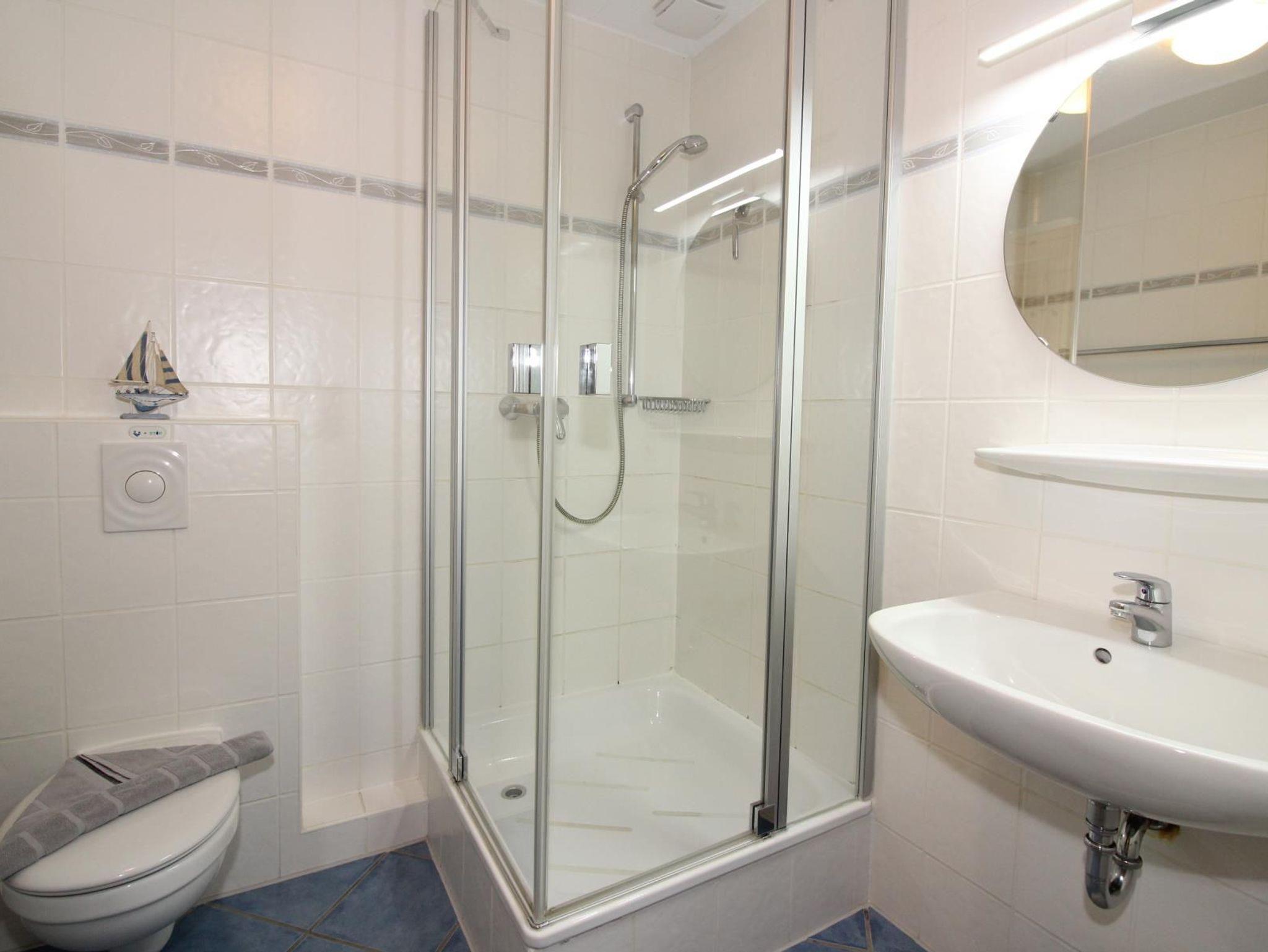 - Bad mit Dusche/WC, Badregal und Fön
