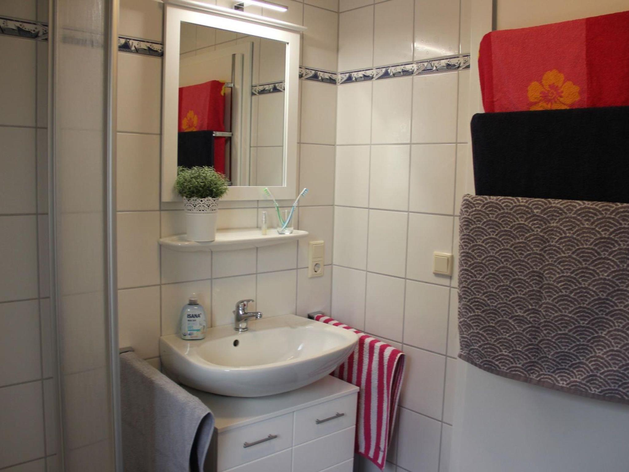Im Obergeschoss befindet sich das Duschbad mit WC und Waschbecken. Im Erdgeschoss befindet sich das zweite Bad mit WC und Waschbecken. Beide Bäder sind mit einem Fön ausgestattet. Zu den Bädern gehören ein Kinderschemel und ein Kinder WC-Sitz.