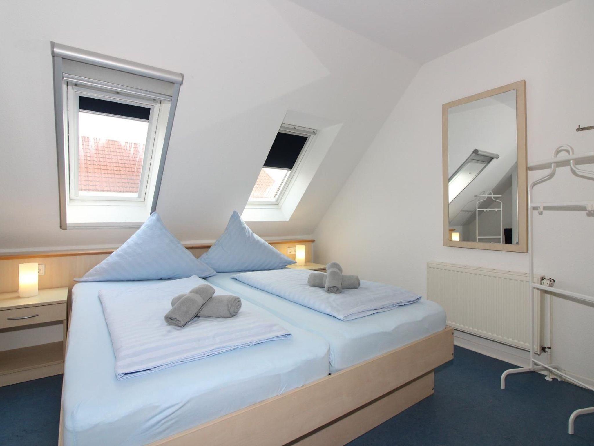 Im Obergeschoss sind zwei Schlafzimmer (eins mit Doppelbett und eins mit zwei Einzelbetten) und das Badezimmer (Dusche mit WC) untergebracht. Das Badezimmer hat ein Fenster (mit Sichtschutzrollo) und die Schlafzimmer haben jeweils Doppelfenster (mit Verdunkelungsrollos).
