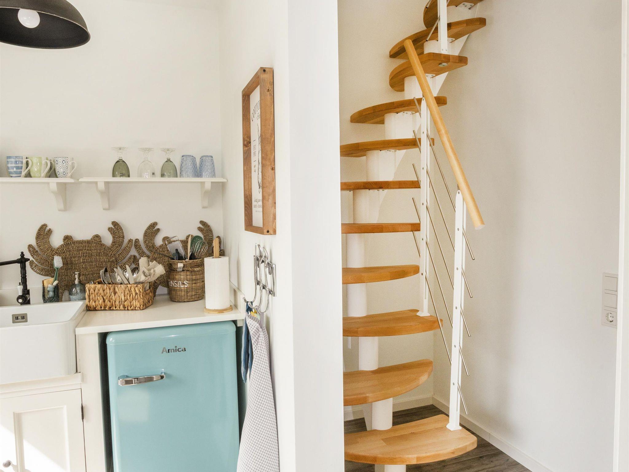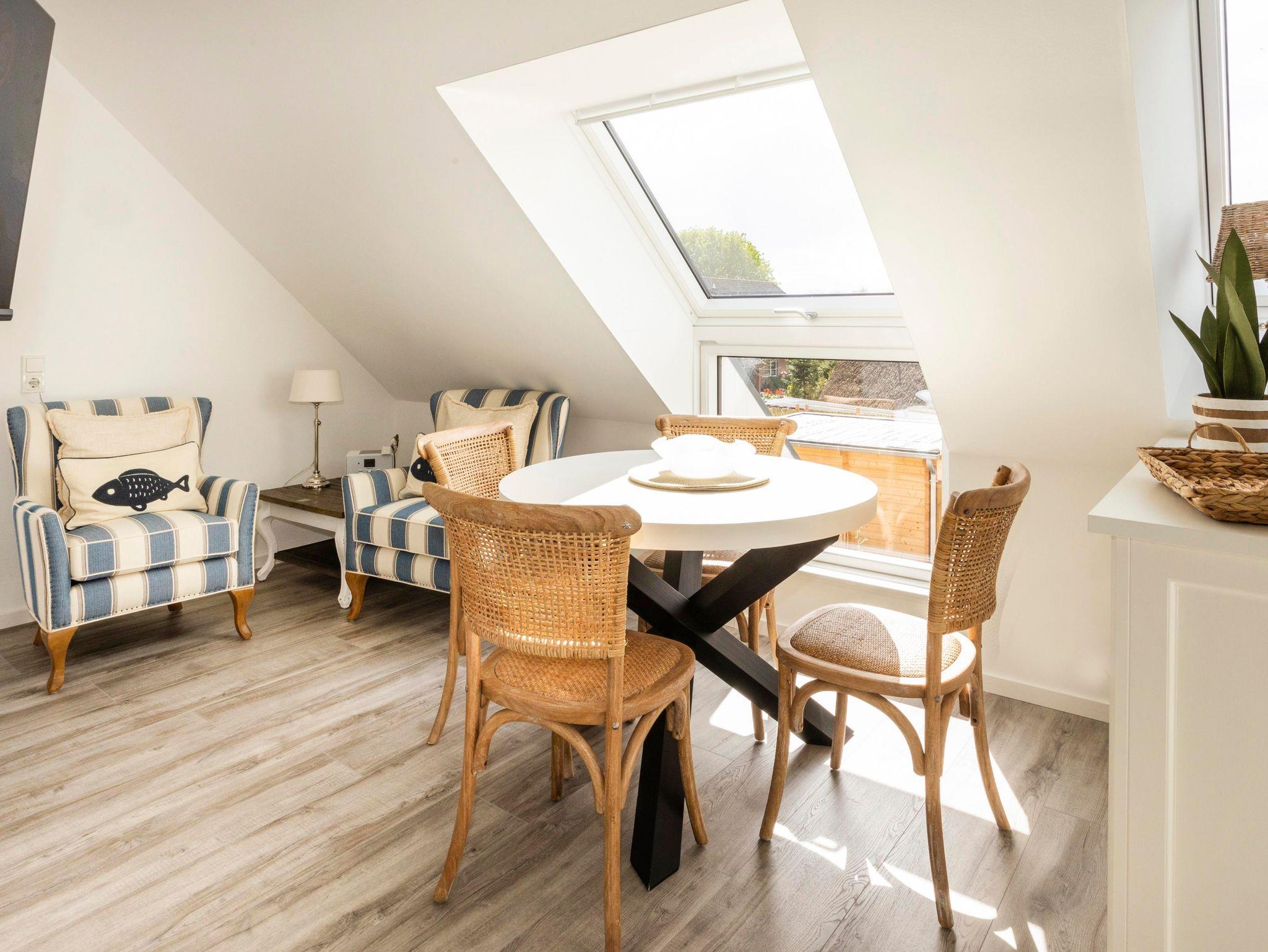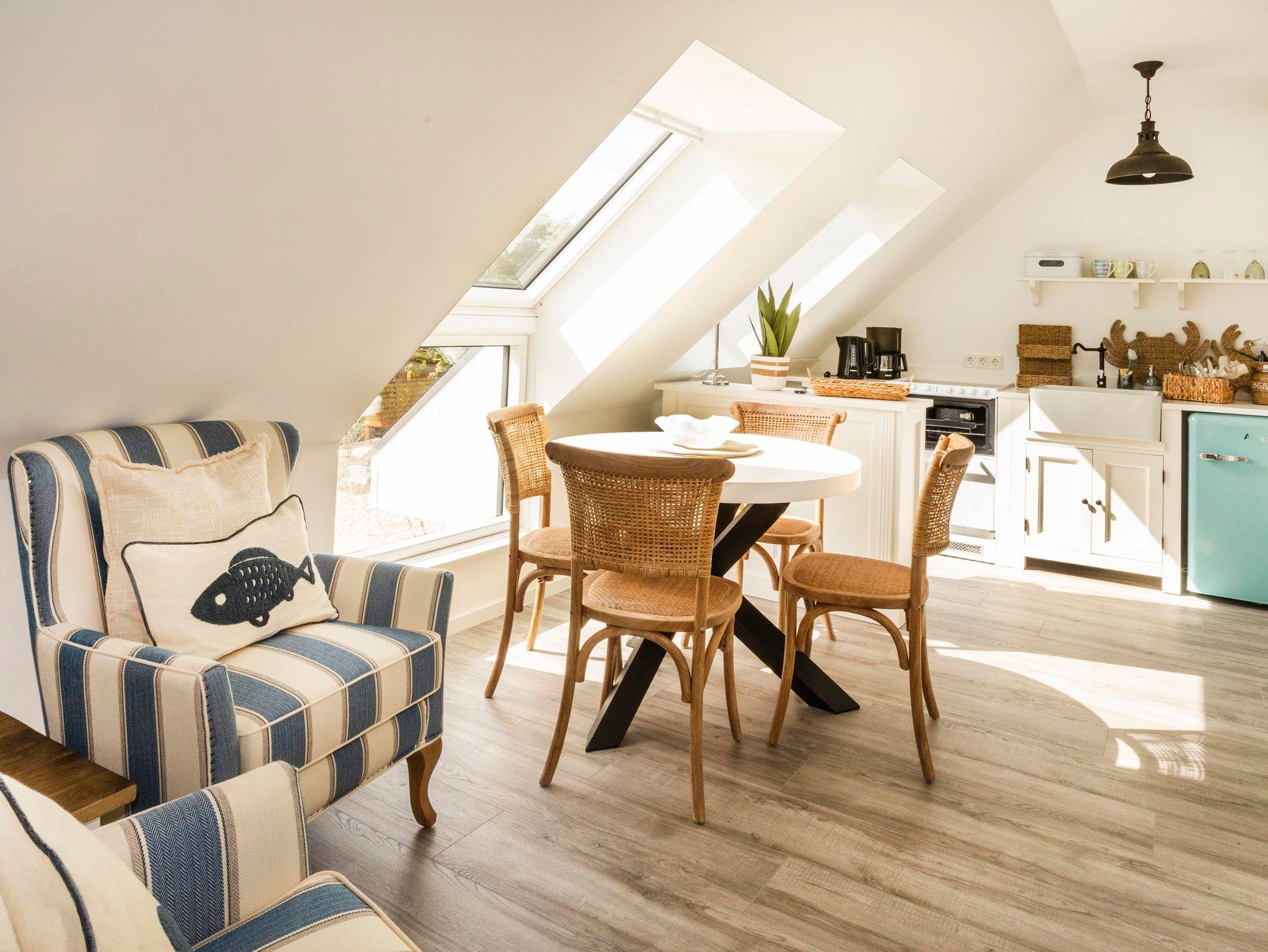 Das Appartement 4 liegt im Ober- und Dachgeschoss und ist perfekt ausgestattet für bis zu 4 Personen, es wurde einfach an alles gedacht. Im Obergeschoss finden Sie den Wohnbereich mit moderner Küchenzeile, ein Schlafzimmer mit Doppelbett sowie das Badezimmer mit Dusche/WC. Über eine Treppe erreichen Sie das zweite Schlafzimmer mit zwei Einzelbetten im Dachgeschoss. Liebevoll sind die Betten bei Anreise bezogen und Handtücher liegen bereit für einen erholsamen Urlaub von Anfang an. Wlan ist im ganzen Haus vorhanden.