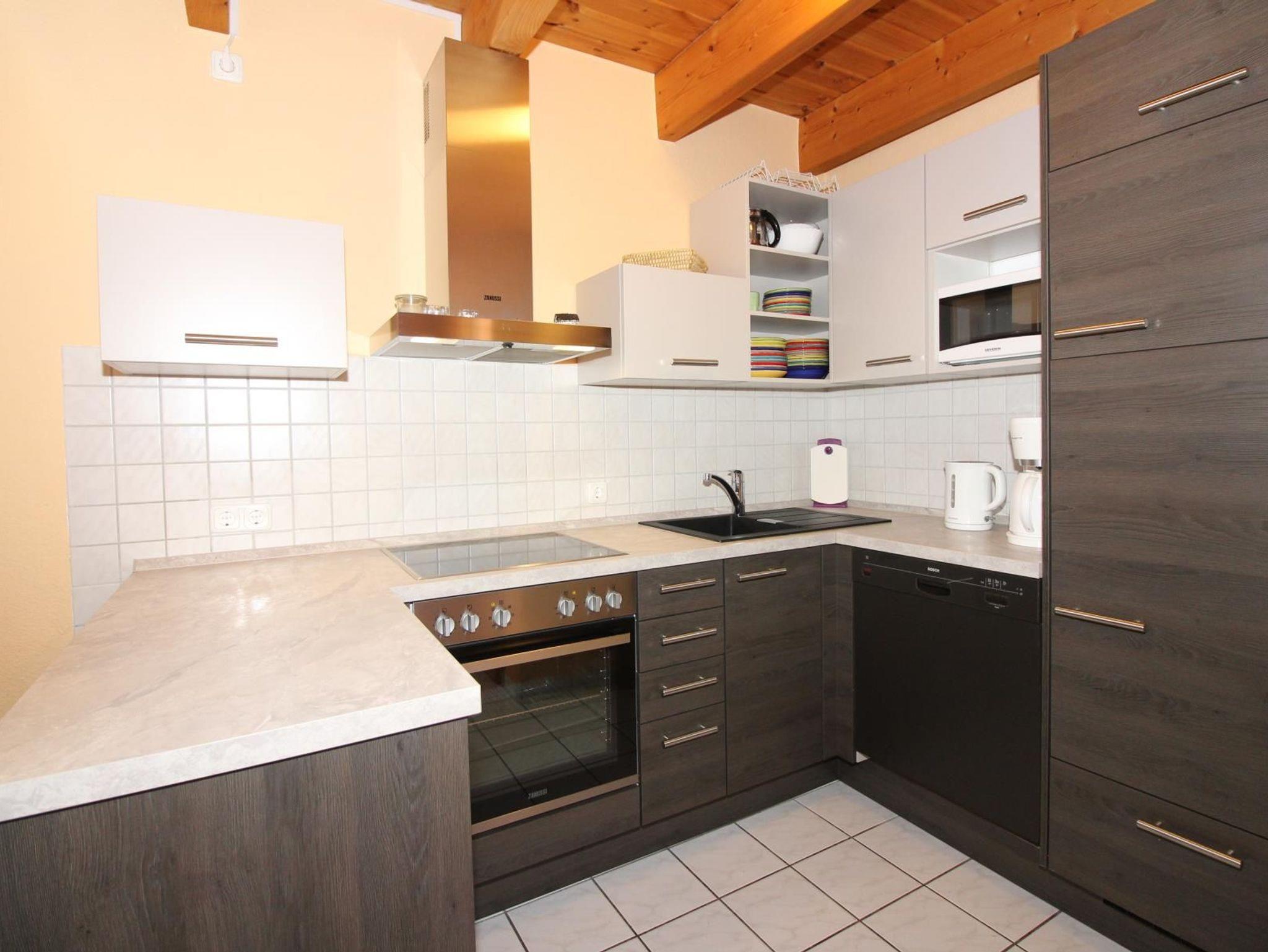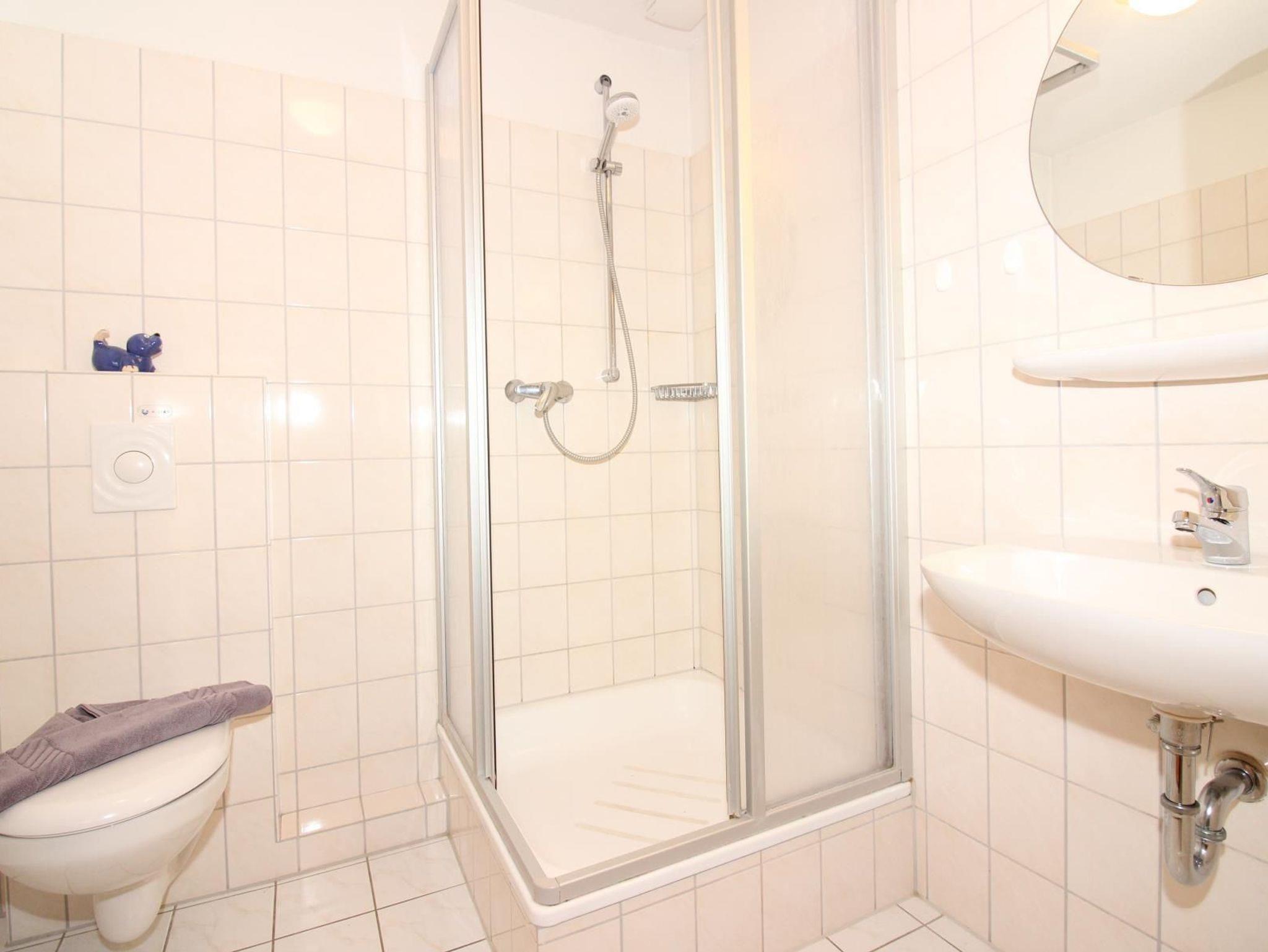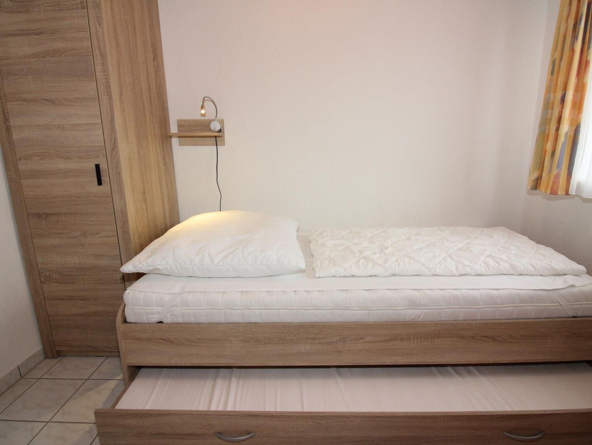 Im Erdgeschoss befindet sich außerdem ein Schlafraum mit einem Bett und die Gästetoilette. Zwei weitere Schlafräume befinden sich im Obergeschoss. In einem Schlafraum steht ein großes Doppelbett, hier befindet sich auch ein zweites Fernsehgerät. Der andere Schlafraum hat zwei Einzelbetten, die bei Bedarf auch seitlich ausgezogen werden können, um zusätzliche Schlafmöglichkeiten zu schaffen. Das Bad mit Dusche liegt ebenfalls im Obergeschoss.