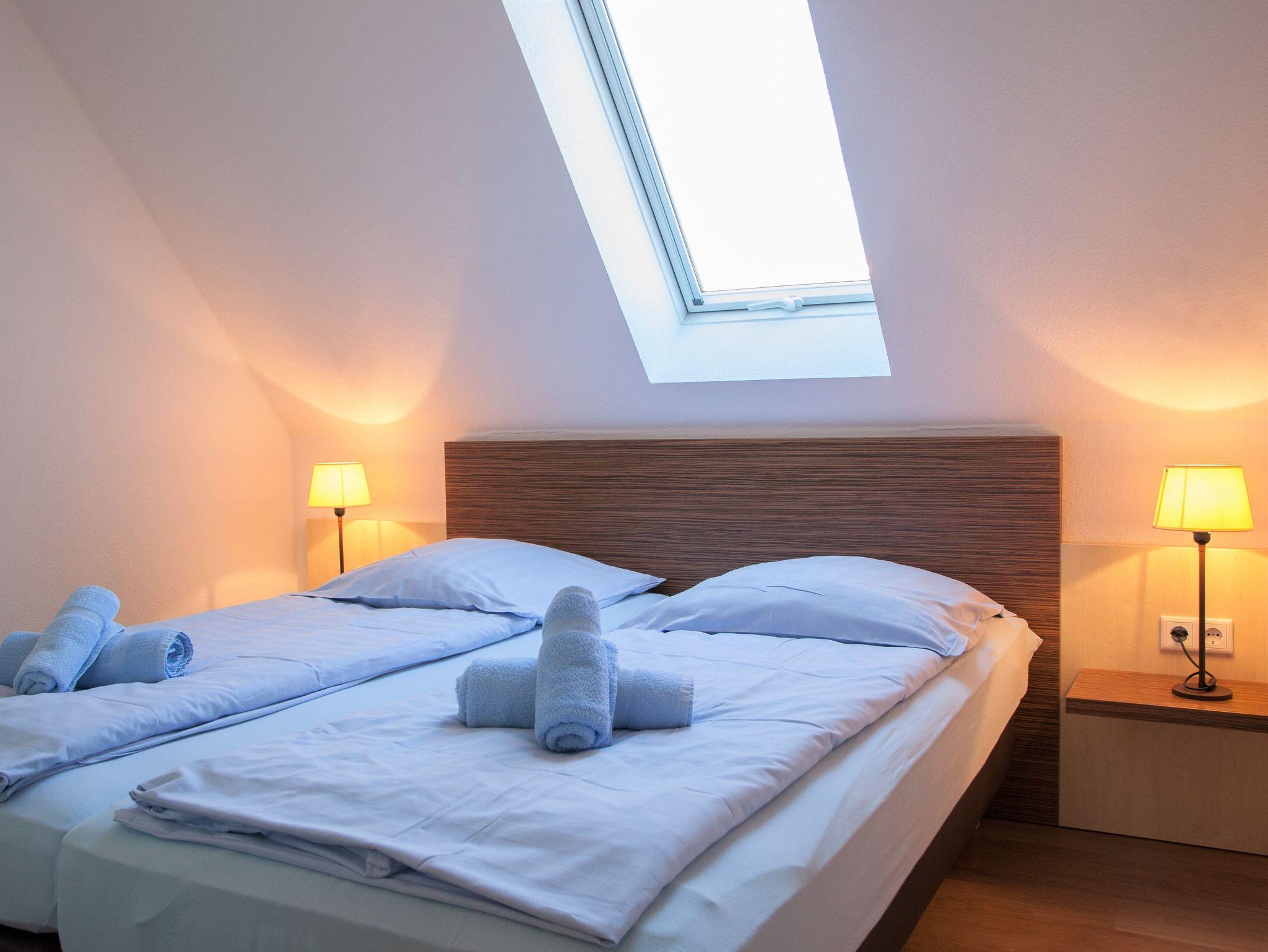 Helles Dachgeschoß mit separat zu schließender Tür, 1 Doppelbett (auch trennbar), LCD Fernseher Kabel-TV.