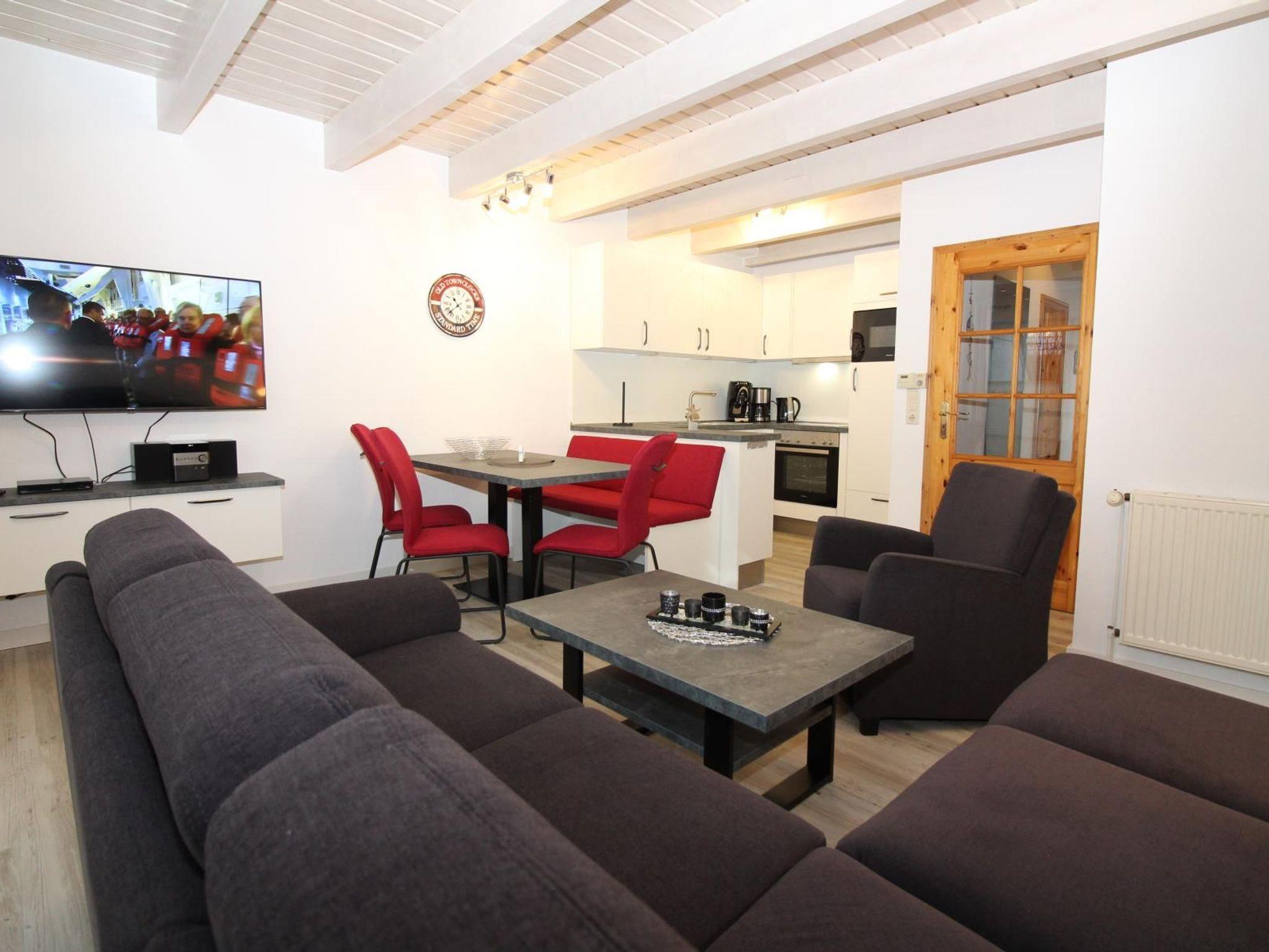 - komplett ausgestattete Küche mit Backofen, Geschirrspüler, Mikrowelle, Kaffeemaschine, Wasserkocher, Eierkocher, Toaster, Kühlschrank mit Tiefkühlfach, ausreichend Geschirr und Gläser sowie Kindergeschirr für unsere kleinen Gäste. Außerdem steht eine Tchibo Cafissimo-Maschine zur Verfügung.