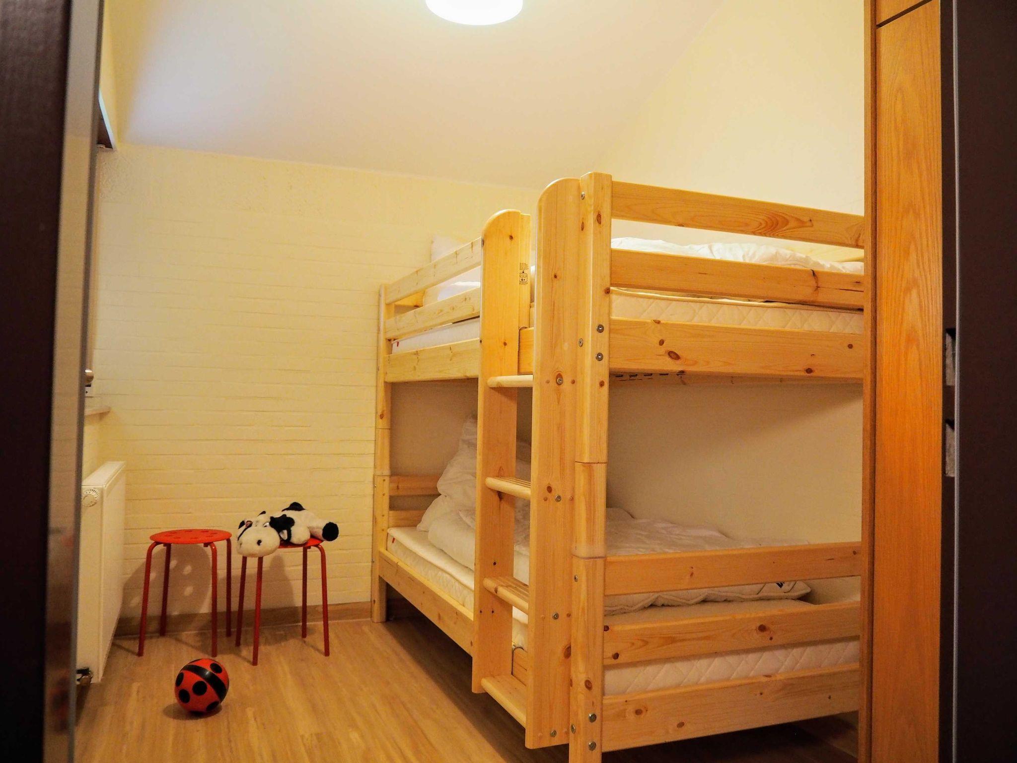 Ein Schlafzimmer mit Doppelbett (1,80 x 2 m), Nachtschränkchen und Kleiderschrank, ein Schlafzimmer mit Etagenbett und Kleiderschrank.