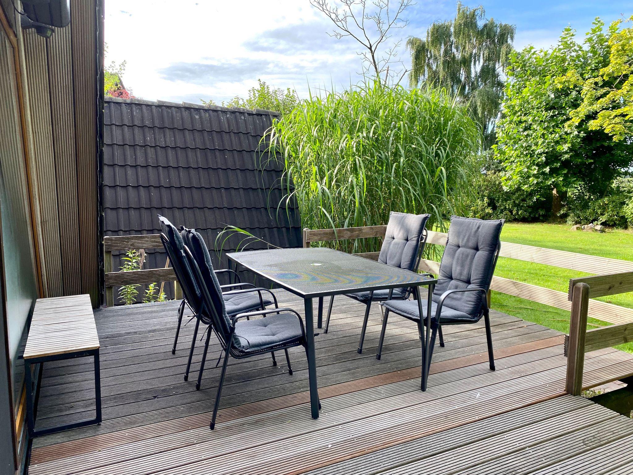 Das Nurdachhaus verfügt über eine große Terrasse mit einer Markise und Terrassenmöbeln,