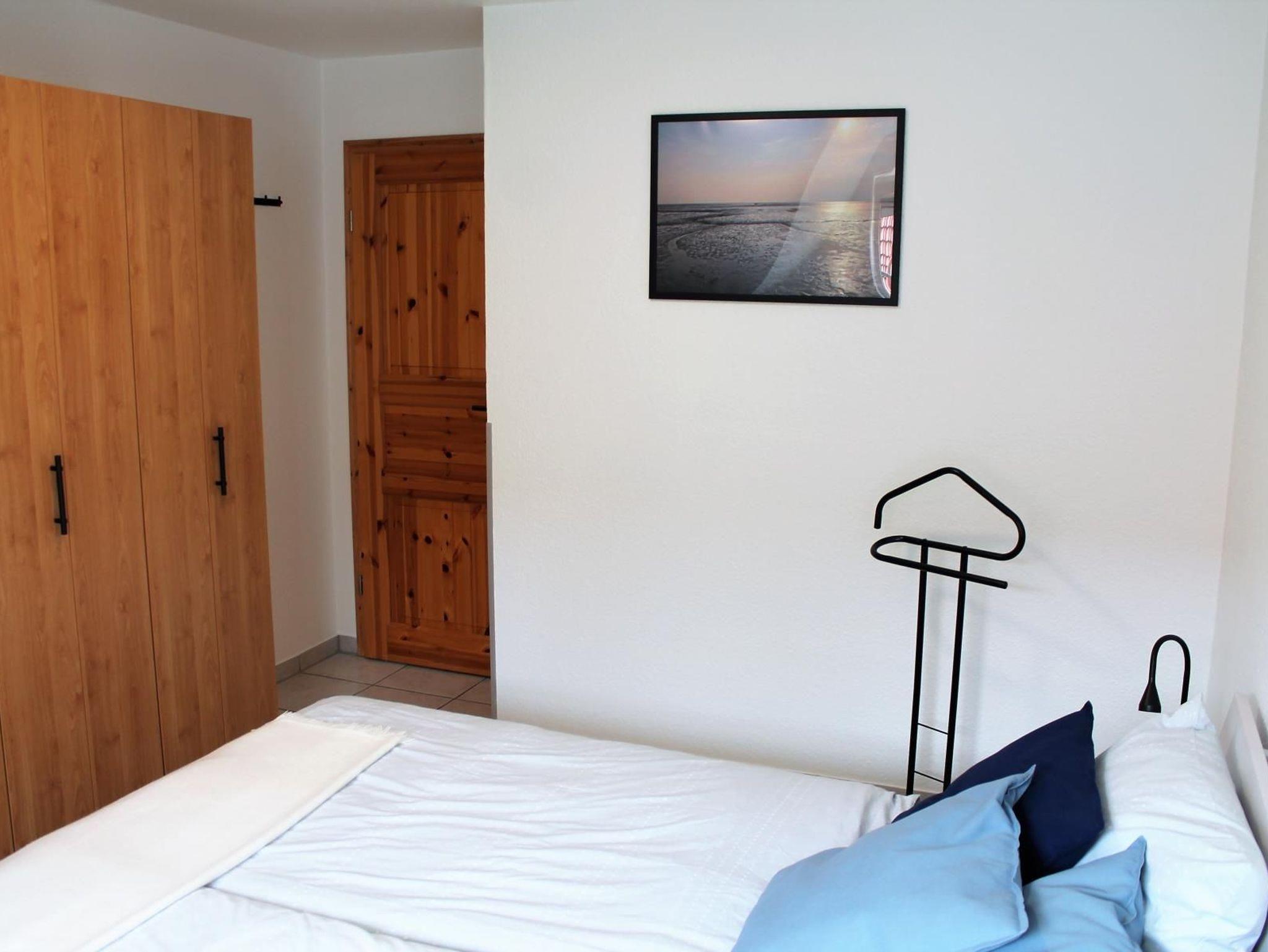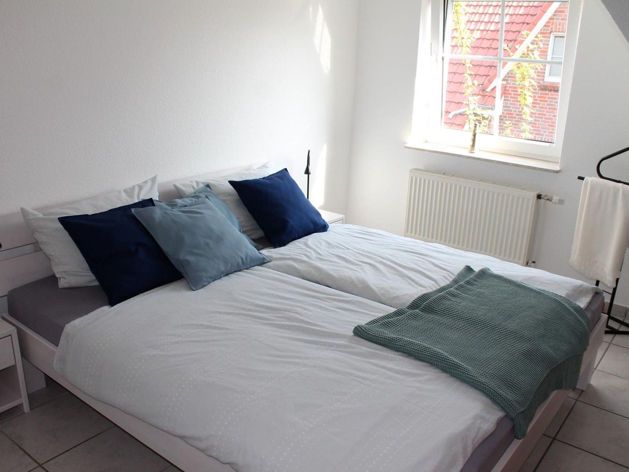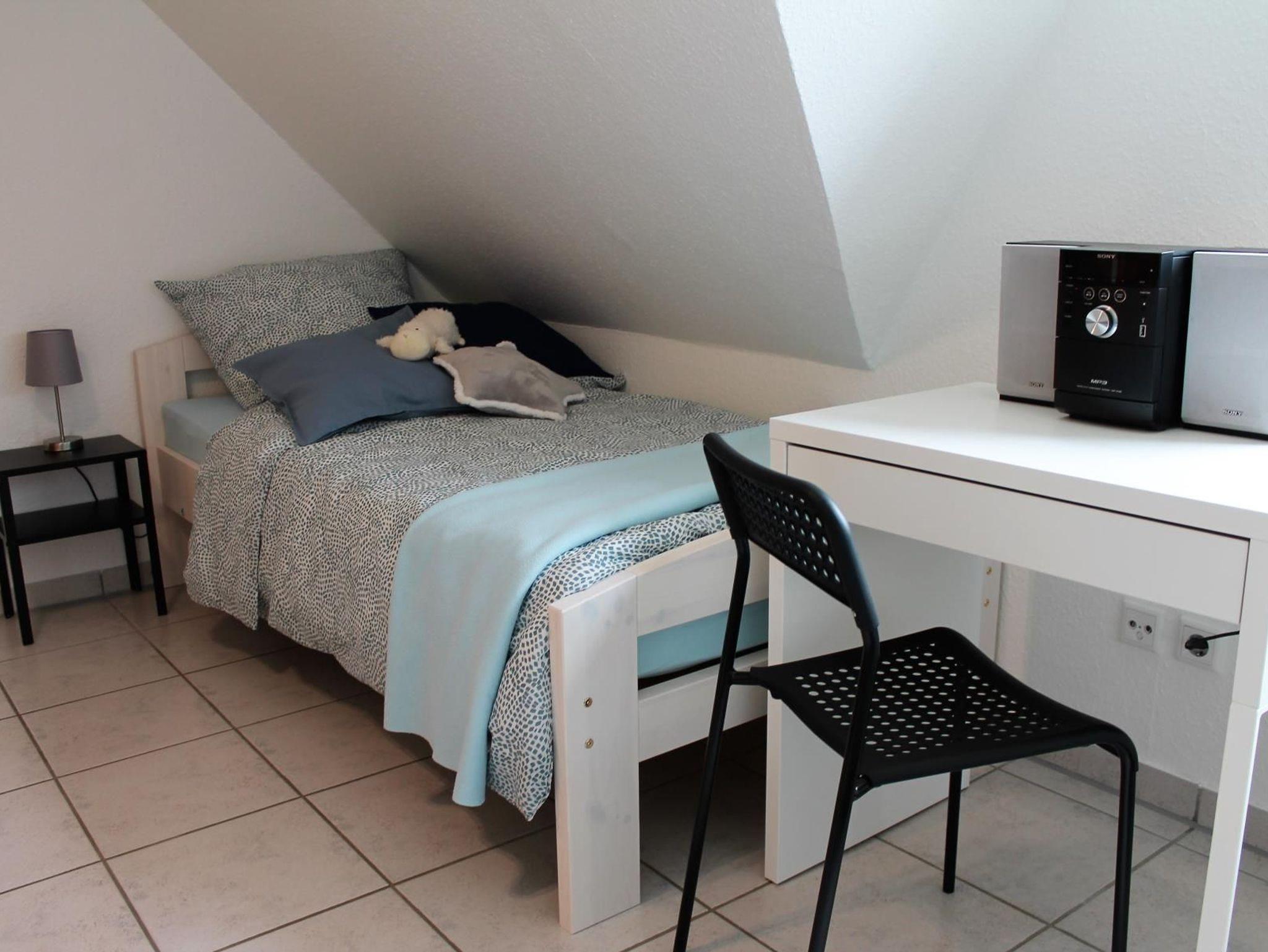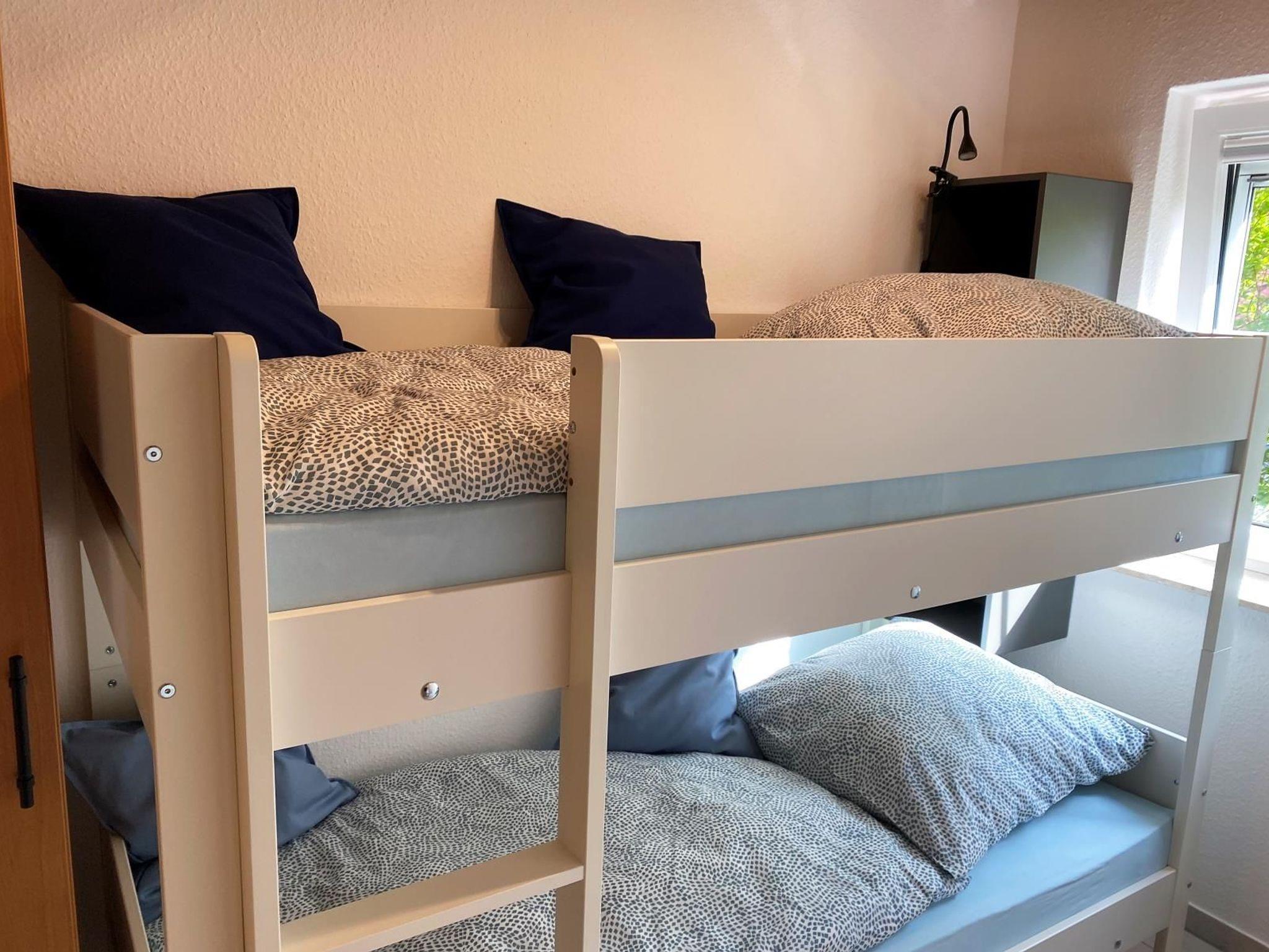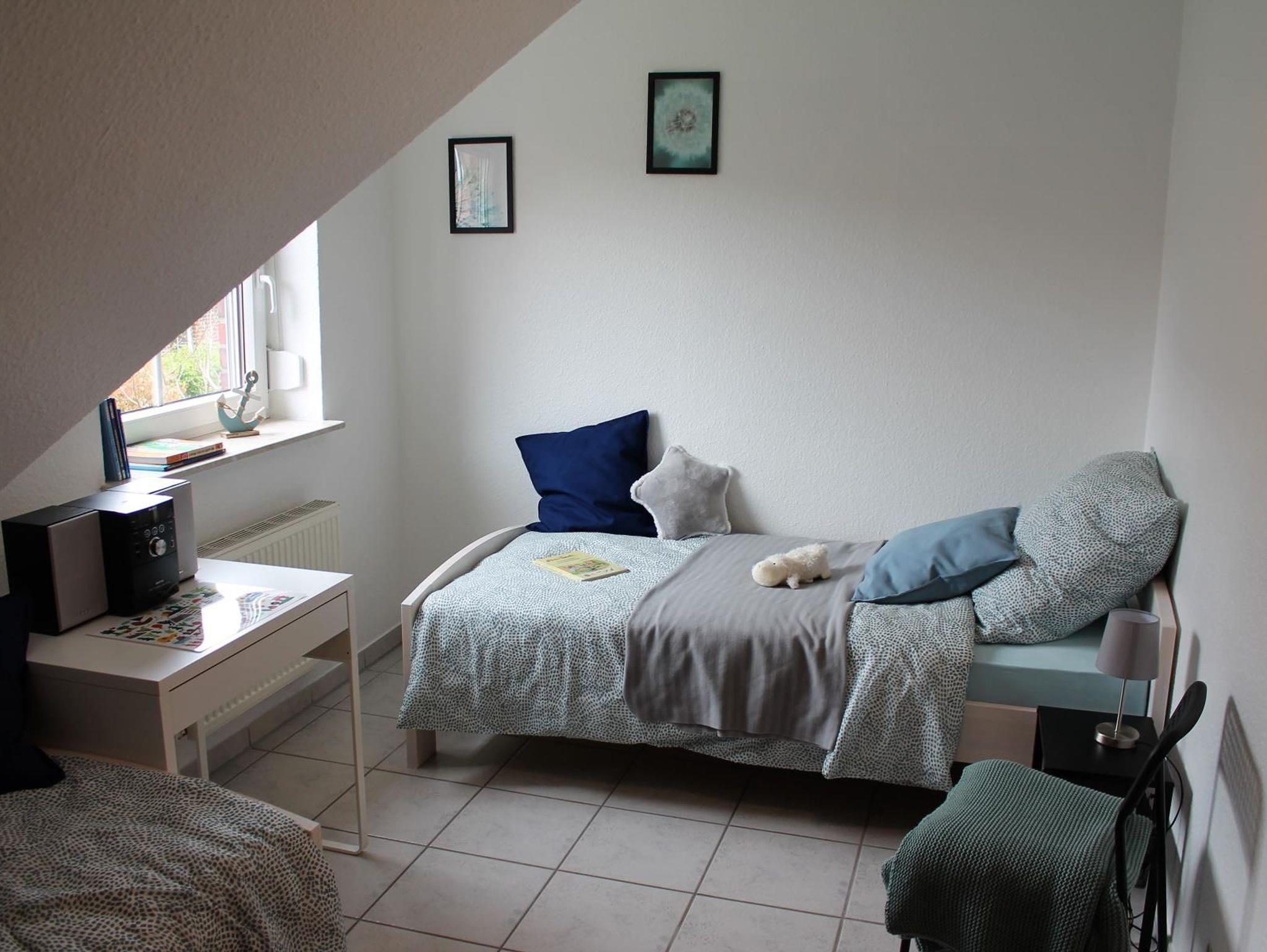 Im Obergeschoss haben wir ein Schlafzimmer mit Doppelbett (180 cm x 200 cm) und weiterem Flachbildbild-TV (32 Zoll) sowie ein Schlafzimmer mit zwei Einzelbetten (90 cm x 200 cm).