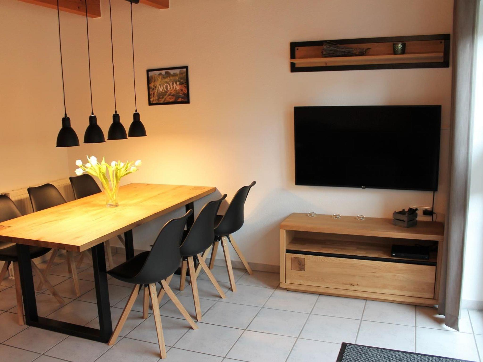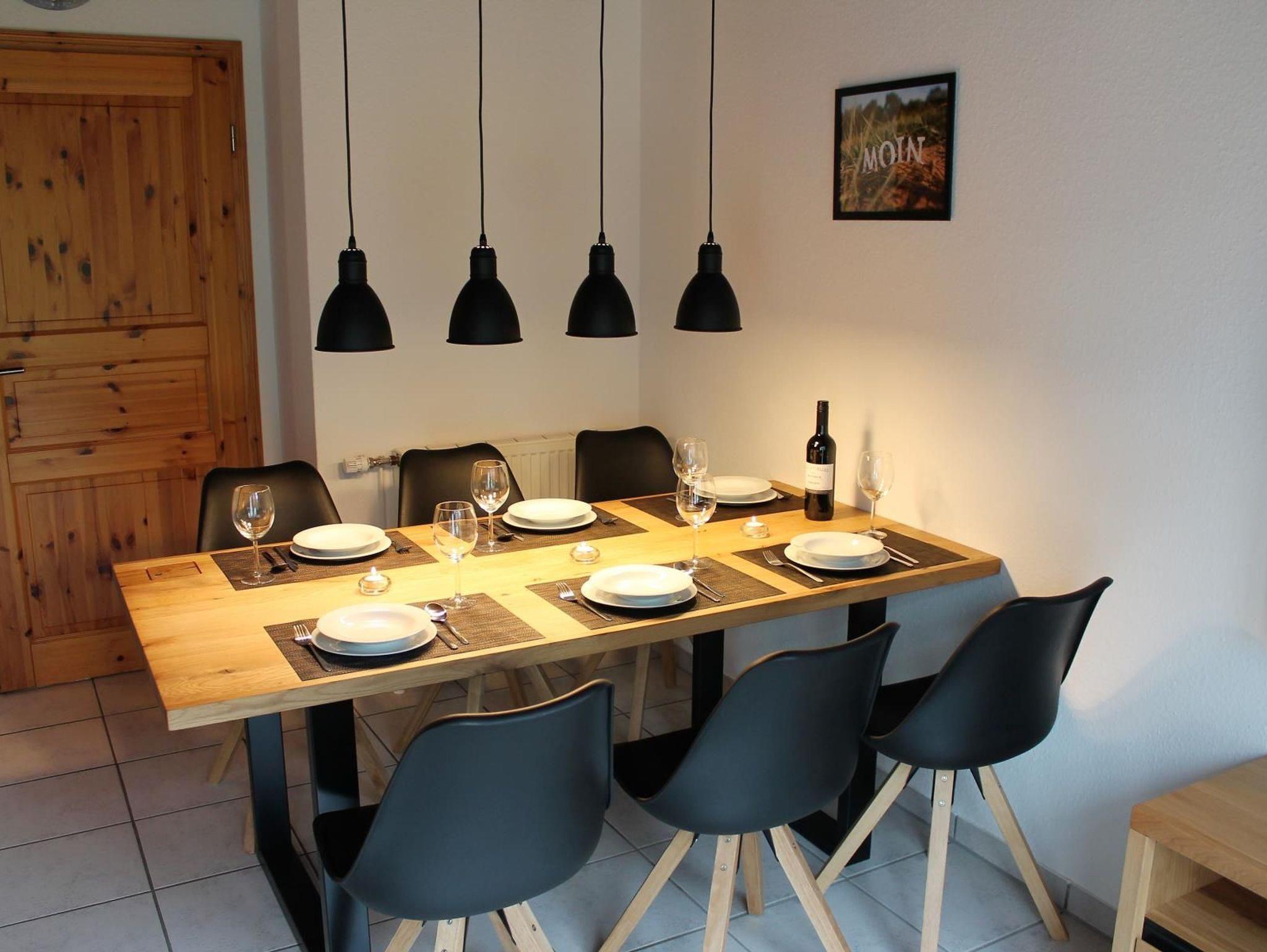 Im Wohnzimmer mit Essbereich erwarten Sie ein gemütliches Sofa, Sessel und Couchtisch. Ein großer Flachbild-TV (49 Zoll) und ein Blu-Ray-Player sorgen für Ihre Unterhaltung. Zum gemeinsamen Essen und Trinken lädt der große Esstisch mit sechs Stühlen ein.