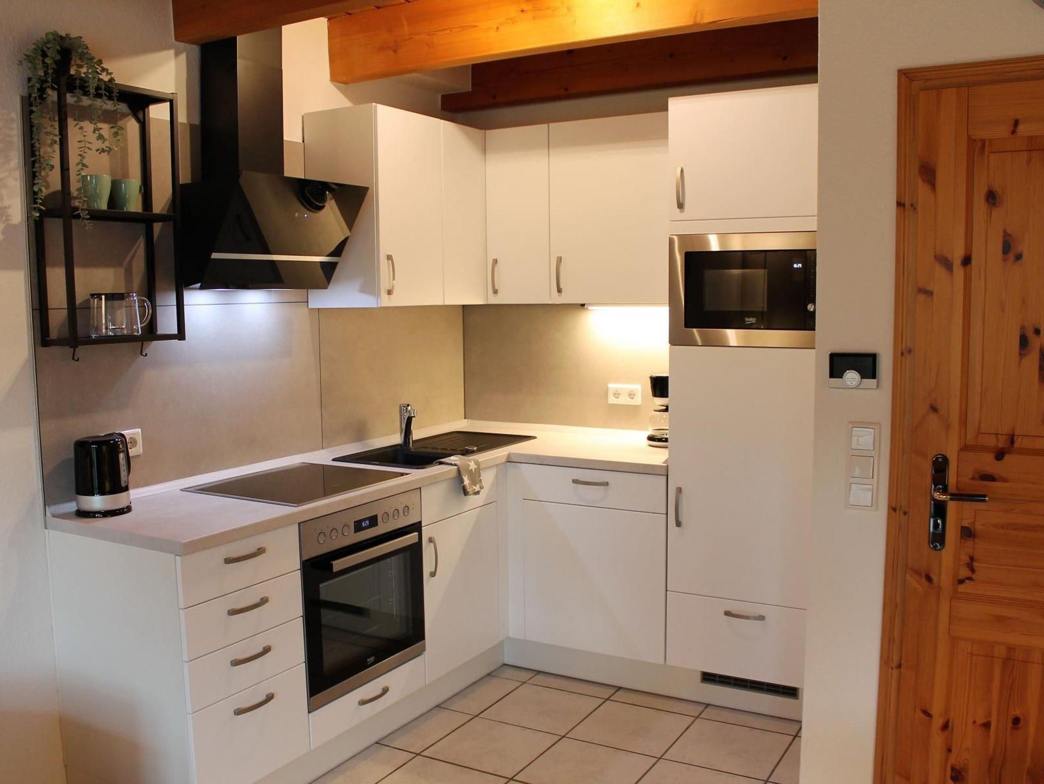 Die offene Küche ist mit allem ausgestattet, was Sie als Selbstversorger erwarten können. Ceranfeld, Backofen, Geschirrspüler, Mikrowelle, Kühlschrank mit Gefrierfach usw. Und natürlich ausreichend Geschirr, Besteck und viel weiteres Küchenzubehör (Kaffeemaschine, Wasserkocher, Toaster, Eierkocher, digitale Küchenwaage etc.). Hier macht das gemeinsame Kochen wirklich Spaß.