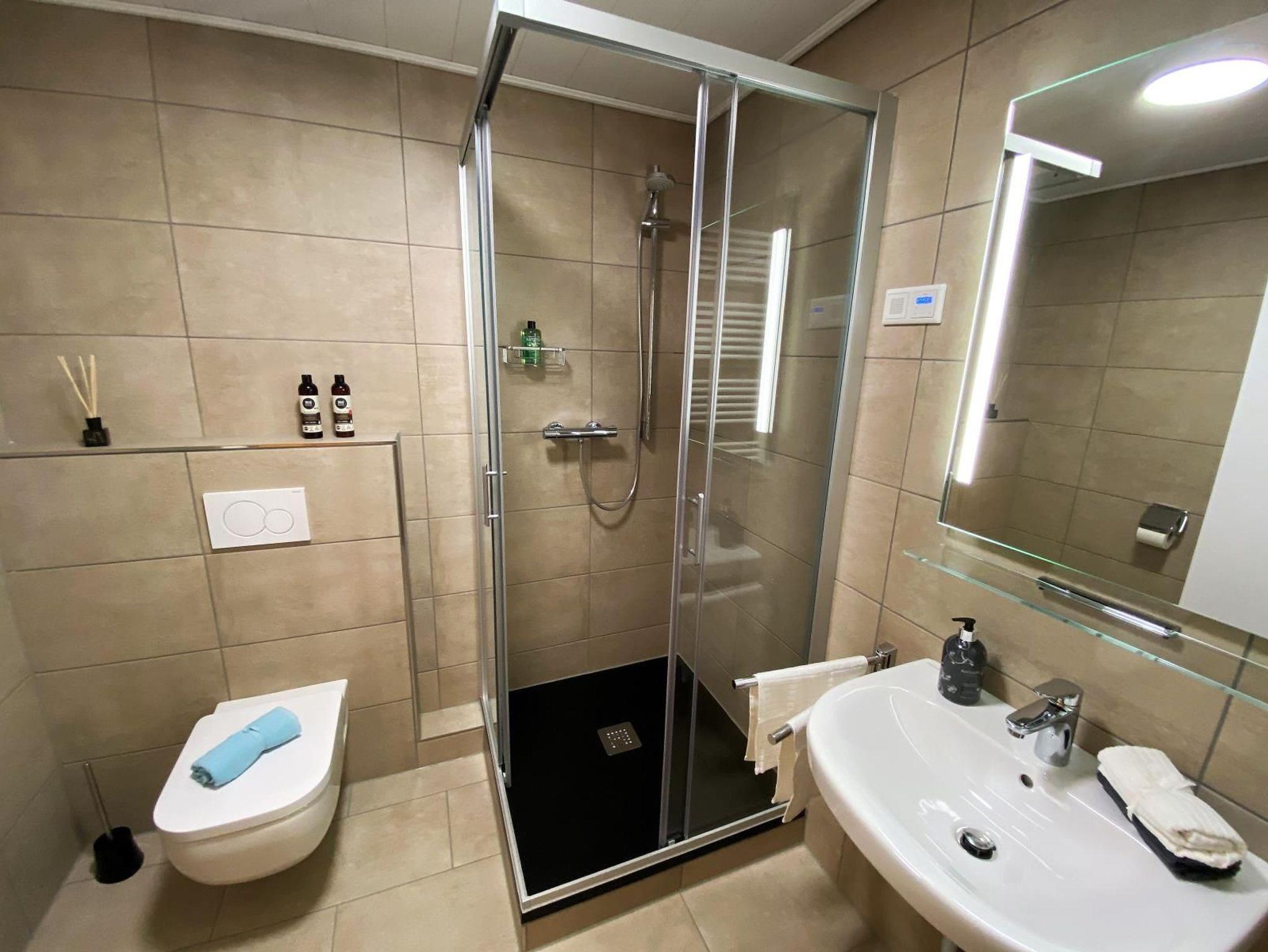 Im Bad im Obergeschoss ist tatsächlich kein Stein auf dem anderen geblieben: Wand- und Bodenfliesen, die Decke, die Lampen, Handtuchheizkörper, Duschwanne (90 cm x 90 cm), Duschtrennwand (Echtglas), Armaturen, Waschtisch, Spiegel, WC-Becken, Badschrank, Einbauradio und Föhn!