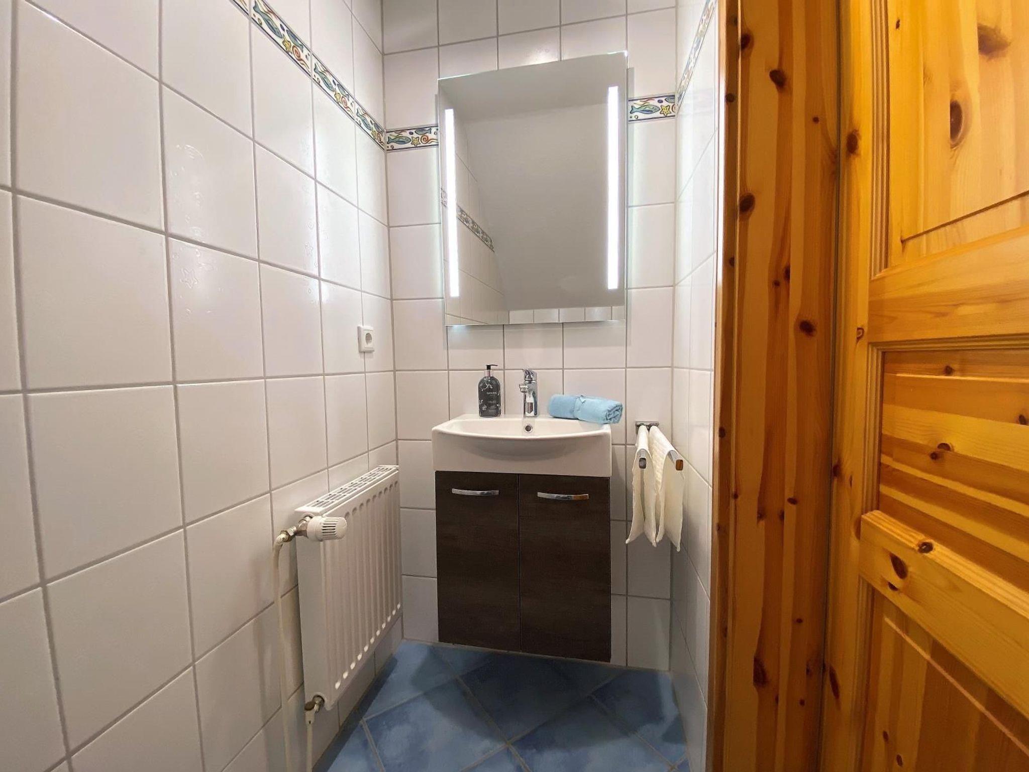 Weiter gibt es im Erdgeschoss ein Schlafzimmer mit Etagenbett (90 cm x 200 cm) und ein extra Gäste-WC mit Handwaschbecken und schickem Unterschrank, der viel Platz bietet. Der Abstellraum gleich an der Haustür ist u.a. mit Safe, Reinigungsutensilien, Bügelbrett und Bügeleisen ausgestattet.