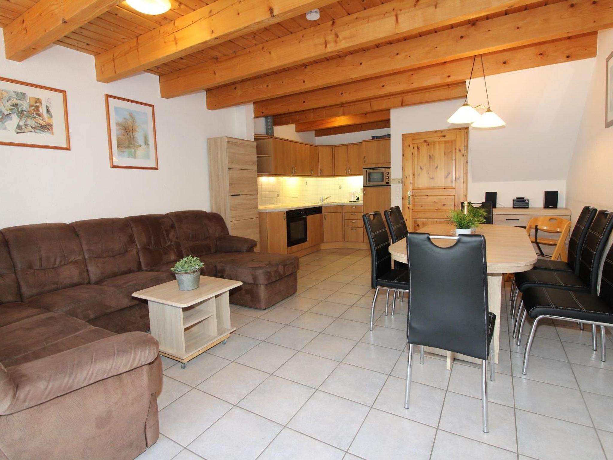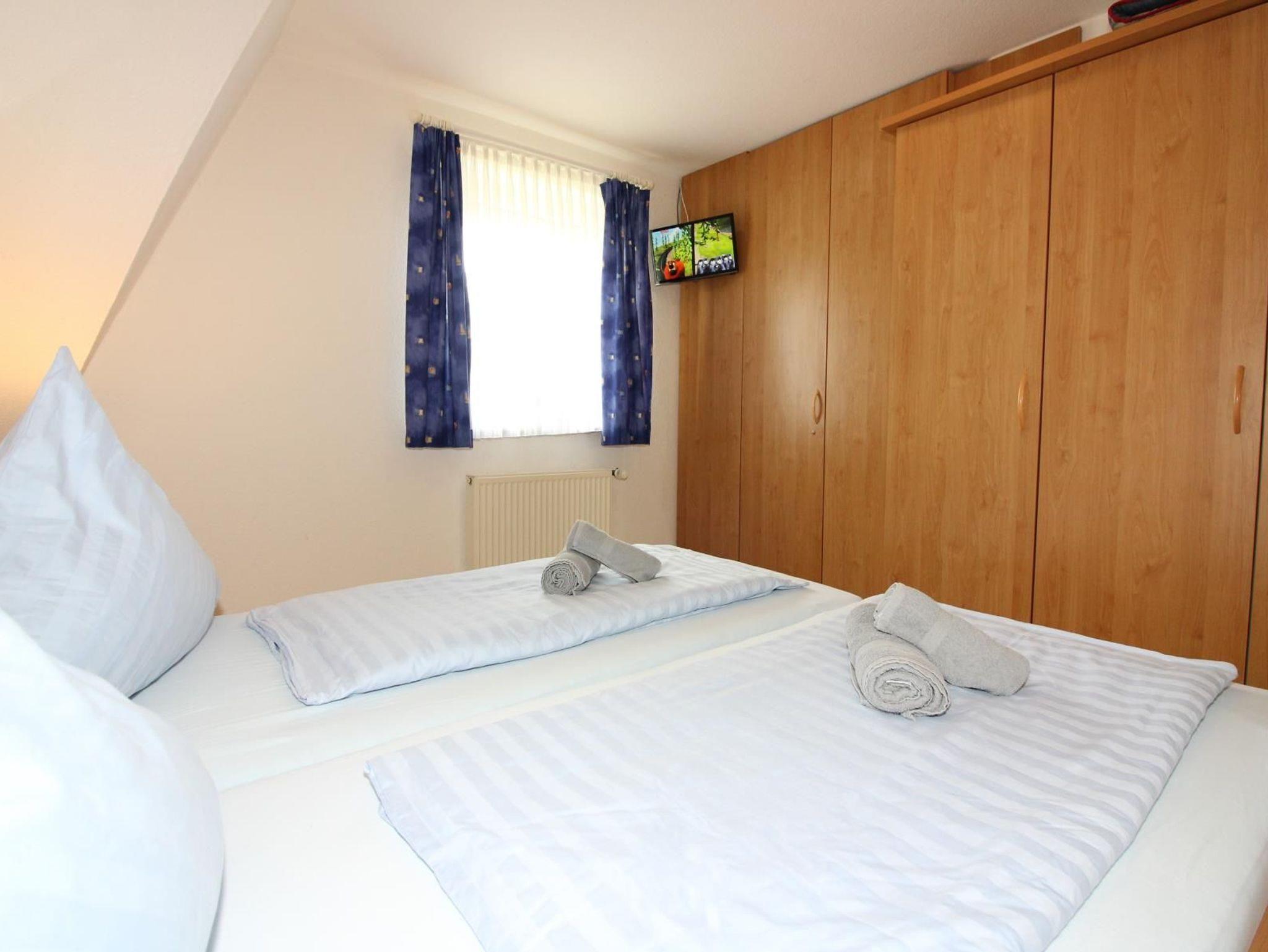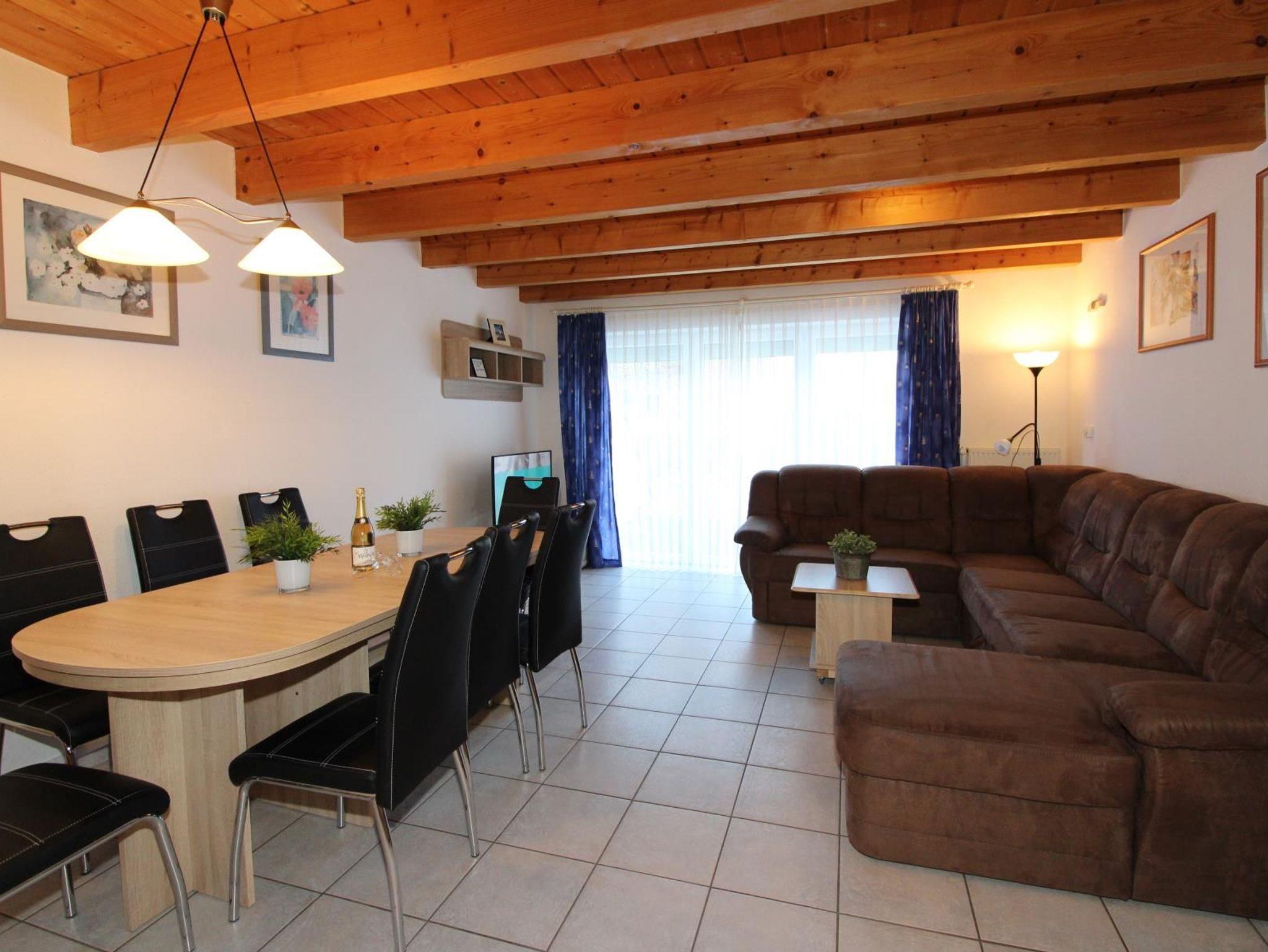 Sie wohnen in einem ruhig gelegenen Mittelhaus für bis zu 8 Personen. Das Ferienhaus verfügt über eine Wohnfläche von ca. 80 m² und drei Schlafzimmern. Ein Schlafzimmer mit Doppelbett, ein Schlafzimmer mit getrennten Betten, zusätzlich im Spitzboden zwei Einzelbetten. Wohn-/Schlafraum mit bequemer Doppelbettcouch, separater Essplatz, Kabel-TV, Stereoanlage, Telefon-Anschluss, voll ausgestattete Einbauküche mit Mikrowelle und Geschirrspüler, Dusche/ WC im Erd- und Obergeschoss, Terrasse. Der Autostellplatz liegt nur wenige Meter entfernt.