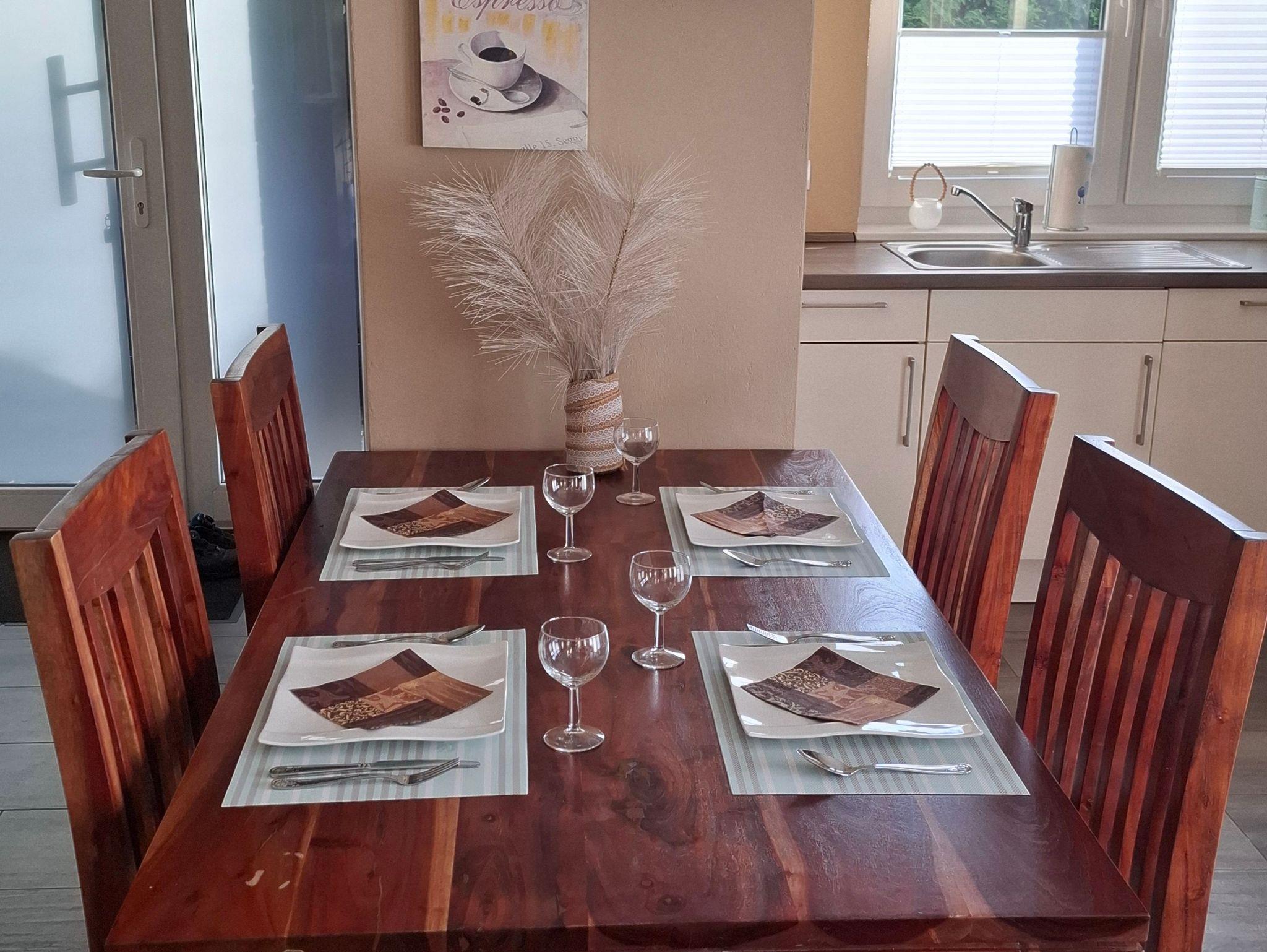 Der Essbereich ist mit einer Einbauküche und einem großen Esstisch ausgestattet und im Wohnbereich ist