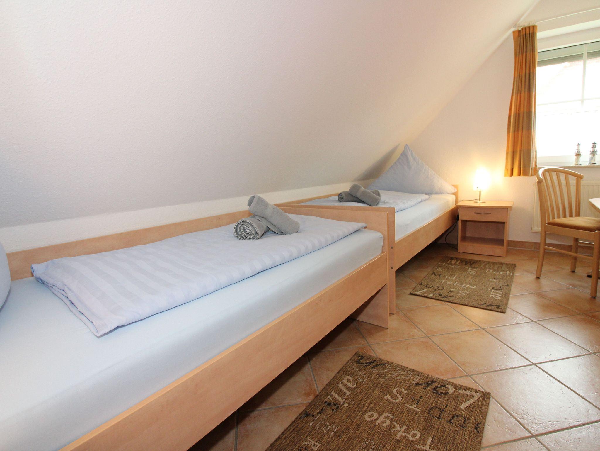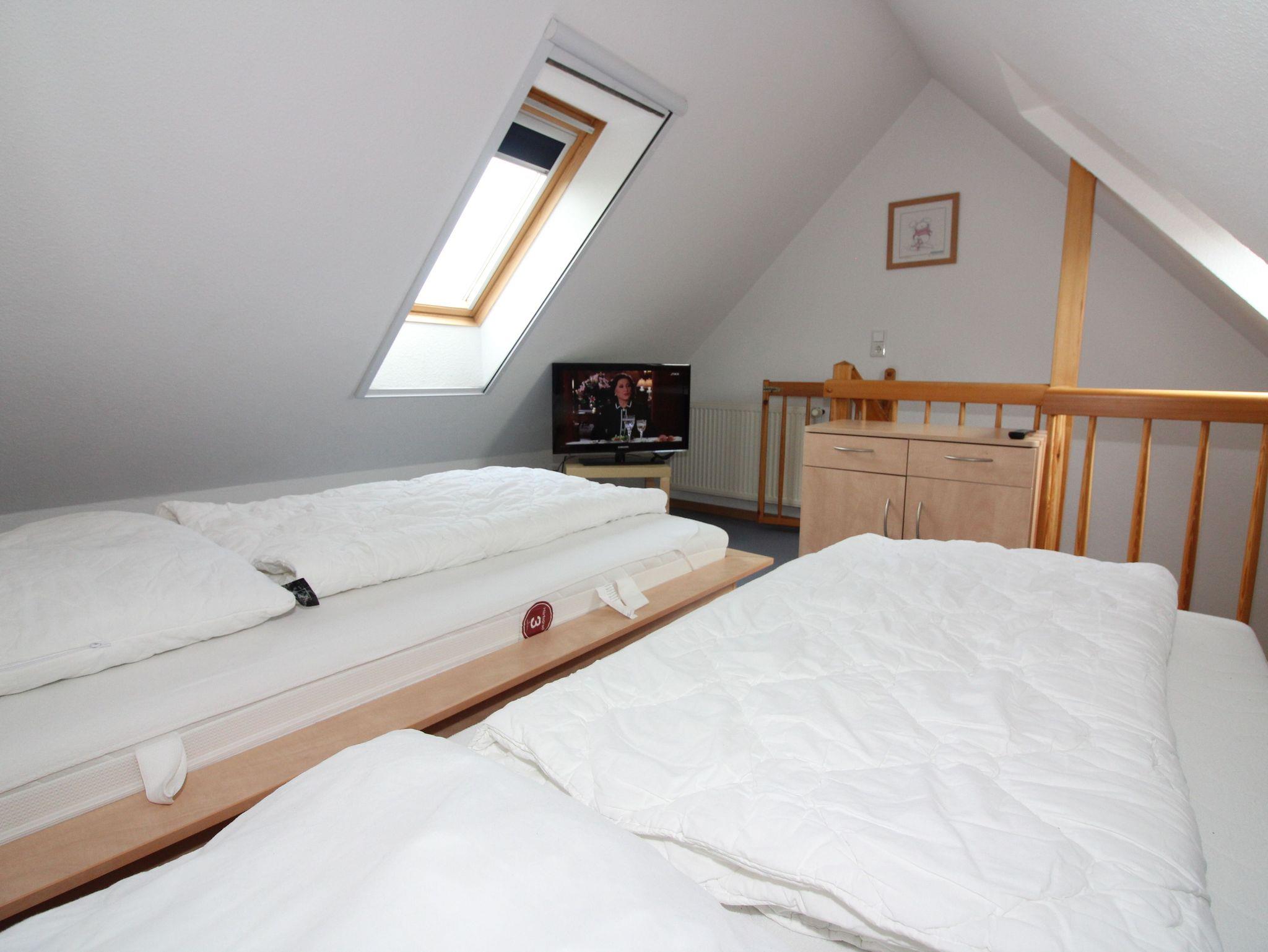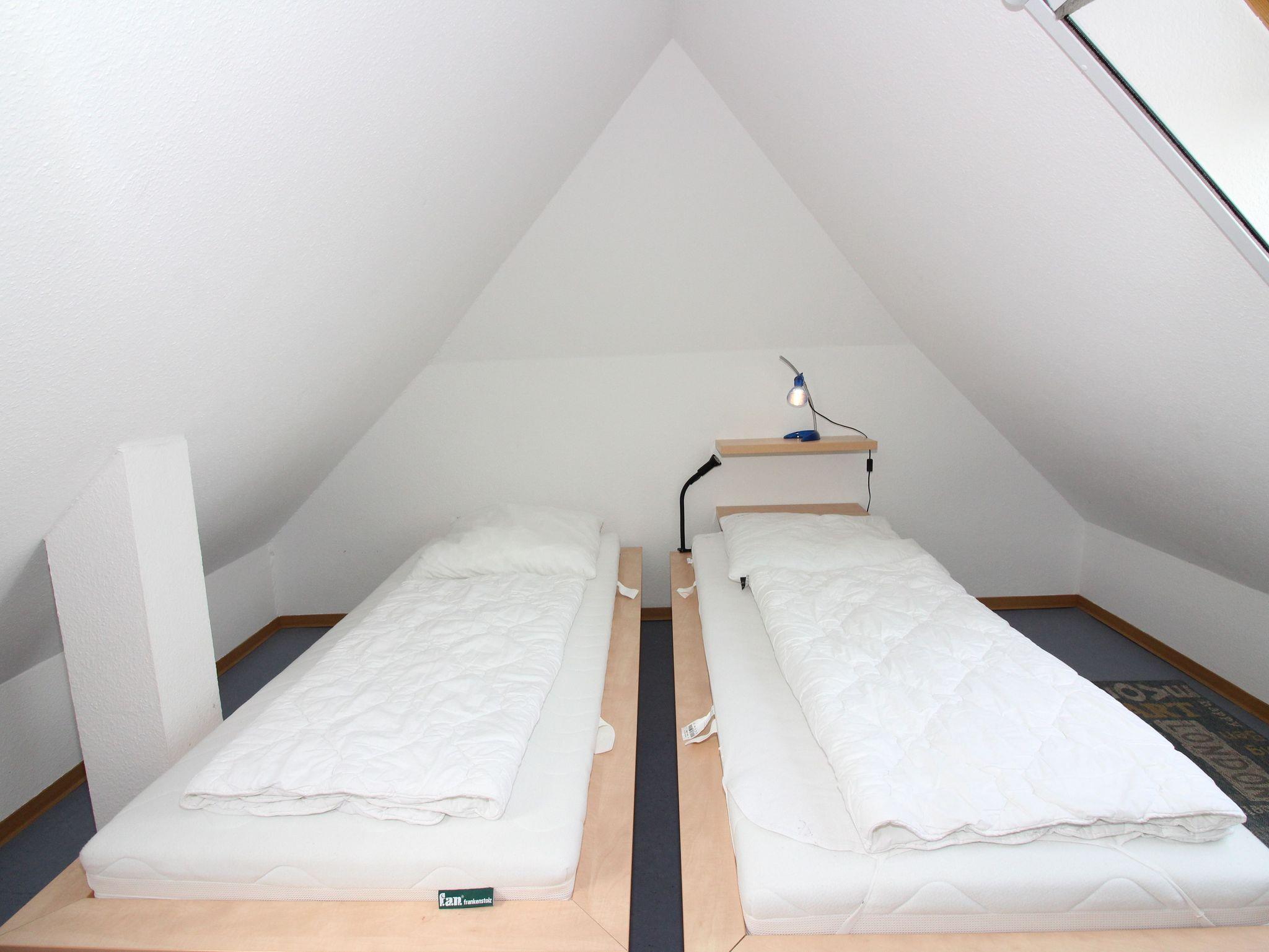 einSchlafraum mit zwei Einzelbetten im Dachgeschoss - sehr gemütlich für Kinder auch als Spielzimmer geeignet (mit Blick direkt zum Deich).